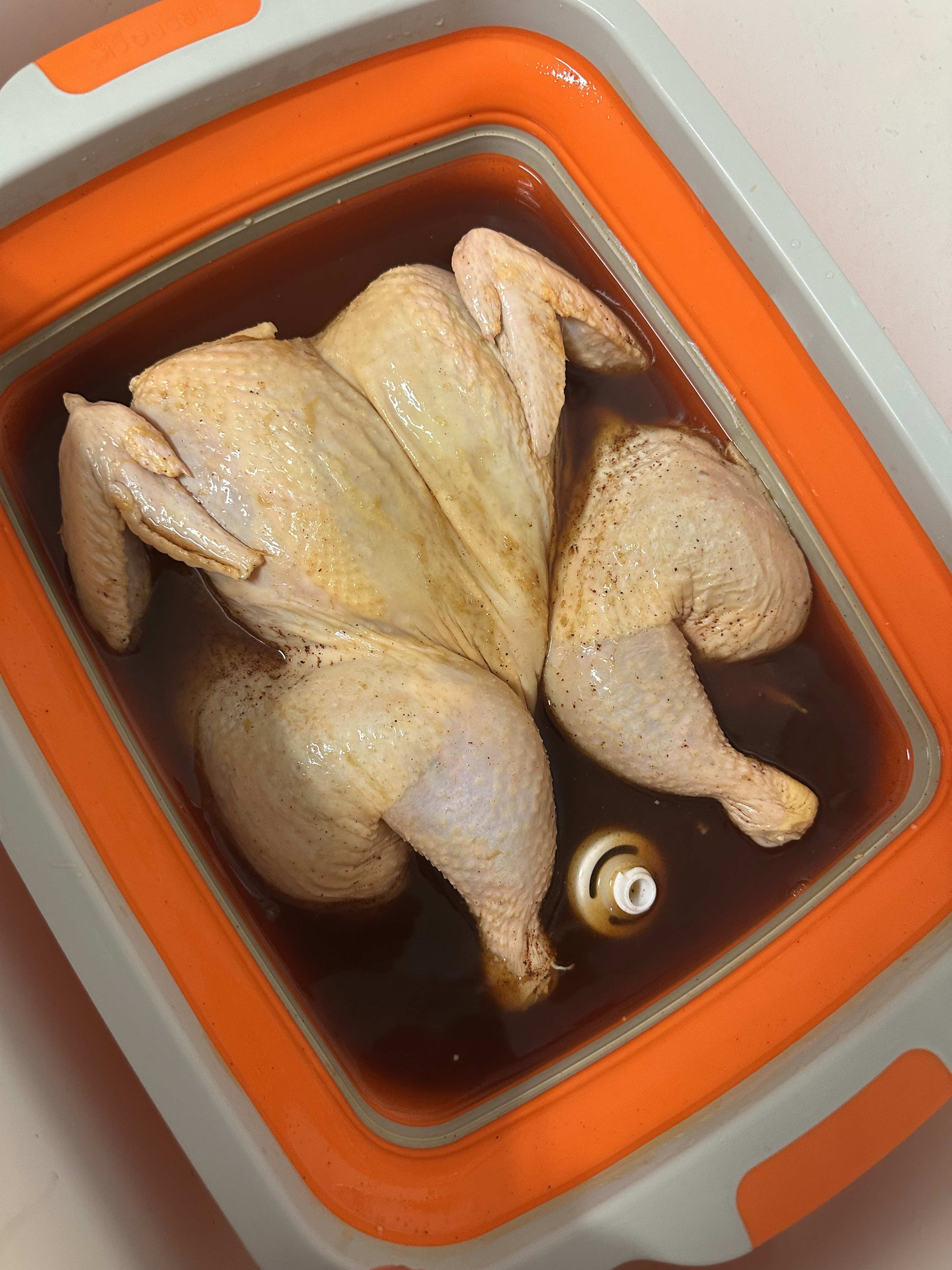 Nice chicken there! Your brine and rub make for a dark chocolate toned skin that looks very crispy.