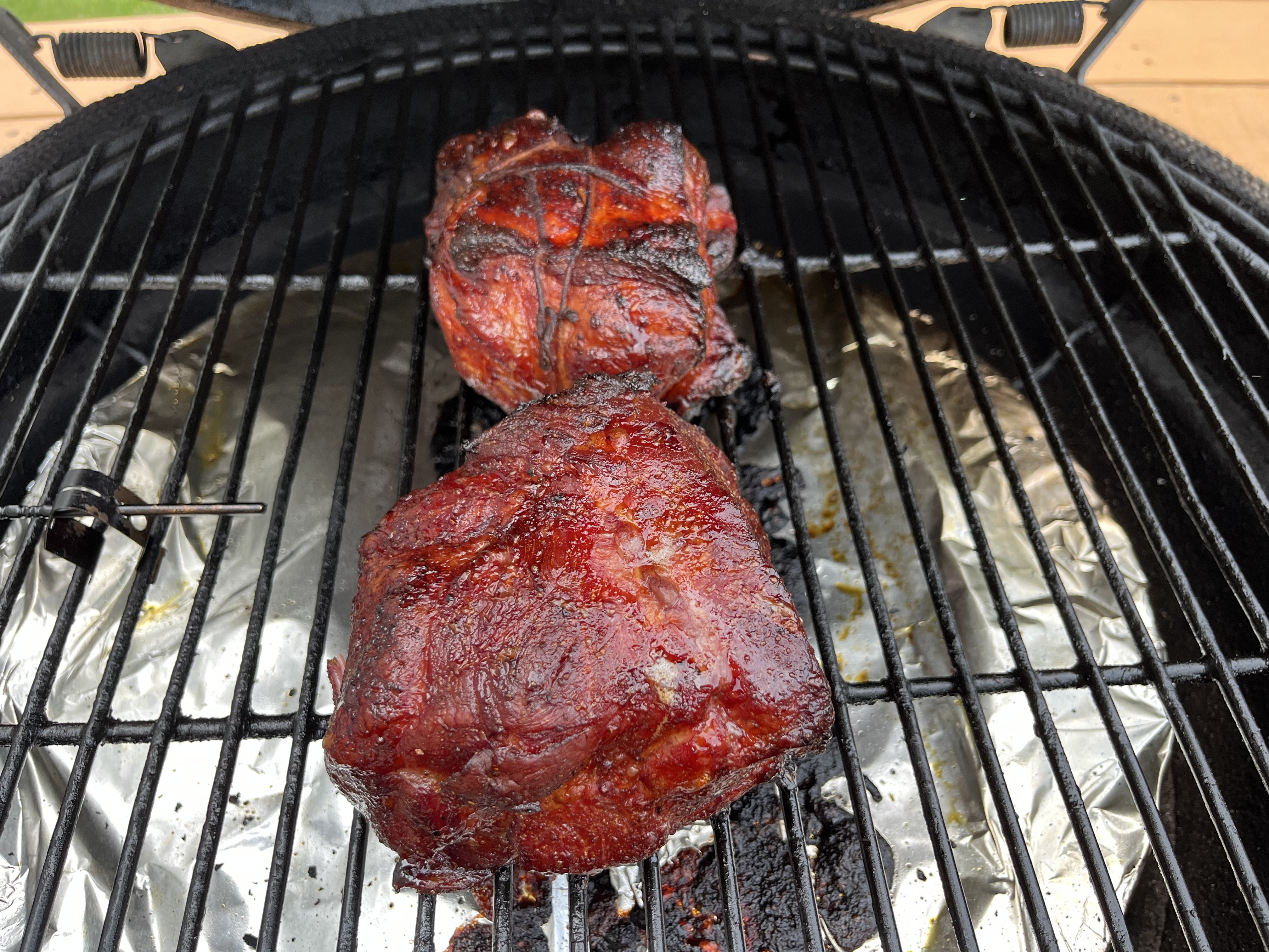 I seasoned with Meat Church Honey Hog about an hour before they went on the egg. I smoked them with pecan chunks between 275-285. They cooked for about 5.5 hours, not spritz or wrap as I was on calls all day so they just rode it out. I pulled them at about 204 and let them rest for about 2hrs before pulling them.  Very tender, juicy and a nice smoke ring.