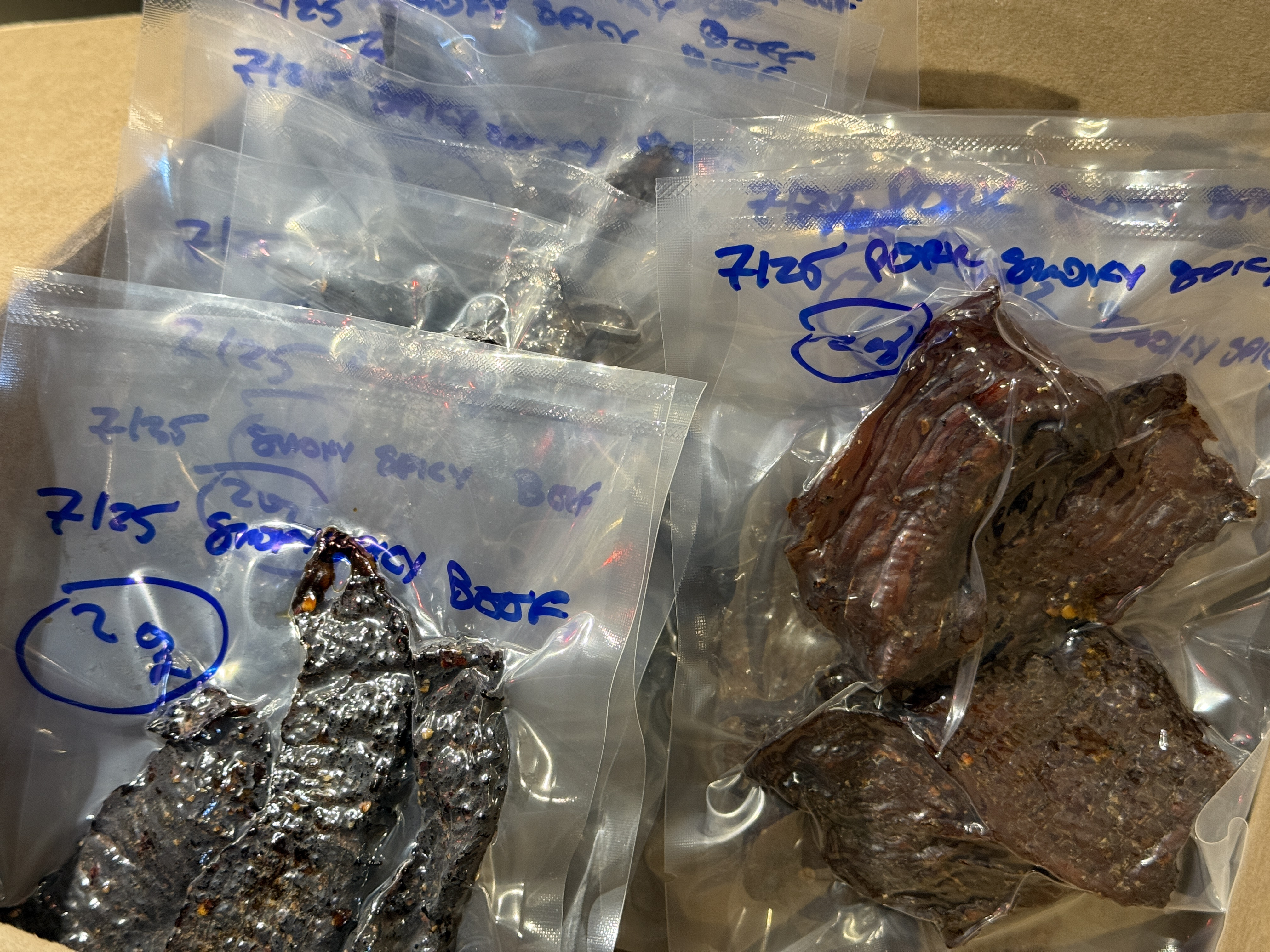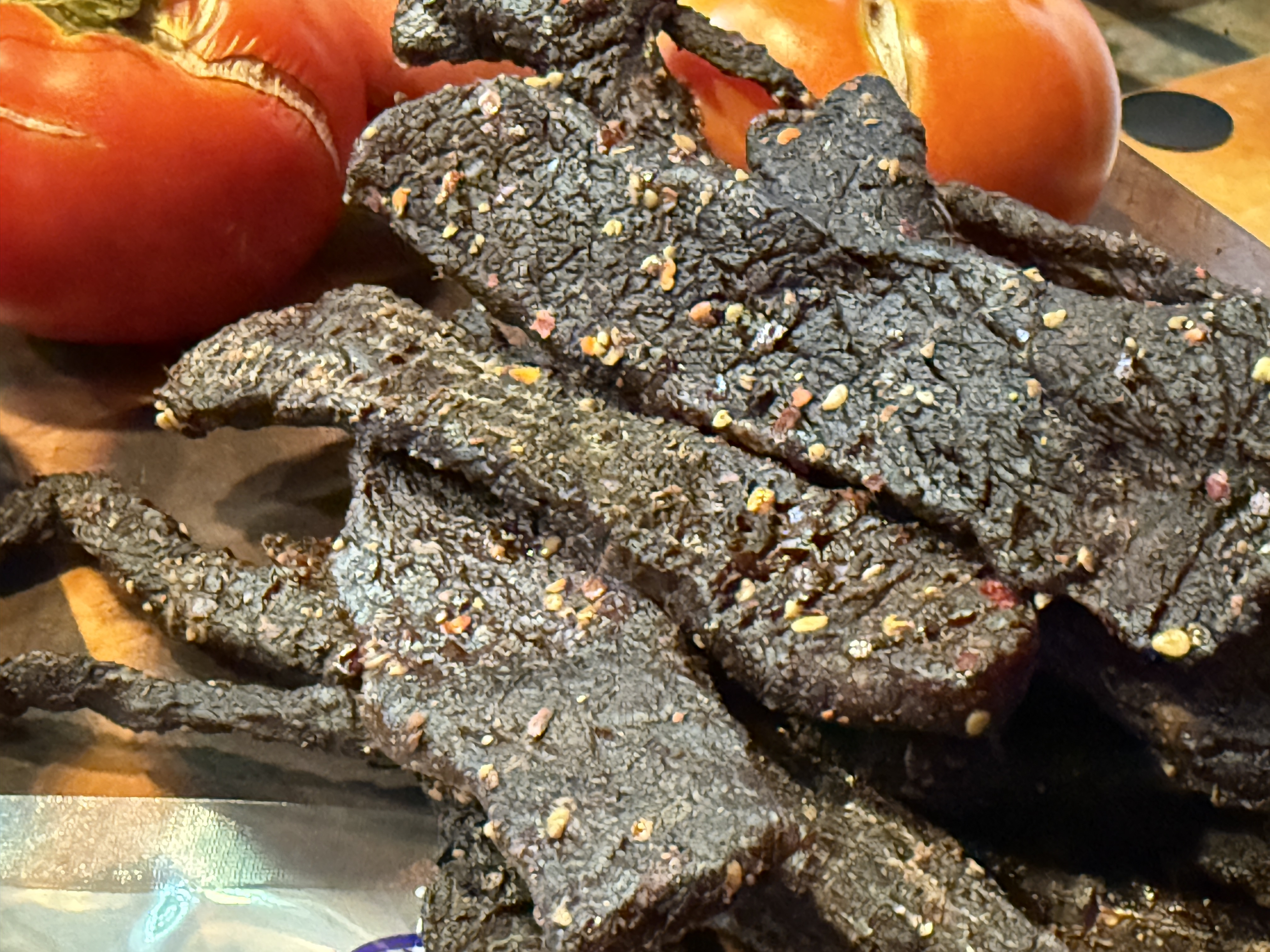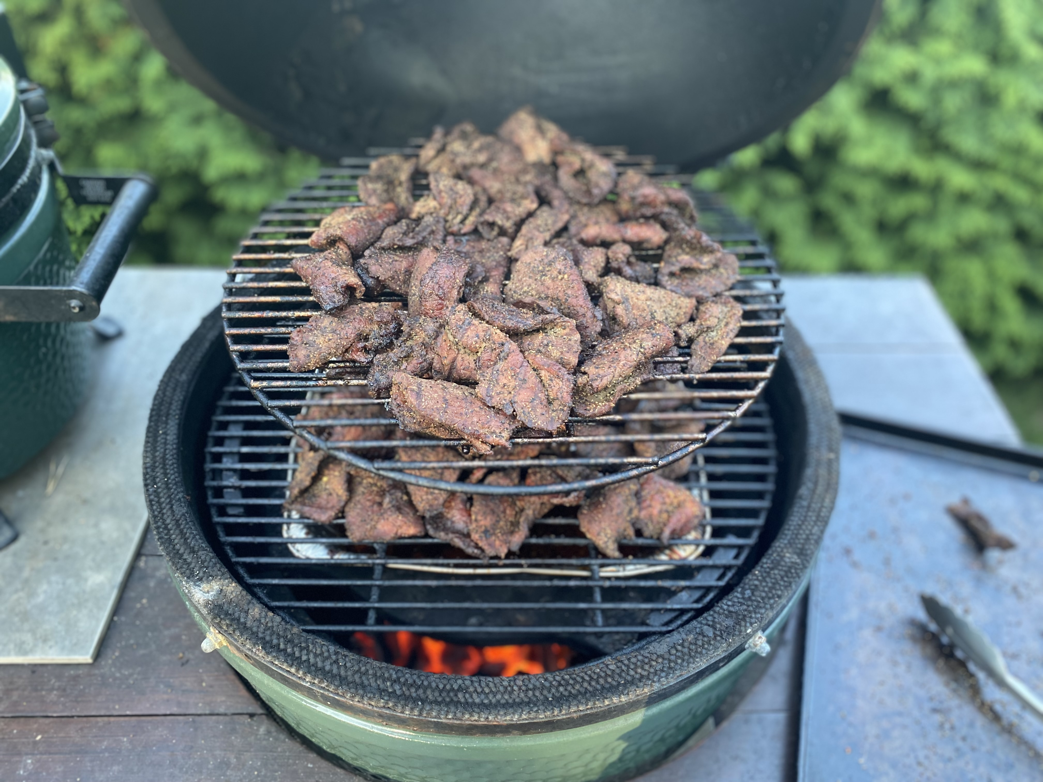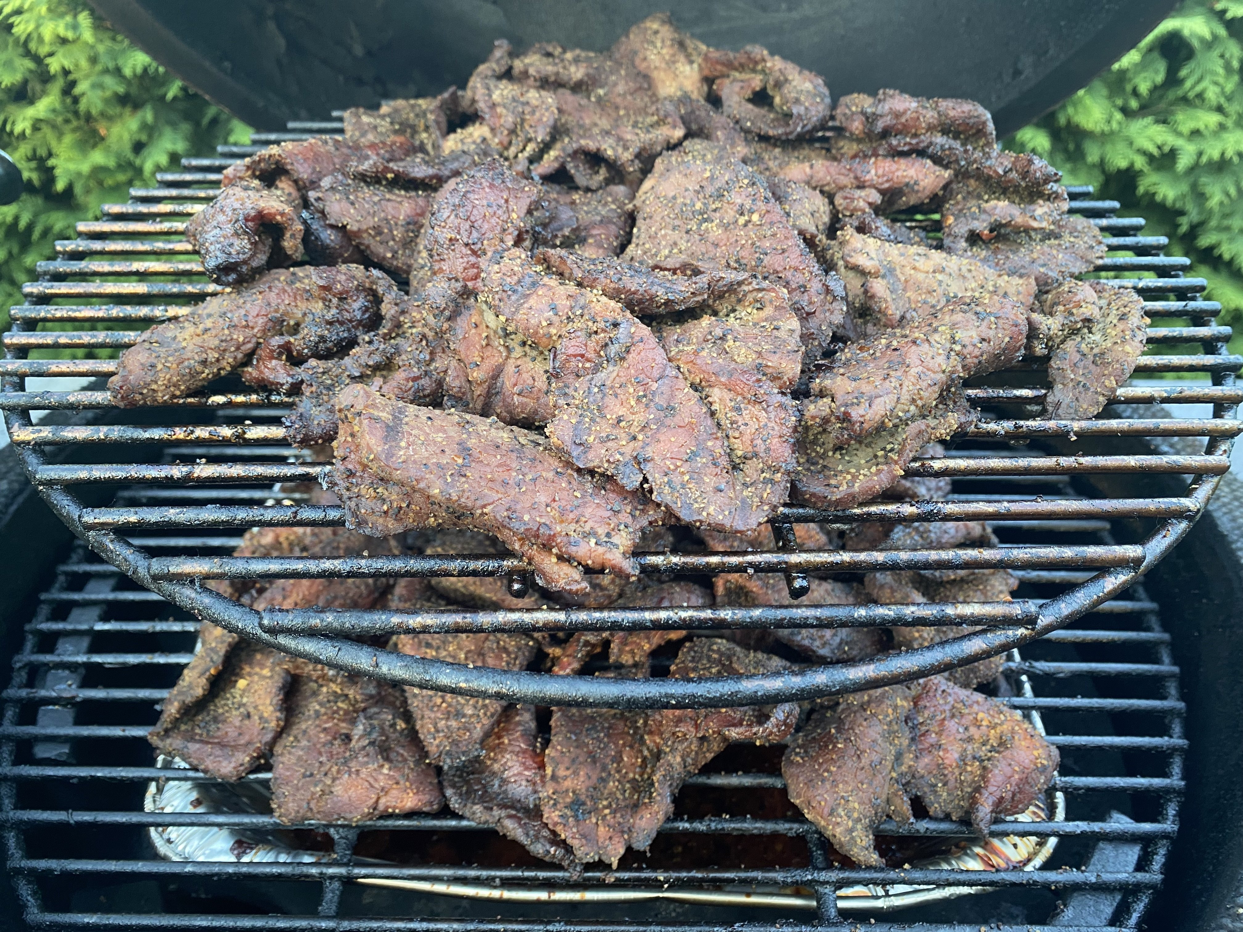Hadn’t made jerky in about six years. Was wanting a high protein snack. Bought a nearly 8lb’er of eye of round, trimmed it, sliced it and smoked it on the Egg. Once cooled, vac sealed and put into the freezer. Didn’t use curing salt, as I consume them within days of defrosting.