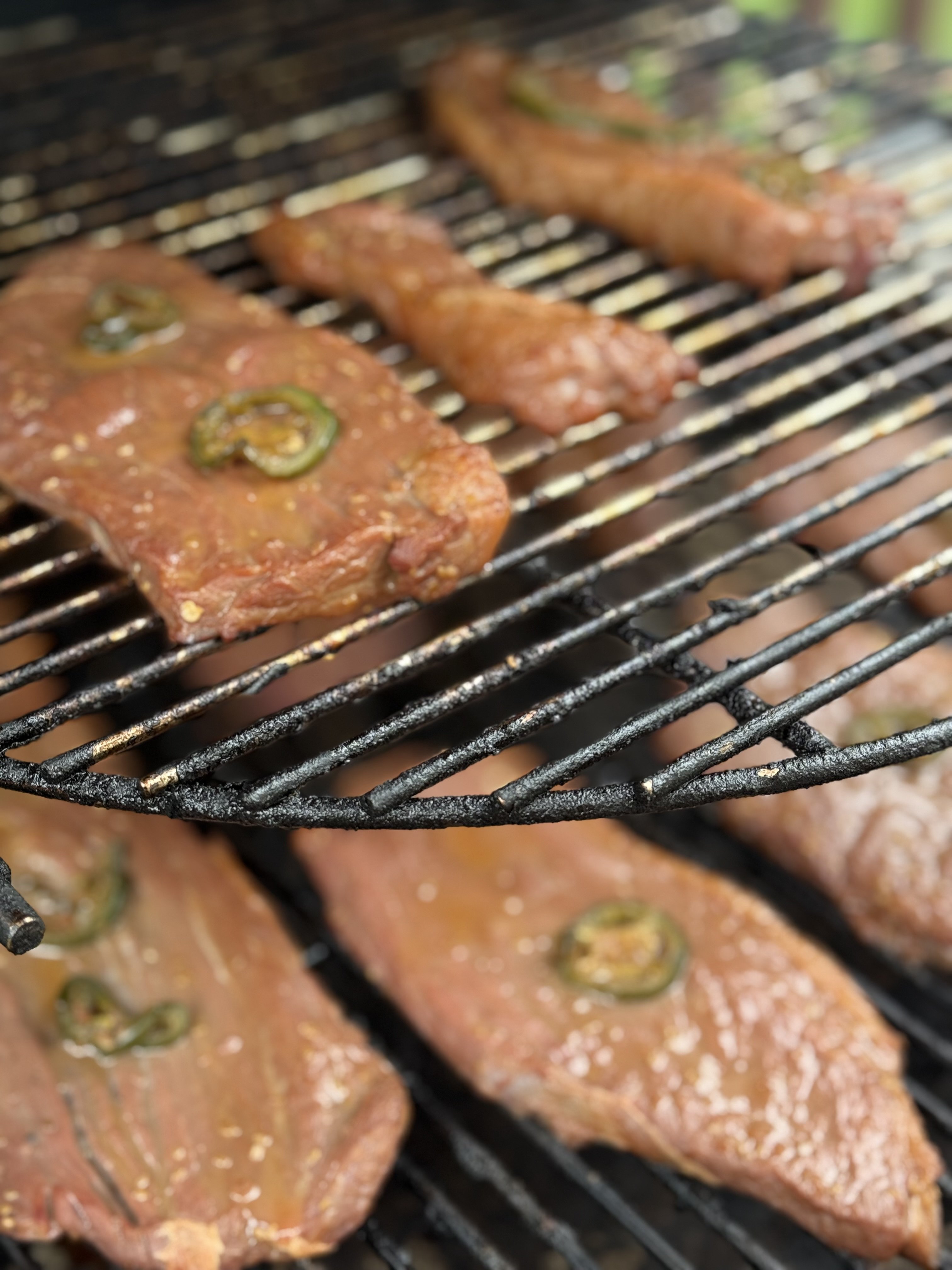 I use my regular meat slicer and just freeze the meat a bit or I use ground meat and a jerky gun with a flat tip (like a caulking gun but for meat). I really like how you garnished each slab with the jalapeño slices! I need to give that a try!