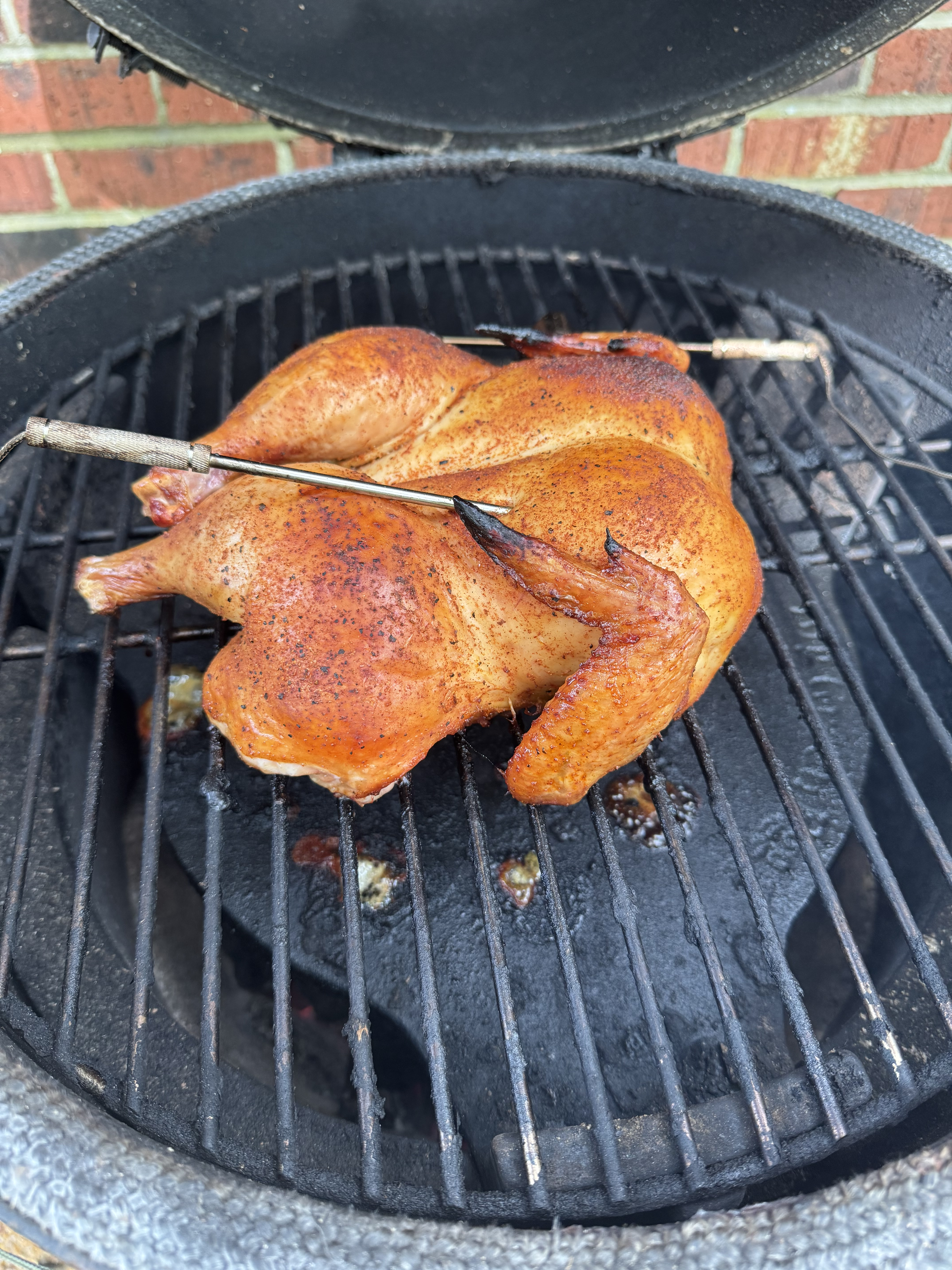 I only had one probe in the chicken and had it in the breast. The other probe was on the grate to give me temp at grate level. But I ended up pulling at 160 in the breast, then I probed the legs and they were at 180ish. It turned out much better than expected! I thought it may be too salty with the dry brine.Botch said:Since you have a thermo in both the breast and a thigh, what temps did you pull her at? I haven't done a whole chicken yet since getting a 2-thermo setup, and not sure what temp to follow (I'll pull a breast between 155 and 160º, thighs anywhere between 175-195º).