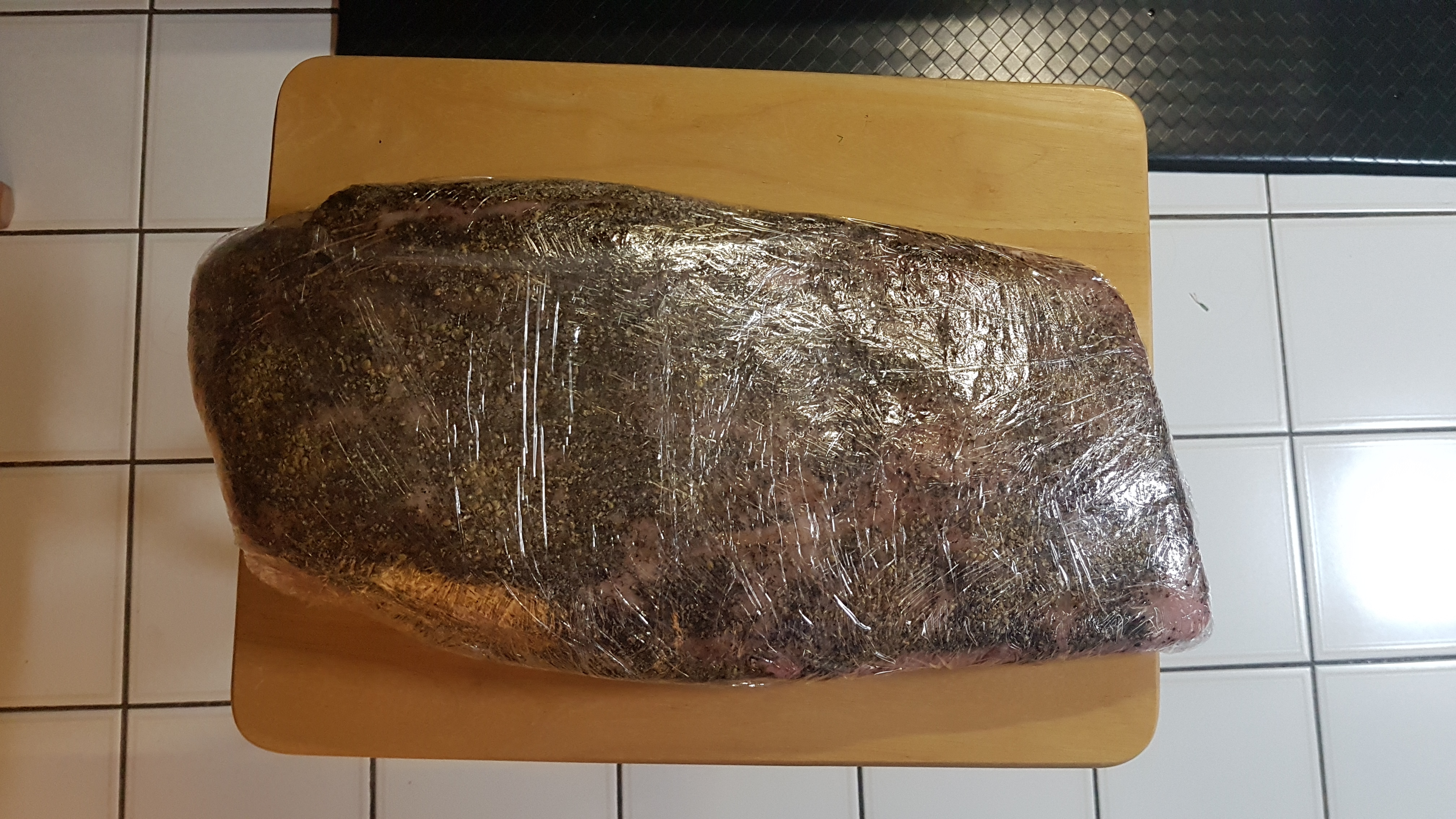 Sleeping in fridge for ten days, turning twice daily. To be followed by rinse, rest, smoke and steam.