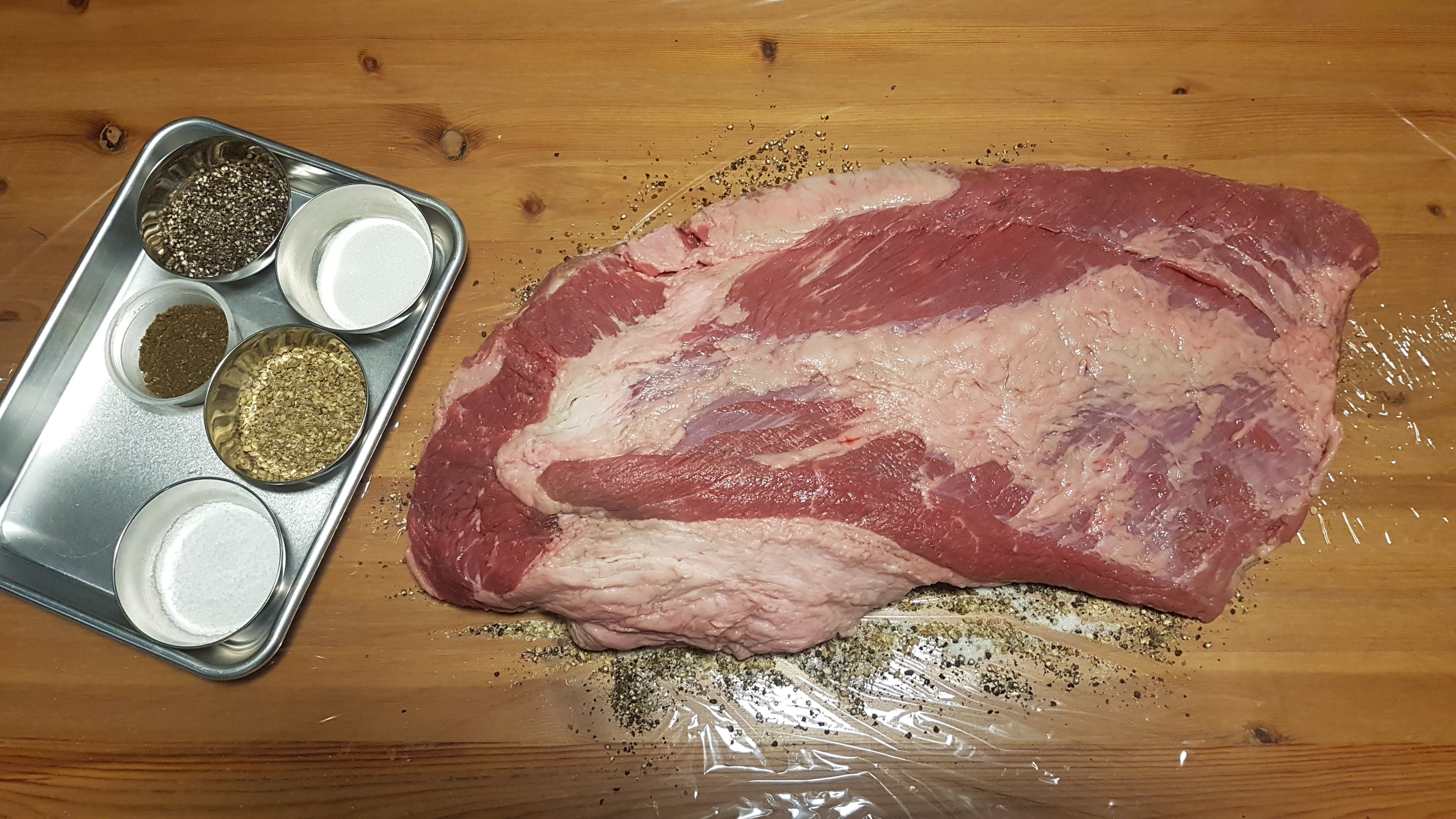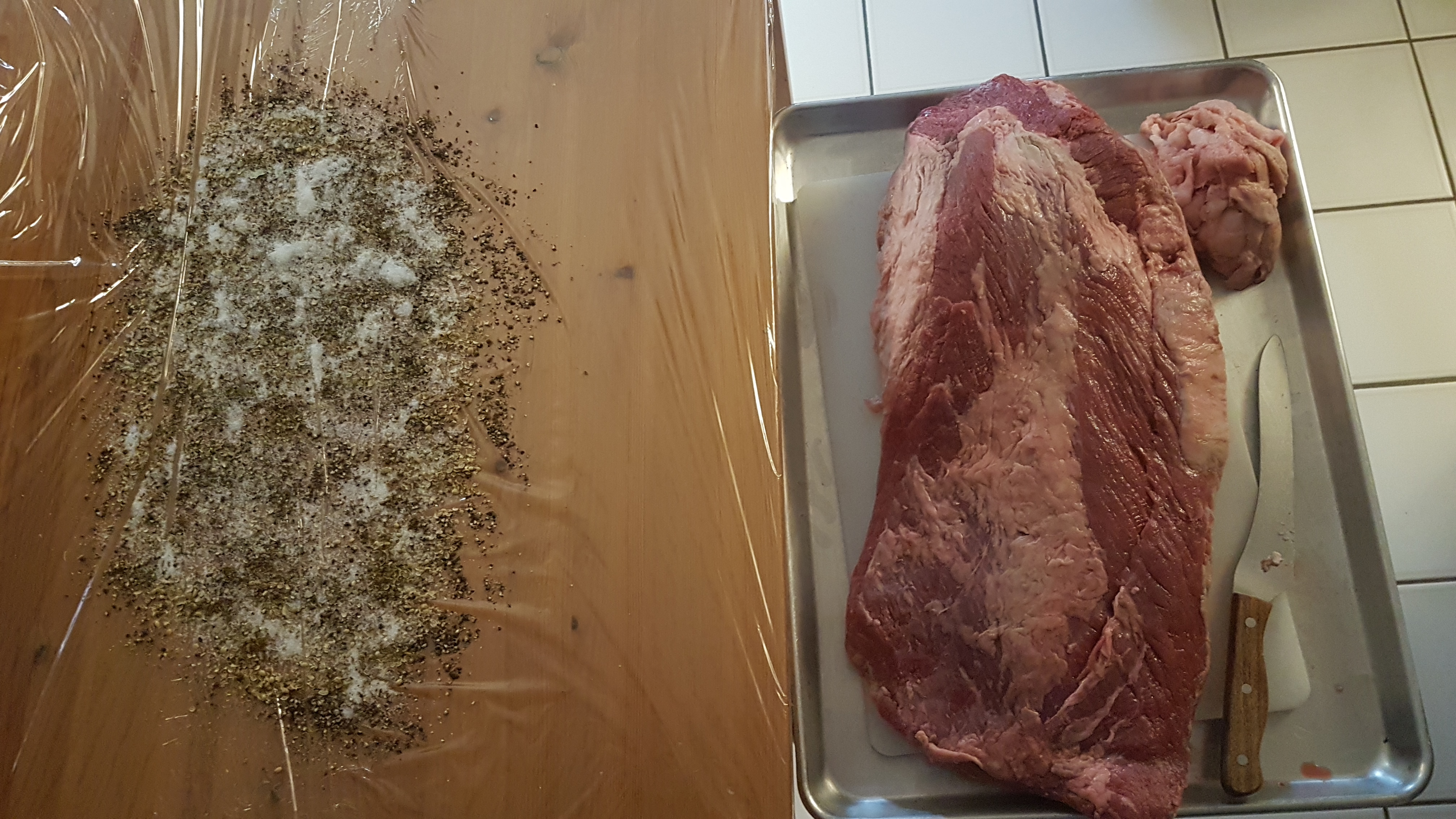 Started with two overlapping strips of restaurant-size wrap. While I held the brisket above the table, my helper sprinkled crushed pepper below to make a crime scene outline. Filled the footprint evenly with 1/2 the cure and seasoning...
