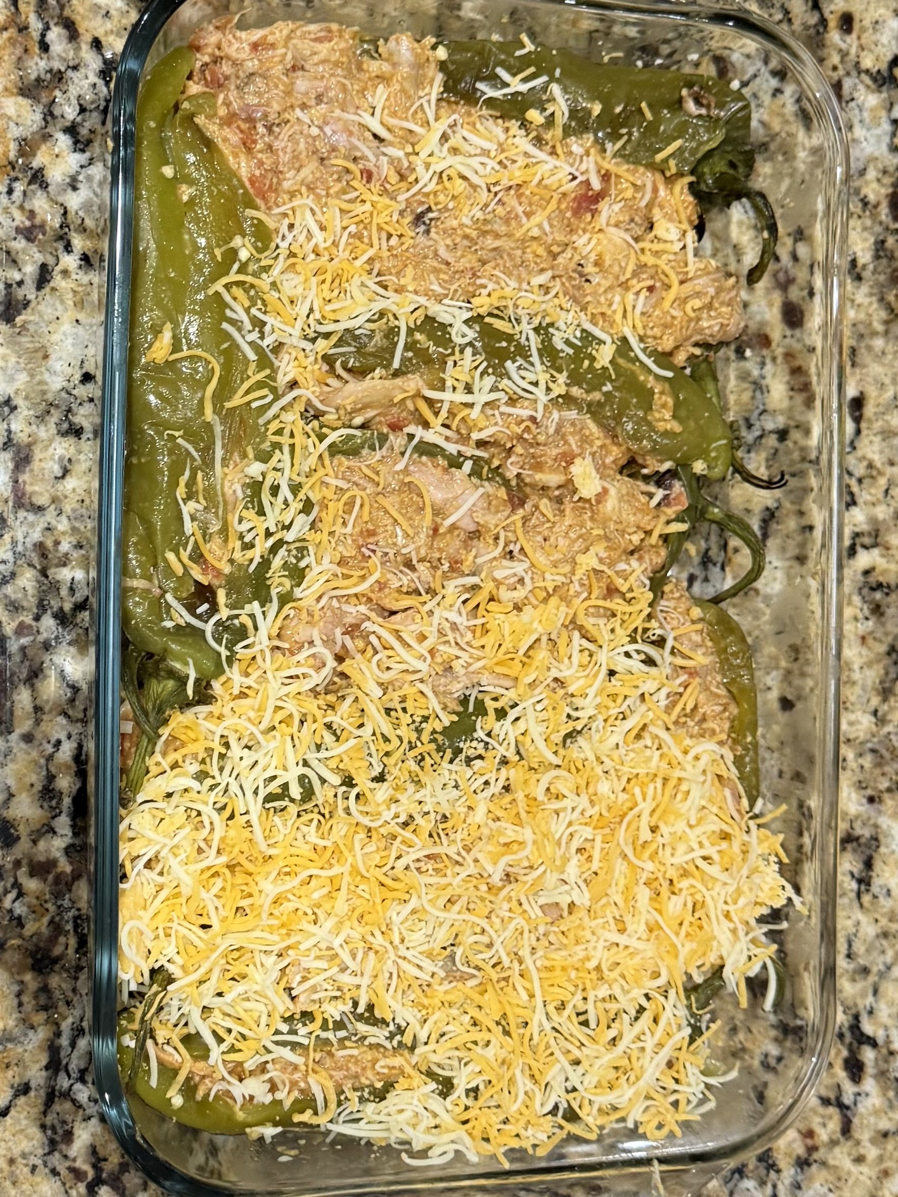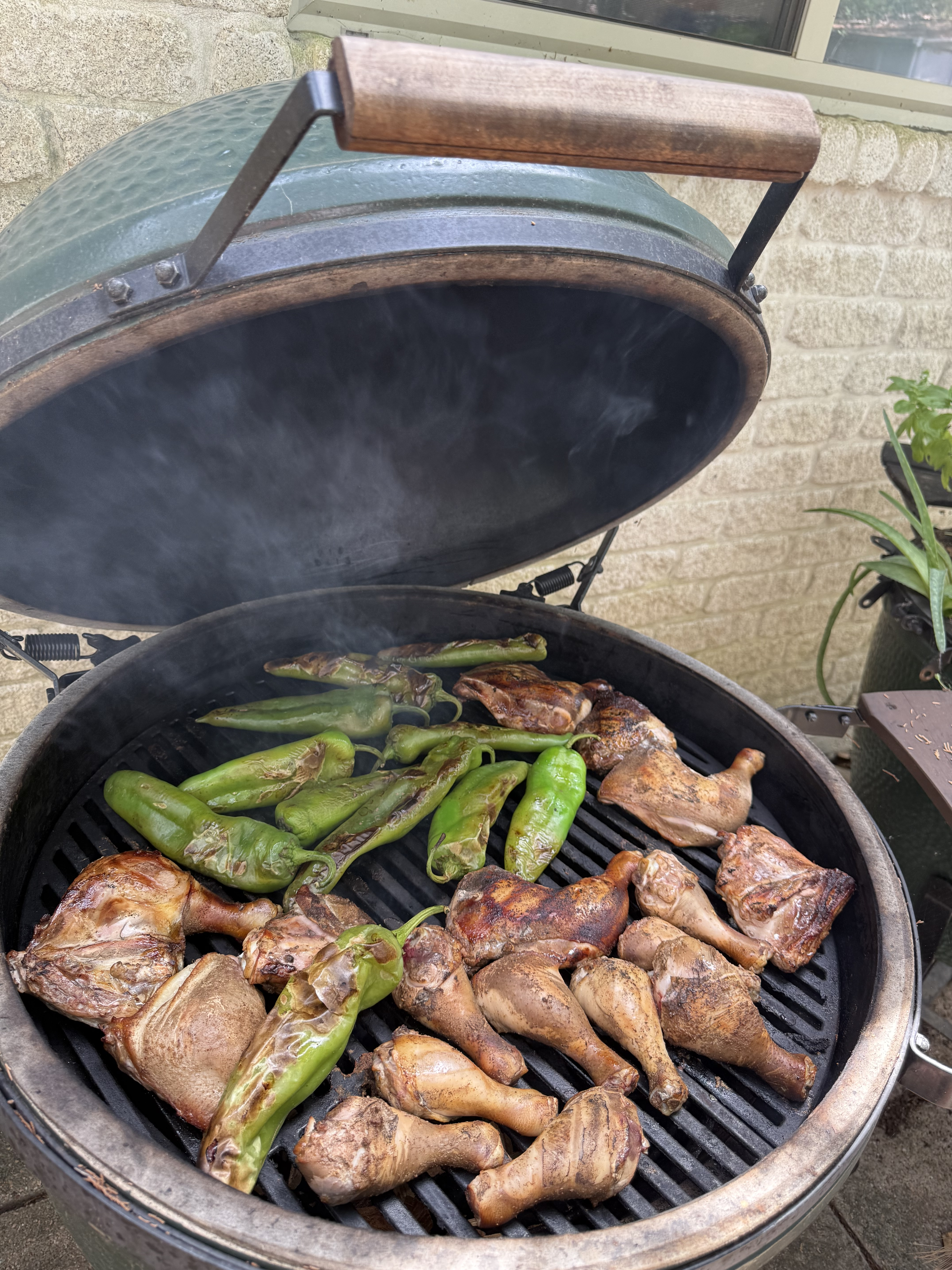 The hatch peppers are just starting to show up in our local grocery! I have a busy day tomorrow so this afternoon I smoked a load of s&p chicken 250° over hickory and roasted a couple pounds of hatch. Had some of the smoked chicken legs with salad for dinner. Peeled the skin off the hatch and removed the seeds. Stuffed them with a mixture of the remaining chicken, cheese, cumin, and a can of tomatoes and peppers. Topped with a lot of cheese on one side for my DH who thinks he can never have enough cheese. It will just bake until heated through and served for dinner tomorrow with some refried beans and tortillas and salsa.