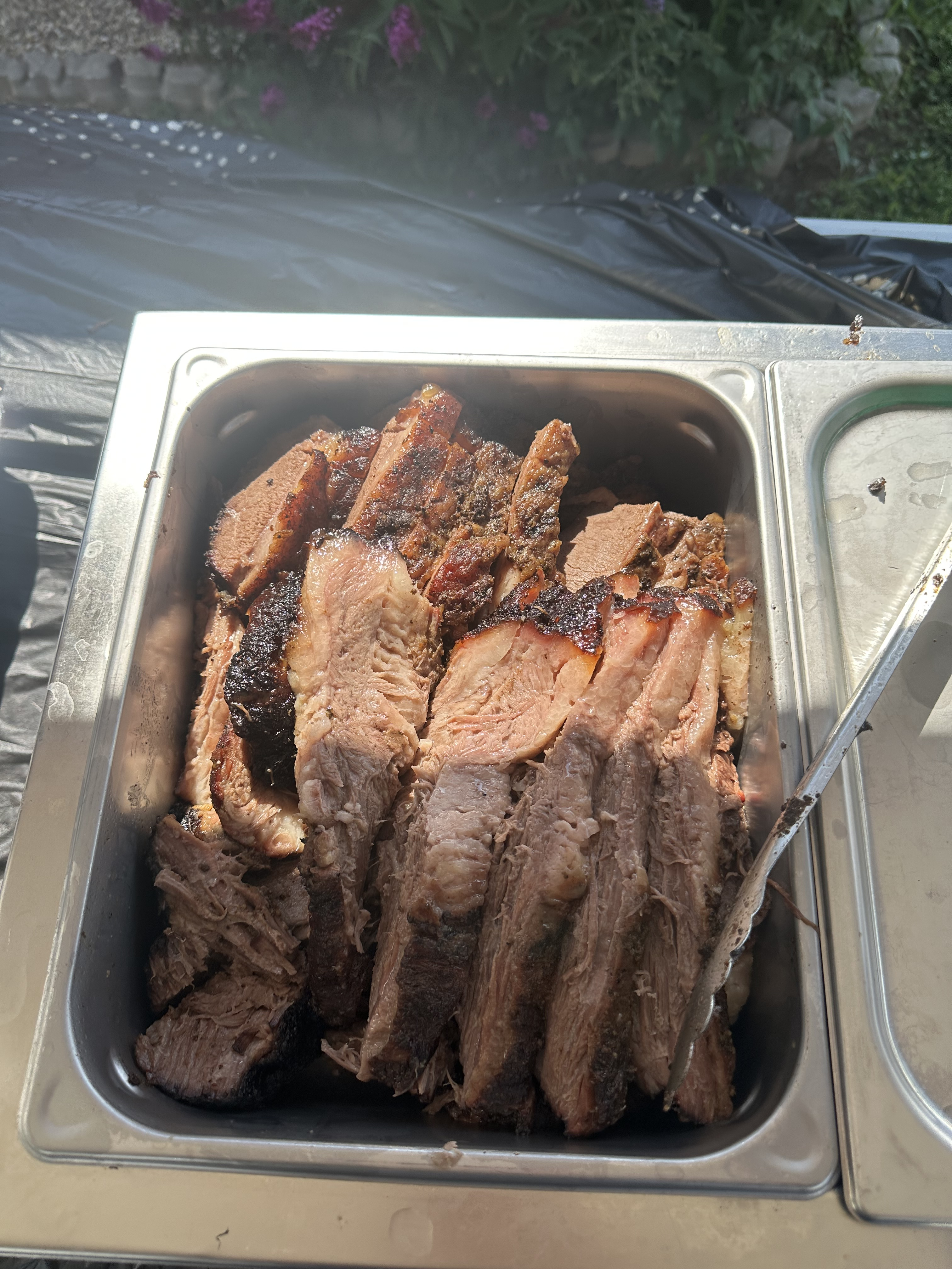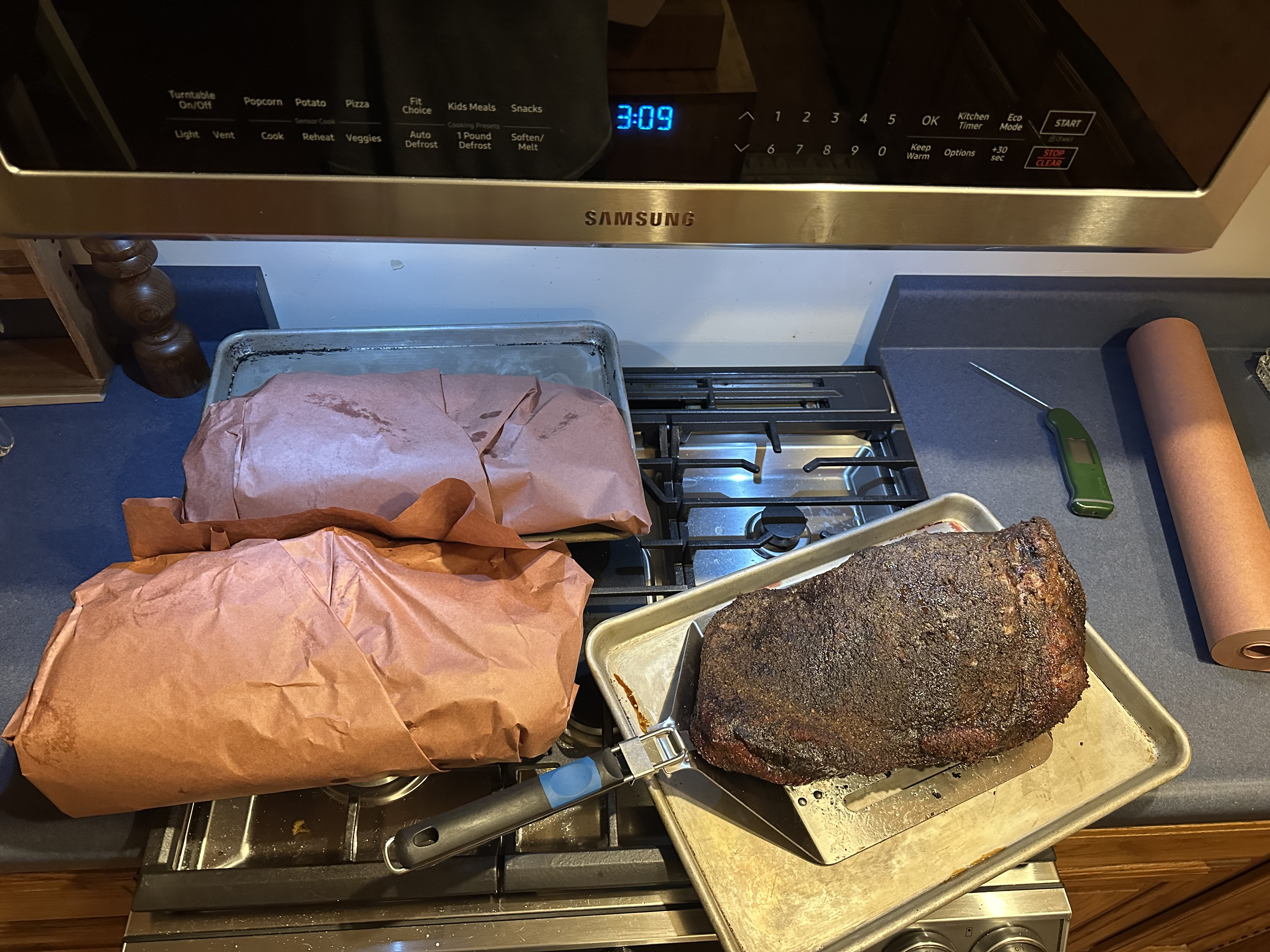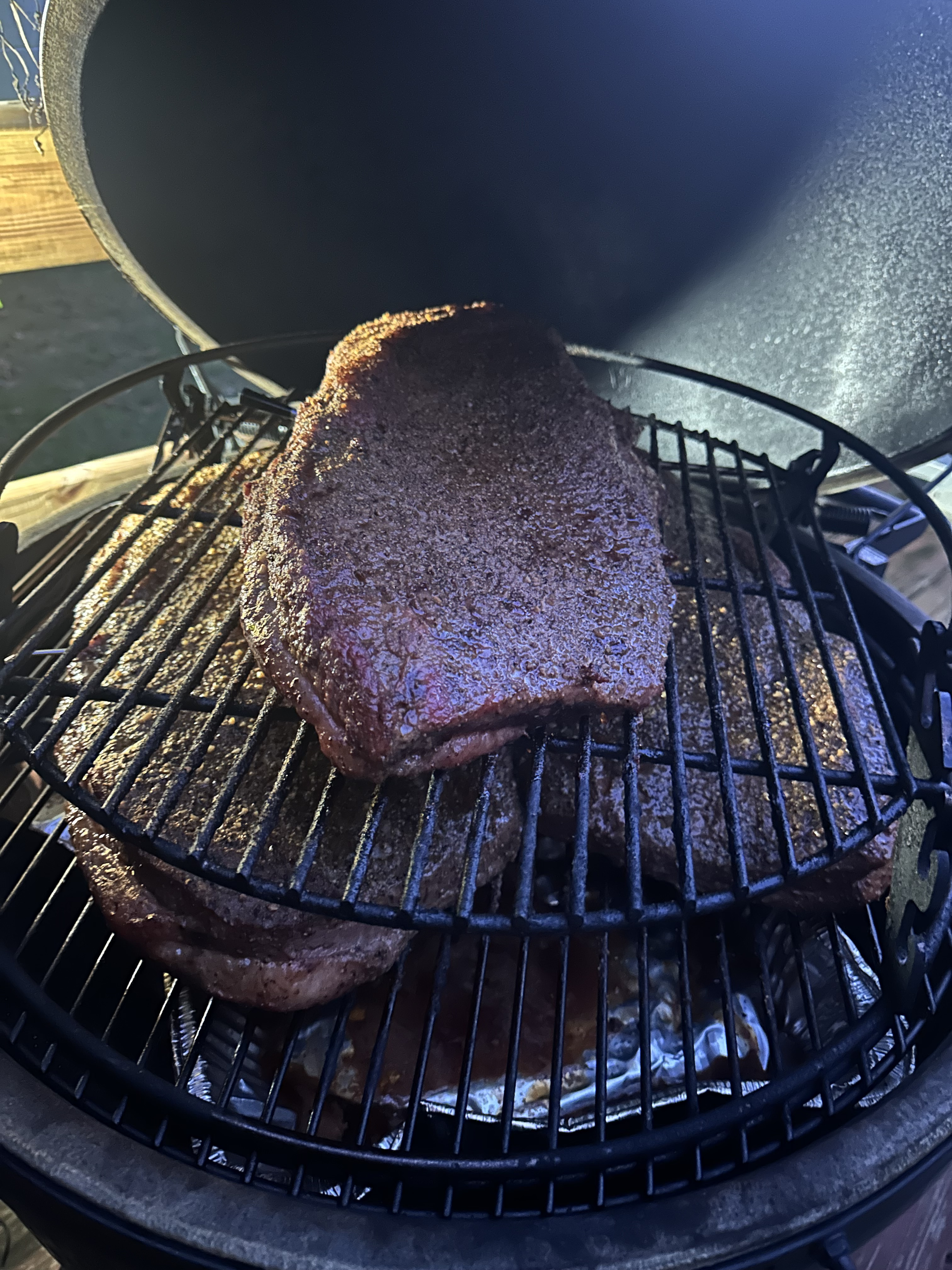 I went with the Woo/AR combo. Filled the egg full of Rockwood and 4-5 chunks of post oak. I cooked fat cap down with very little trimming done to the cap as I was really trying to protect that flat. Coated with the last of my Oakridge BBQ brisket rub and used the old trusty flameboss to drive the cook. I seem to have the best luck with brisket going lower than my normal for the egg. I did these at 225 and was expecting 16-18 hours. I left myself plenty for time if they went long and I could hold in the Cambro for several hours if they went short. They wound up taking 18-20 hours. Once they hit 160 I wrapped in butcher paper and finished in the oven. Everyone ate it and seemed to enjoy it. My brisket game is slowly improving.