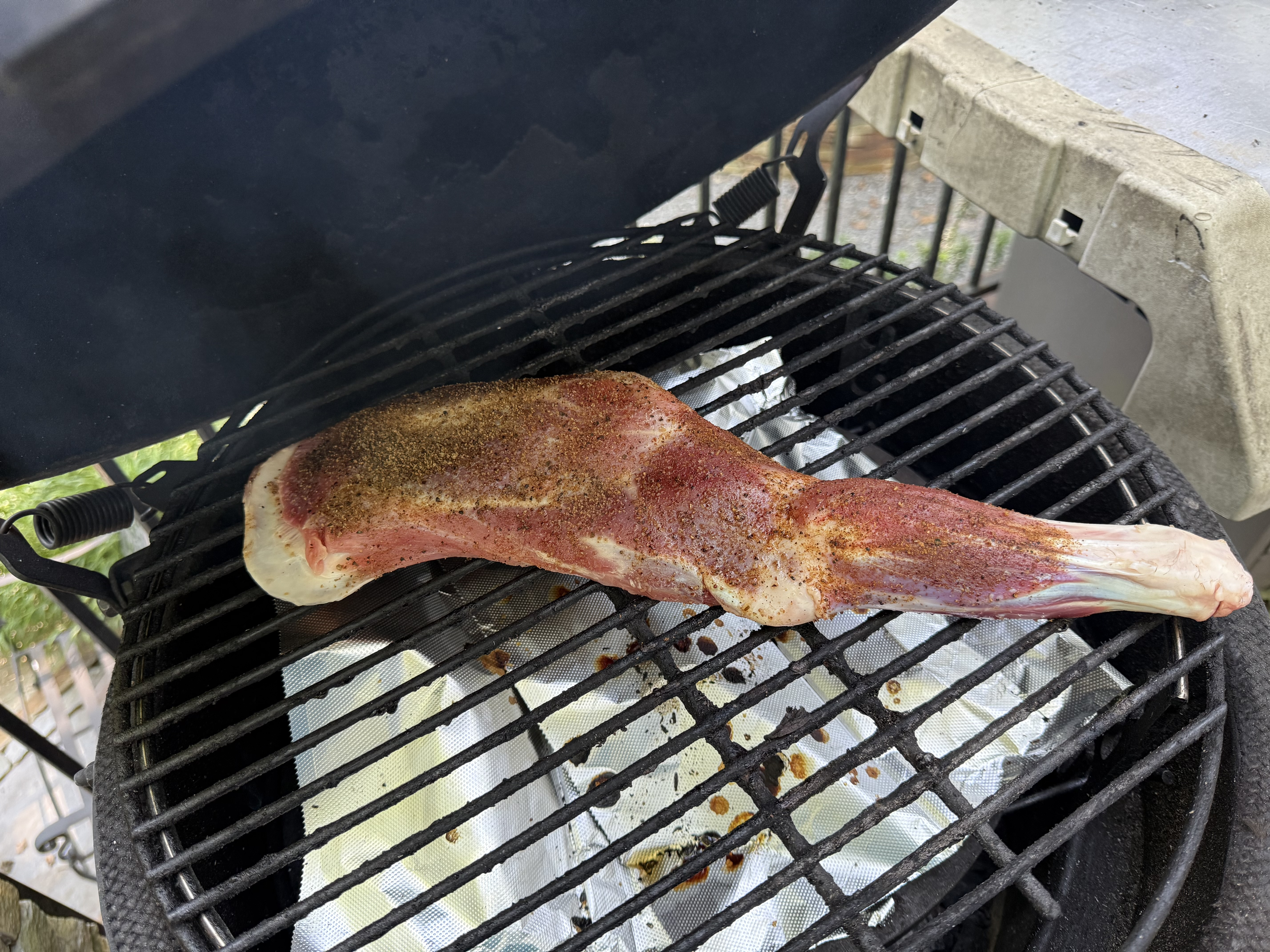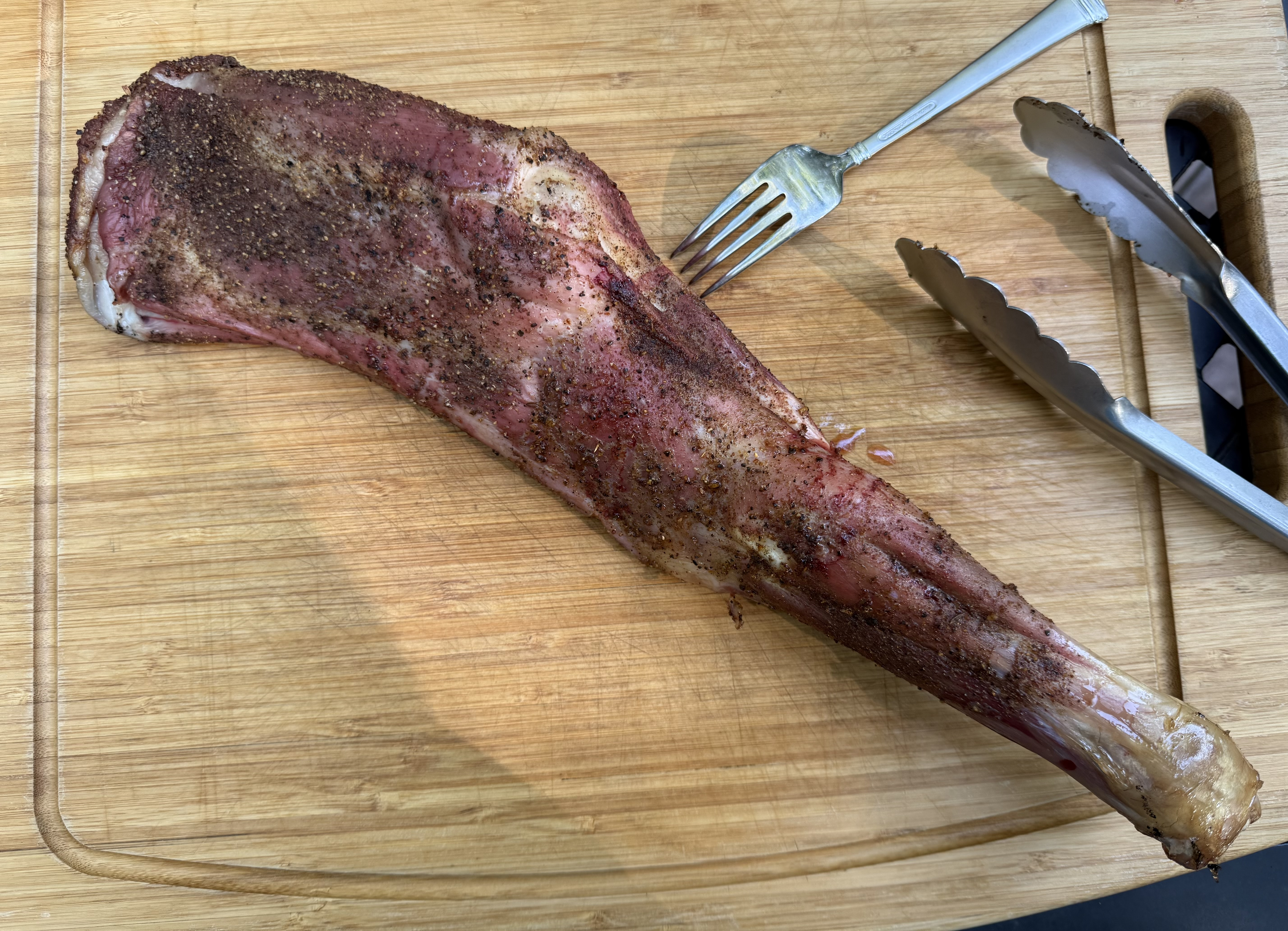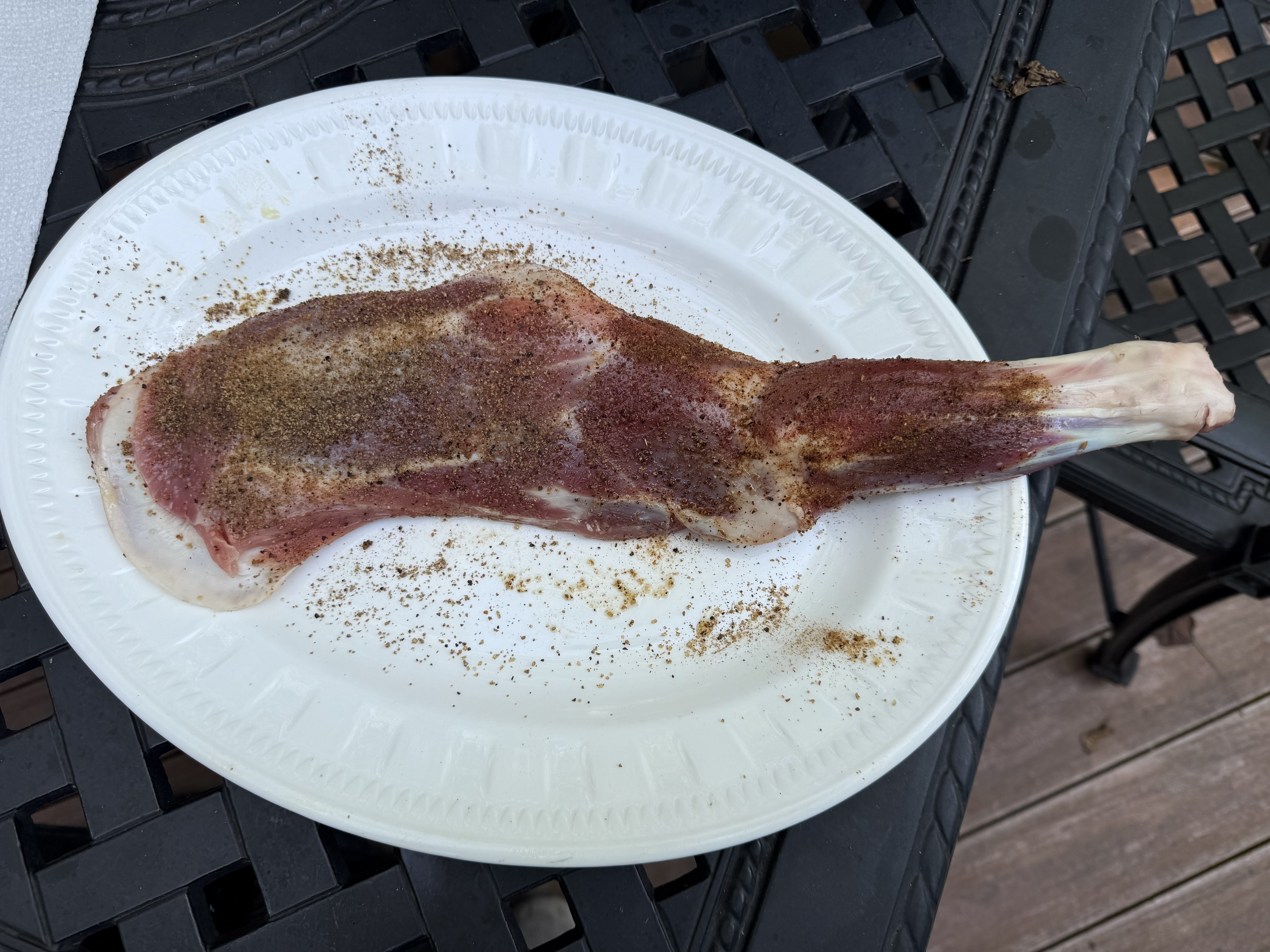 My wife is out of town this weekend, so I cooked up a whole right front leg of lamb. I rubbed half with DP red eye express and the other half with hardcore carnivore camo. This lamb was born back in early March and was growing much, much slower than the others, so we slaughtered it about a month ago.