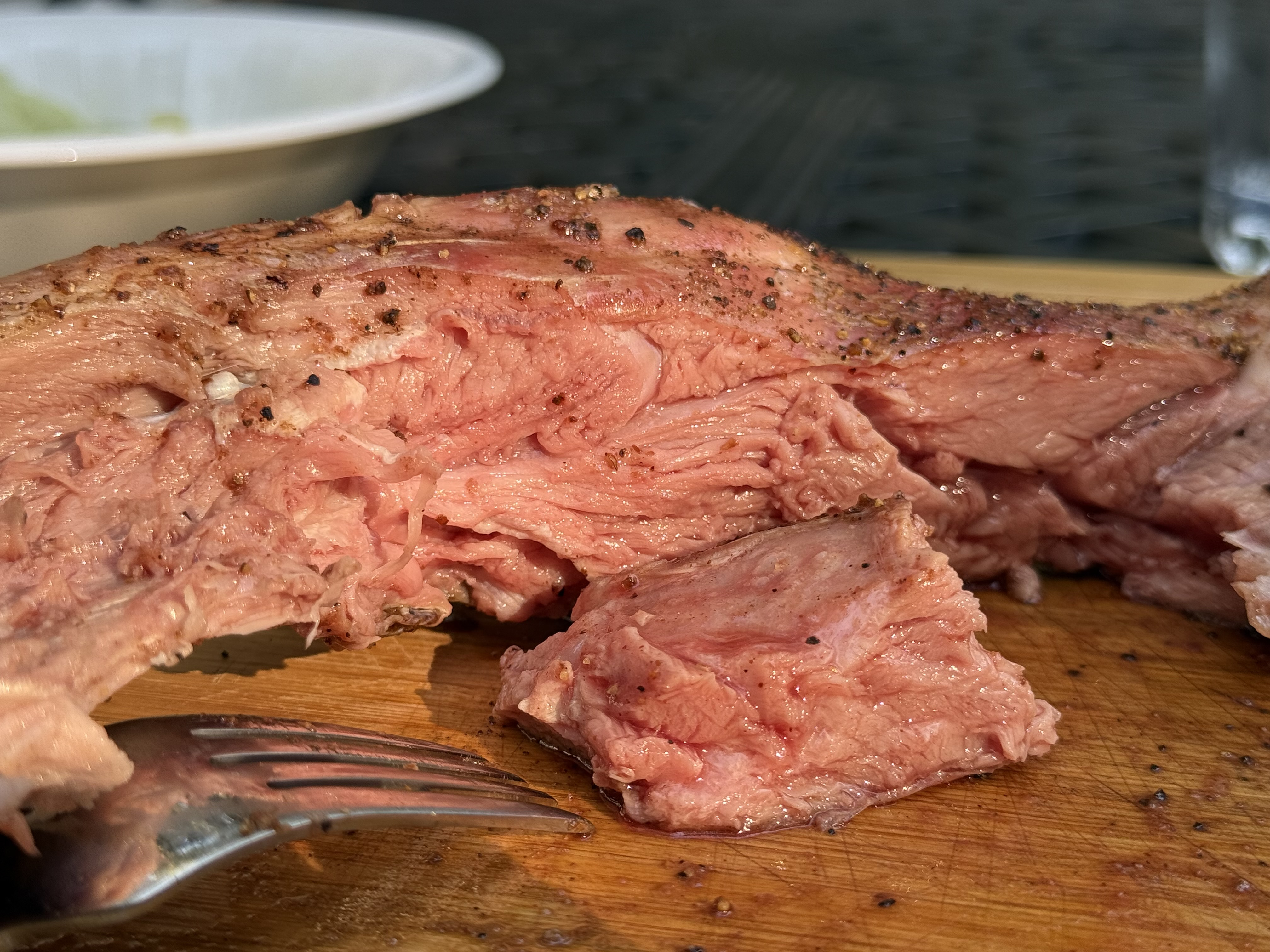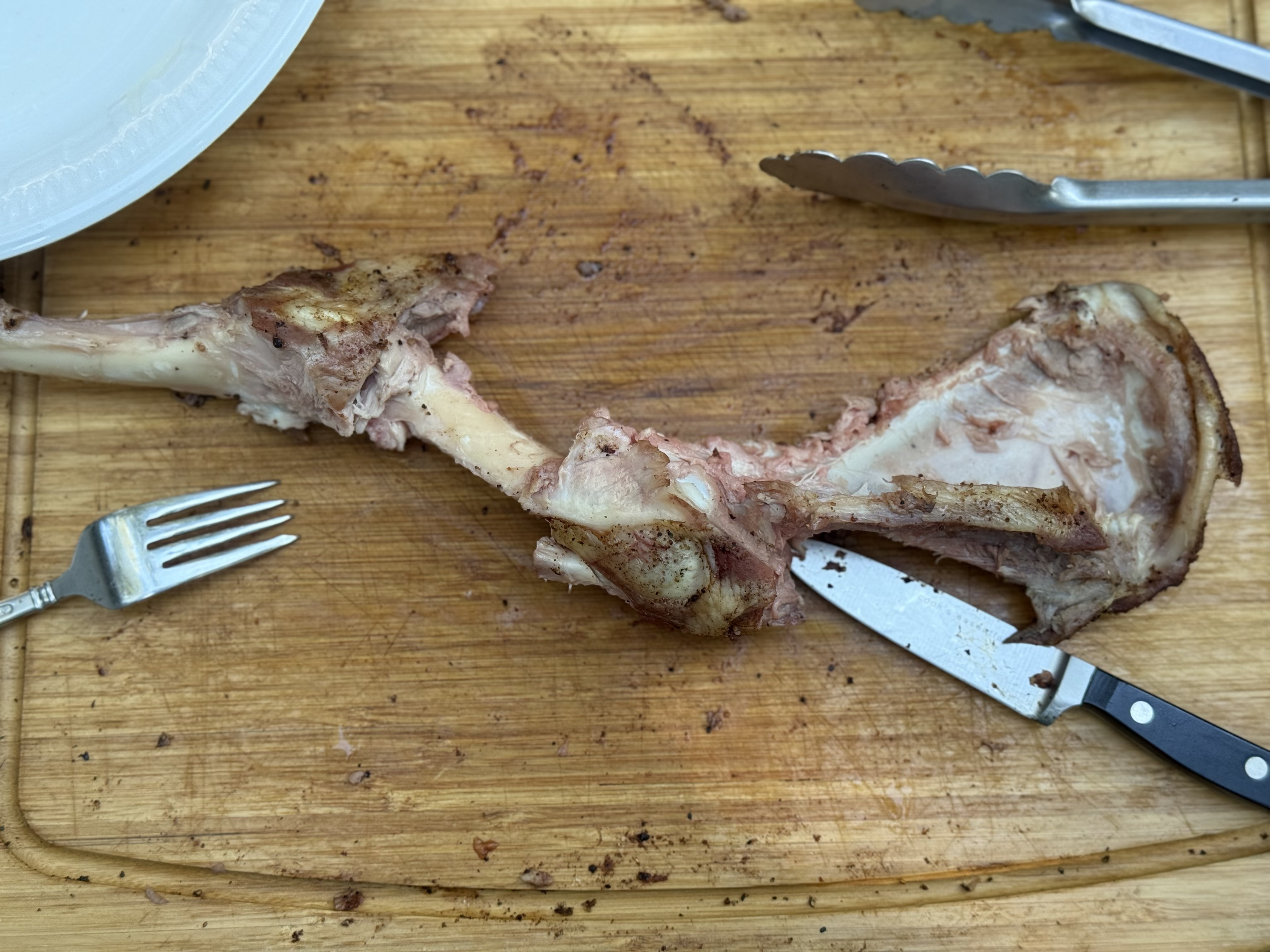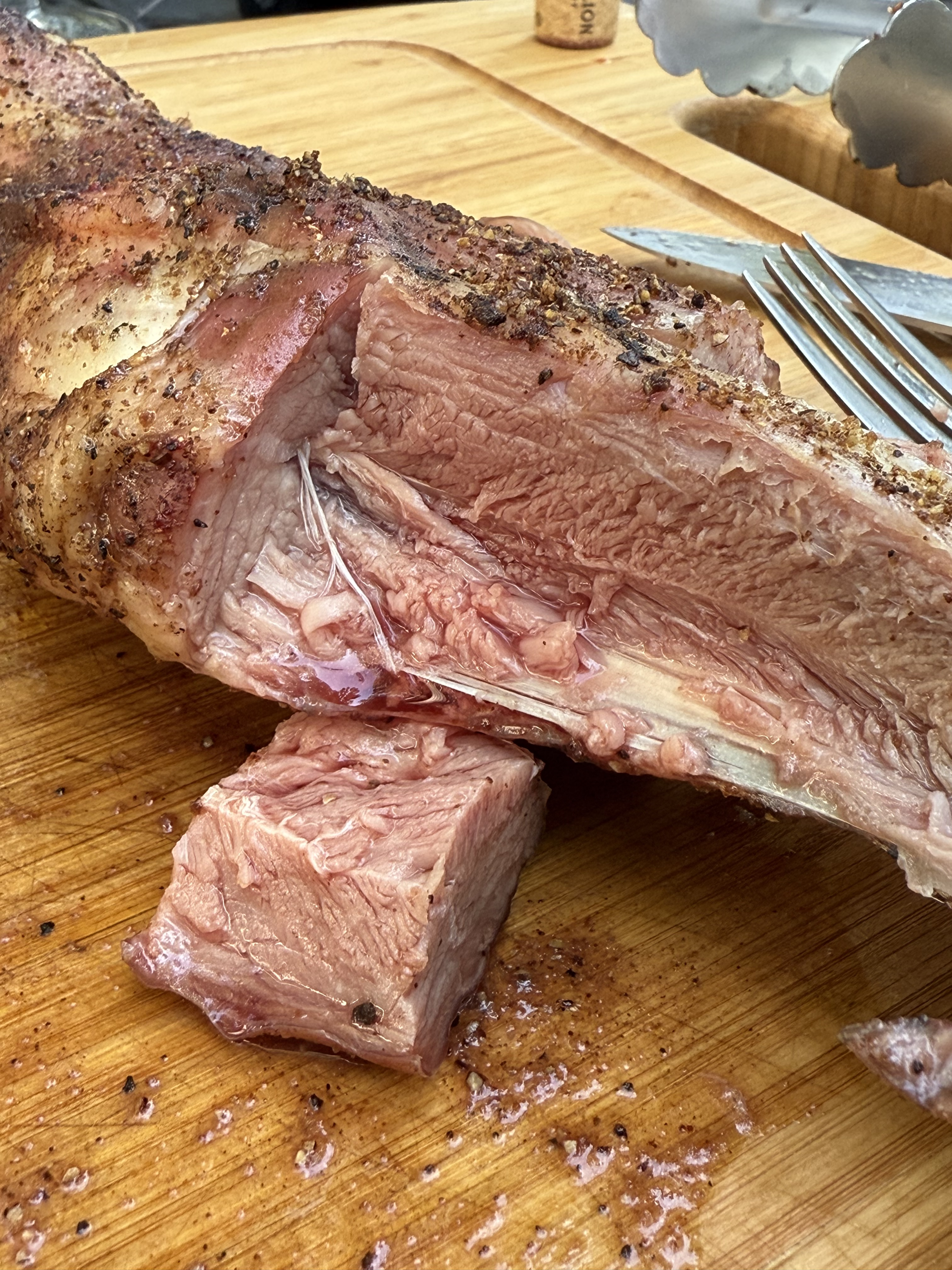 My wife is out of town this weekend, so I cooked up a whole right front leg of lamb. I rubbed half with DP red eye express and the other half with hardcore carnivore camo. This lamb was born back in early March and was growing much, much slower than the others, so we slaughtered it about a month ago.