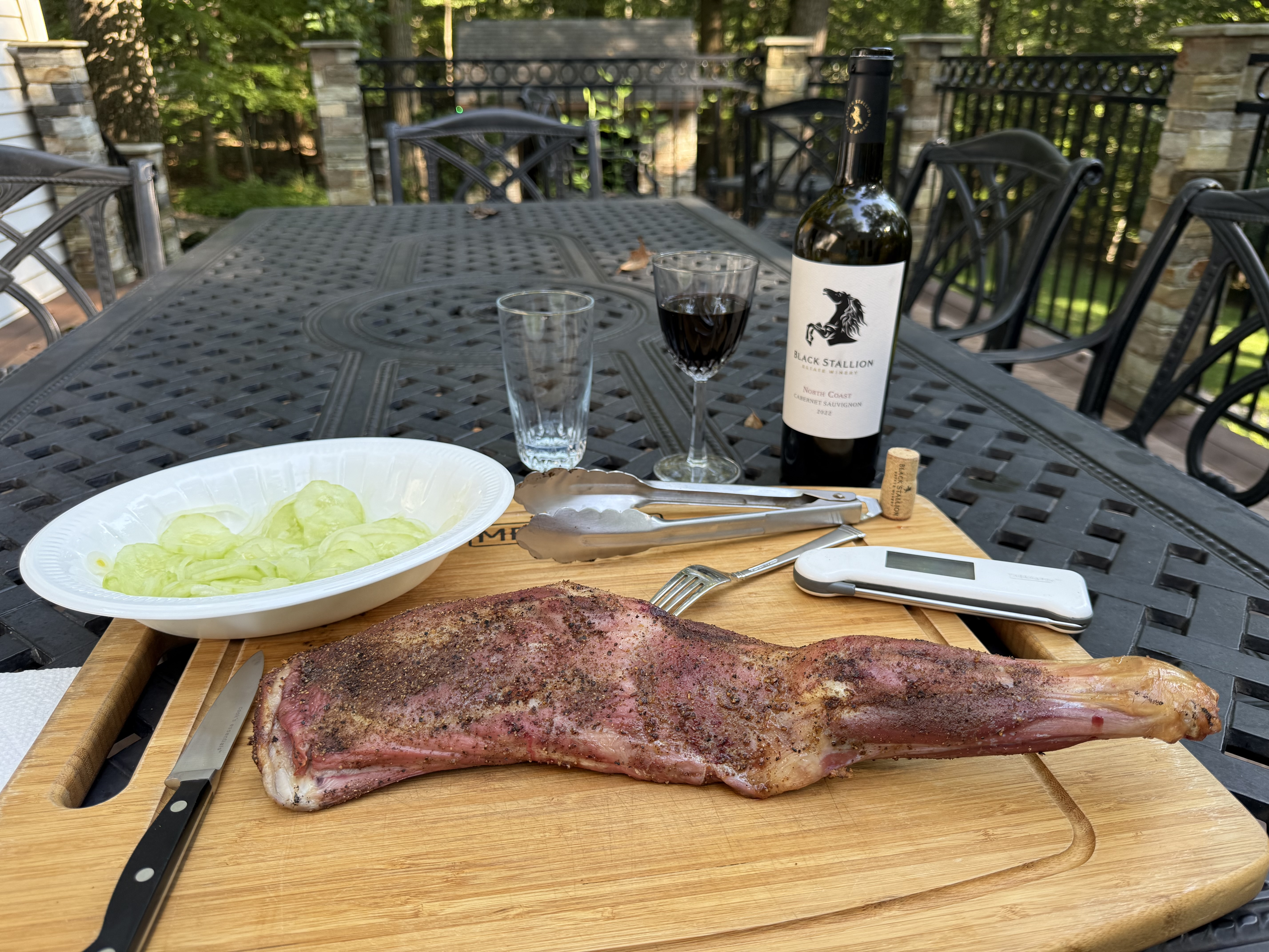 Cooked at 275F with a small chunk of cherry. Sure there was some work cutting around the tendons but it was worth it. Pictures will tell the story. The one and only side was thinly sliced cucumbers with thin shavings of mild onion and salt which was cut/mixed mid morning and sat all day on the counter letting the salt do the work. I put it in the fridge just before I lit the egg to cool the salad down. Paired it with a Cab. It was a bit heavy, but I like the wine, so no complaints.