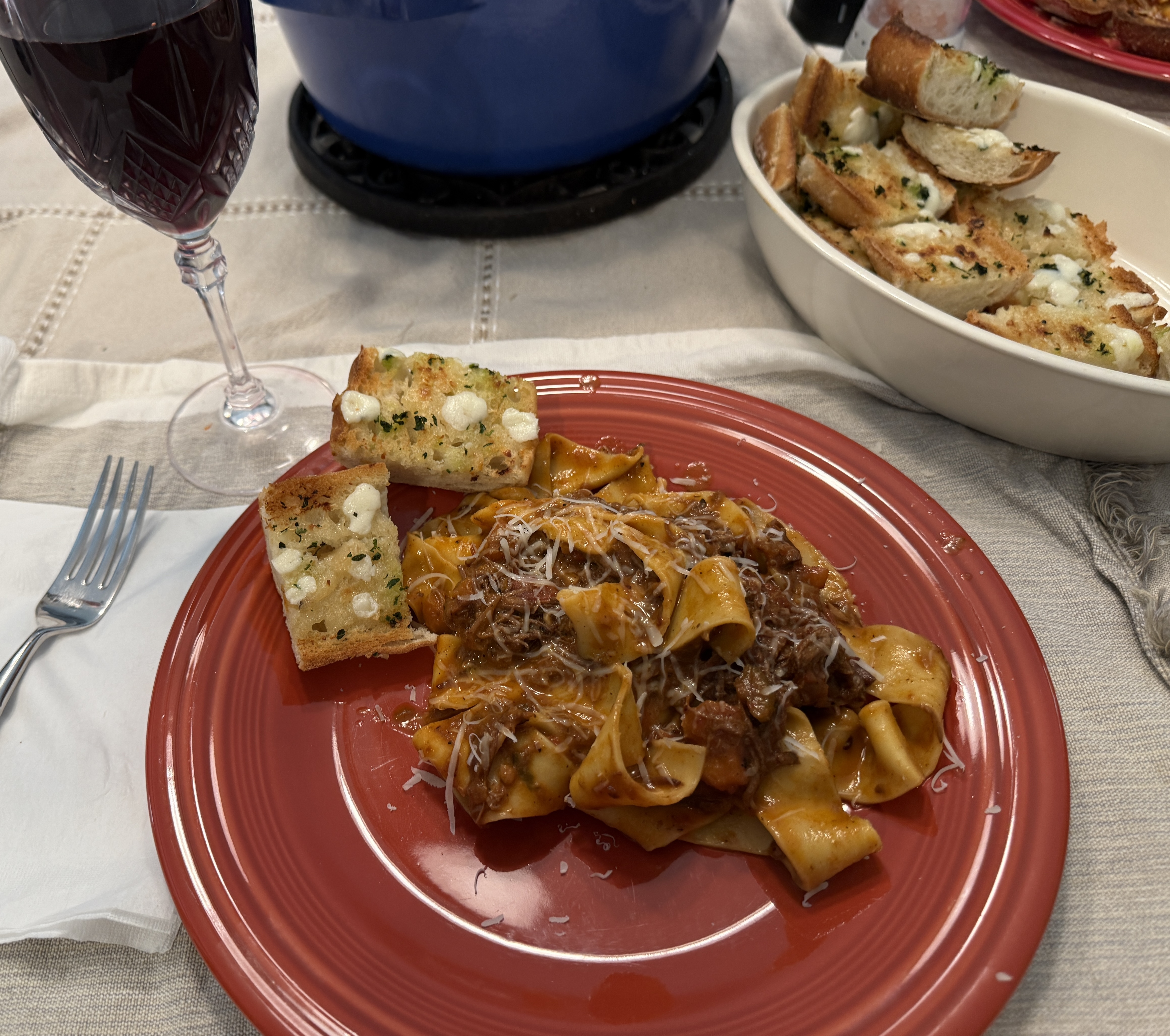 Decided short rib ragu over fresh pappardelle was in order, along with cheesy garlic bread.