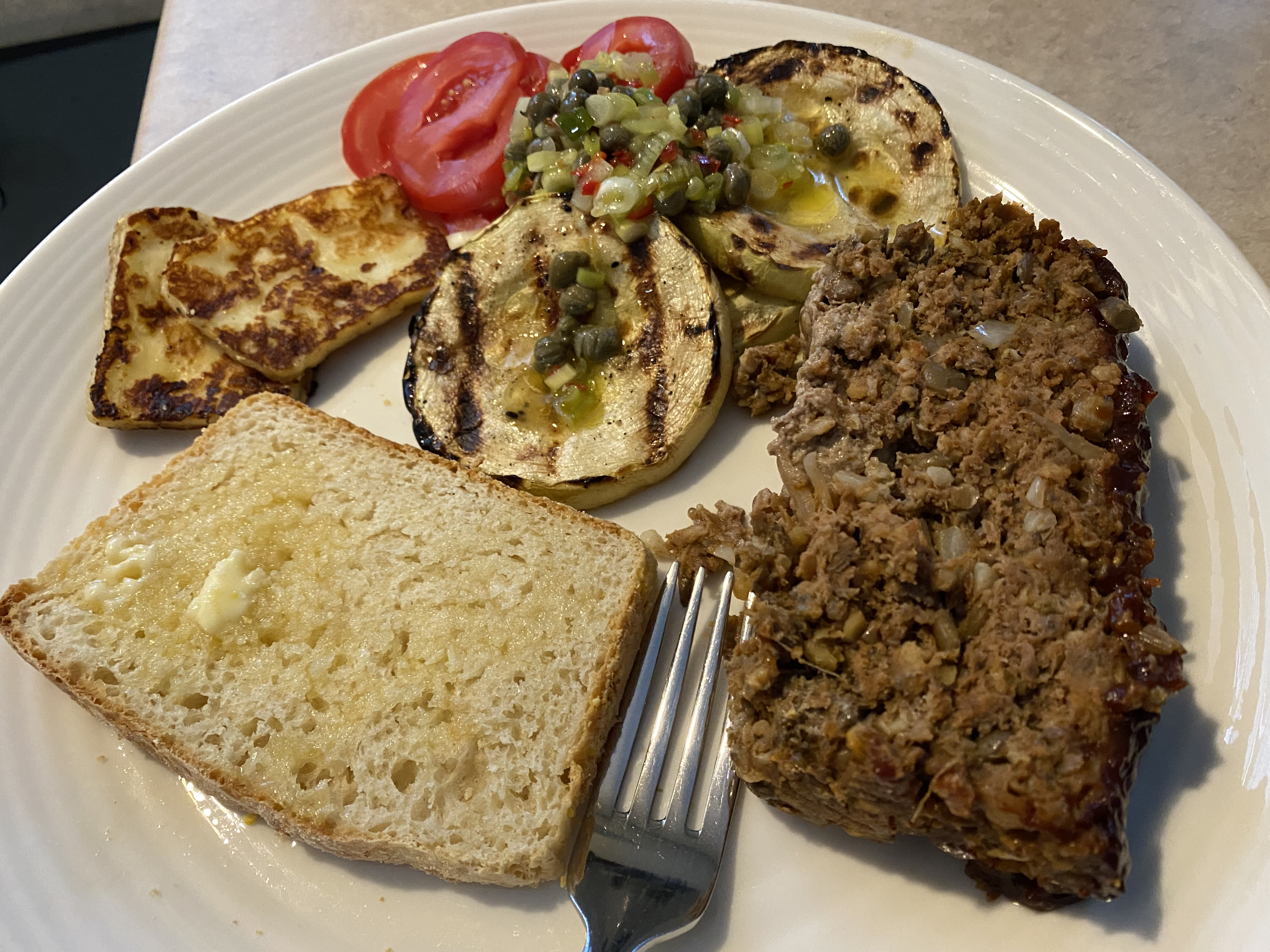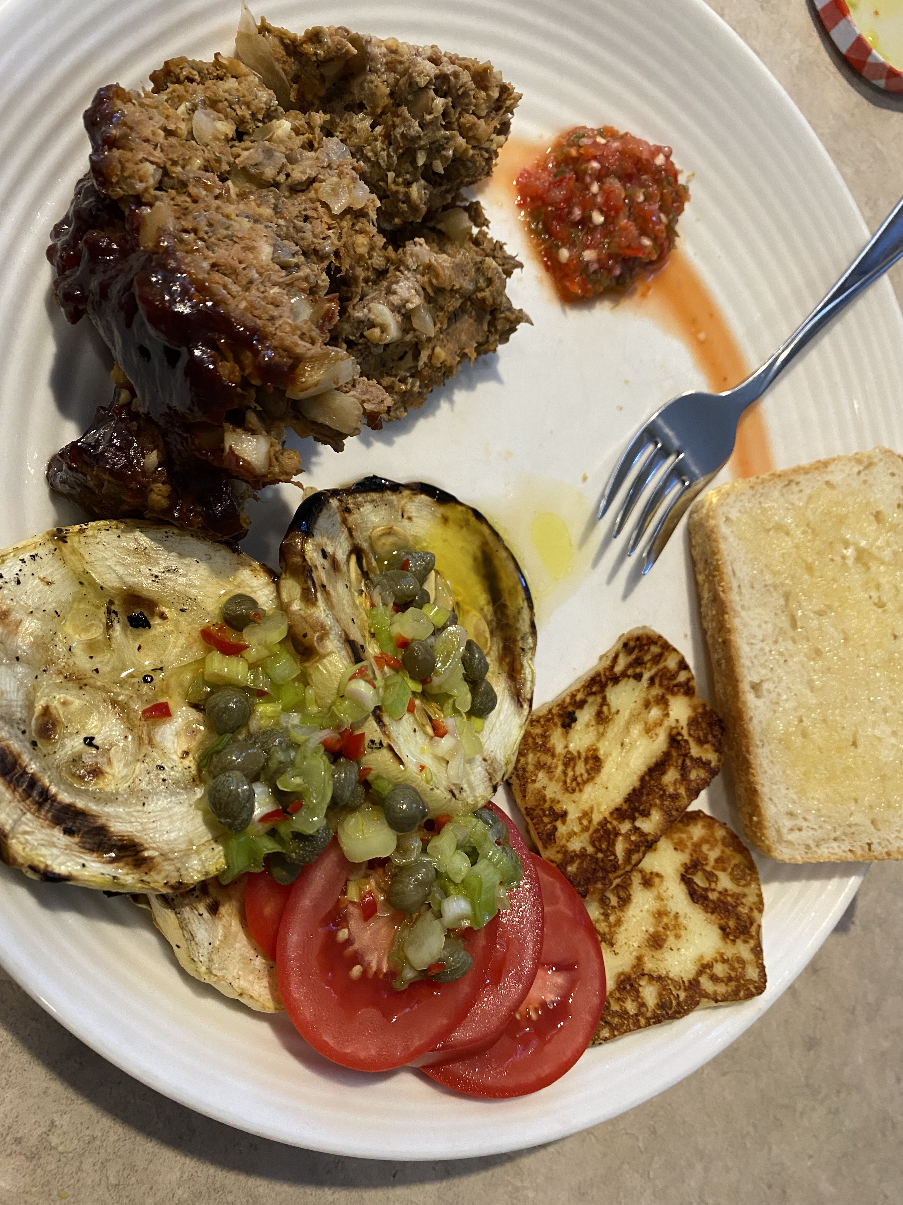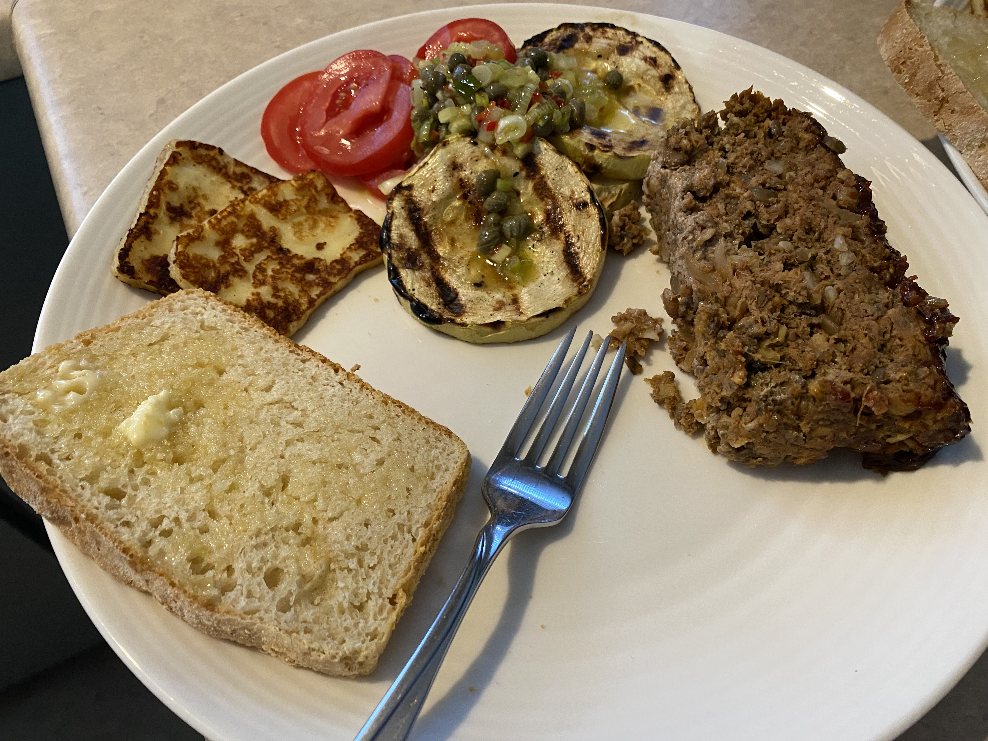 Meatloaf, bread and grilled courgette and halloumi salad with caper and lemon dressing