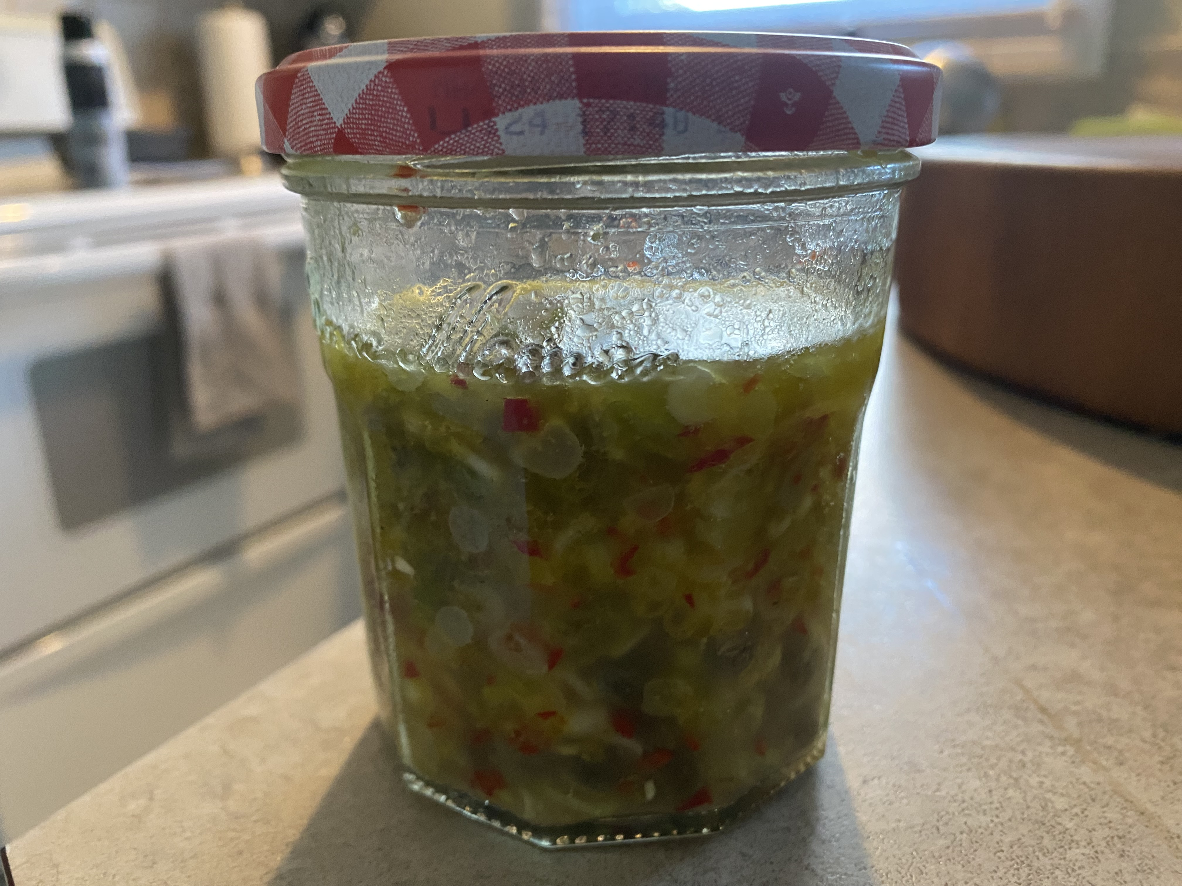 Neighbour graciously provided the zucchini, tomato and peppers. He drops off baskets of fresh veggies unexpectedly several times a week (“better to be lucky than good”).