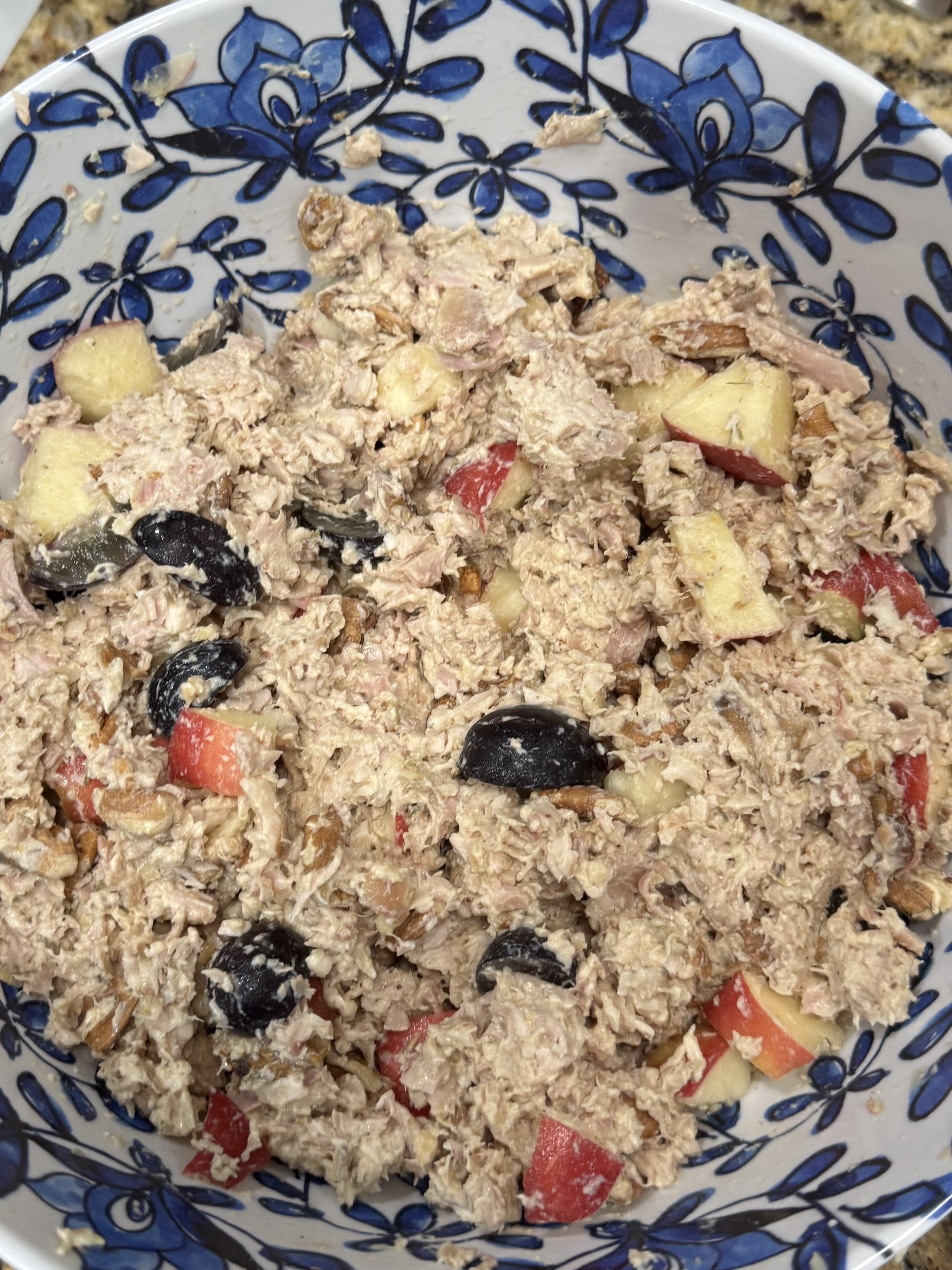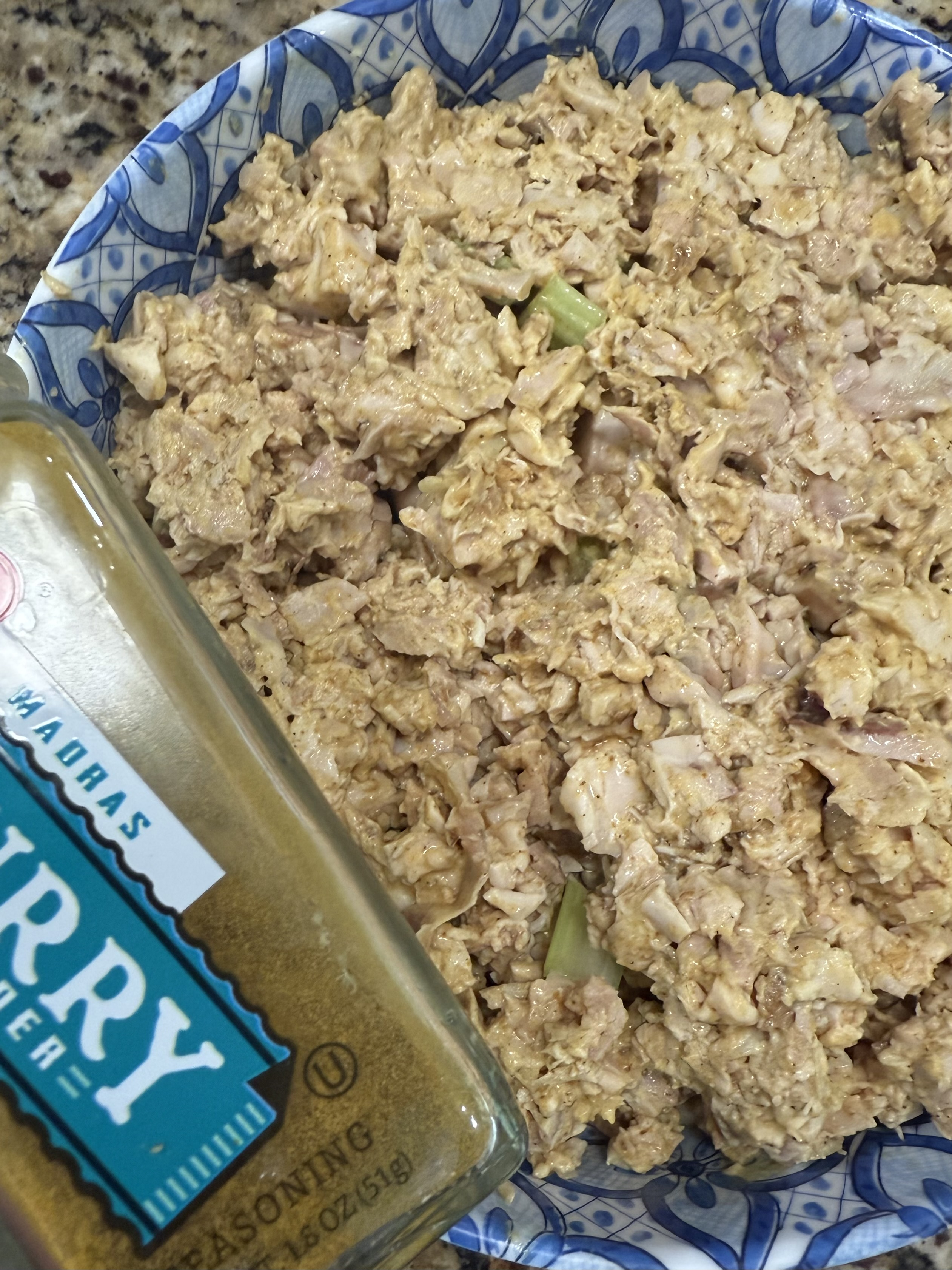 Chicken salad three ways, top to bottom traditional southern, yellow curry, and kinda Waldorf with black grapes, gala apples, and Brazos Valley pecans.
