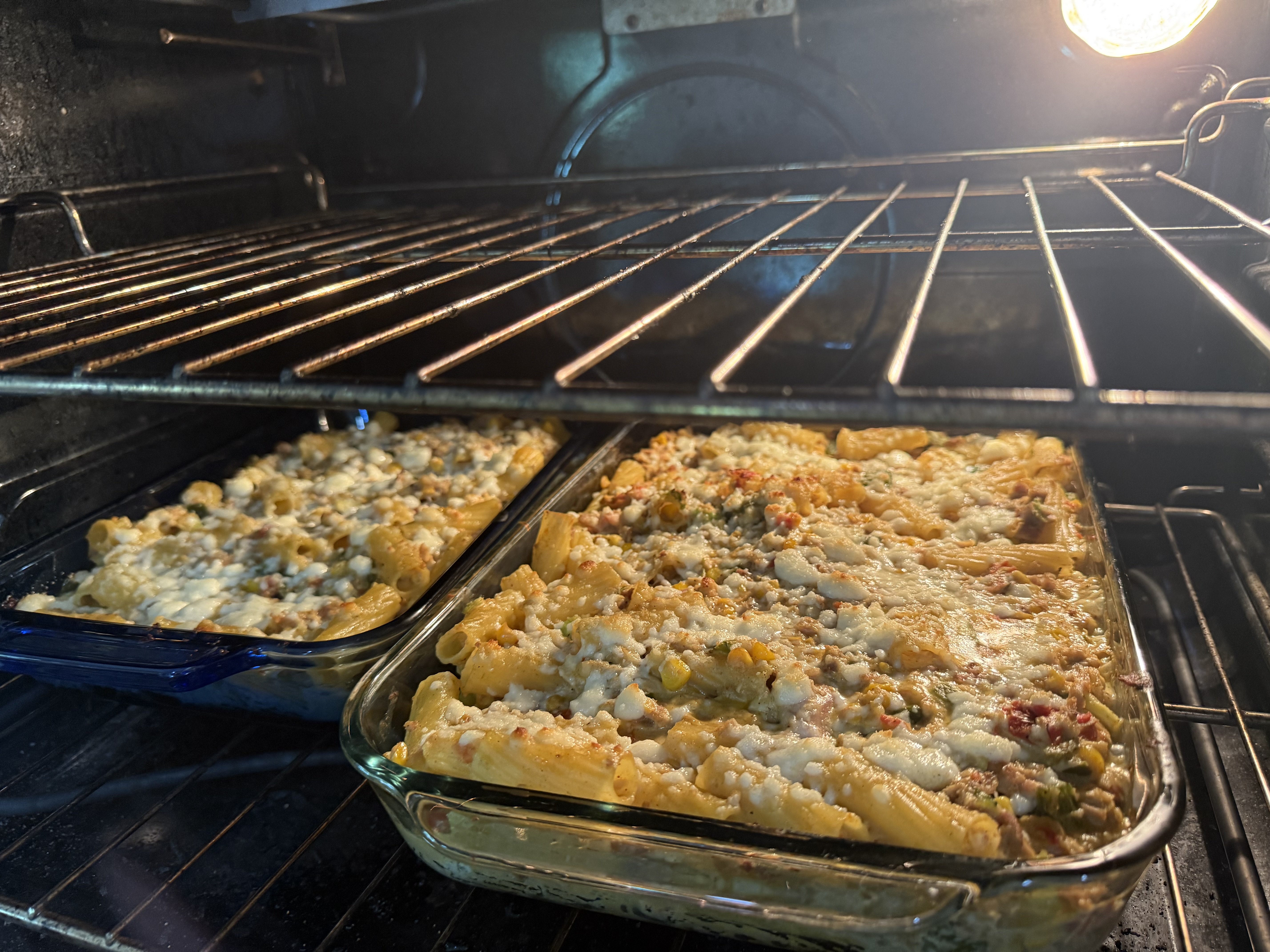 Well kids, I hate food waste so… I sautéed the leftover onions from the pulled pork with the elote chopped jalapeños in some olive oil, added the leftover corn and a can of Rotel with some extra cumin. Once it was cooked down I added the leftover southern and curry chicken salads and the leftover creama. Mixed that all together and stirred in a pound of cooked pasta that was then all baked with the leftover crumbled Mexican cheese. Perfect dinner for tonight and will make at least 10 frozen future lunches!