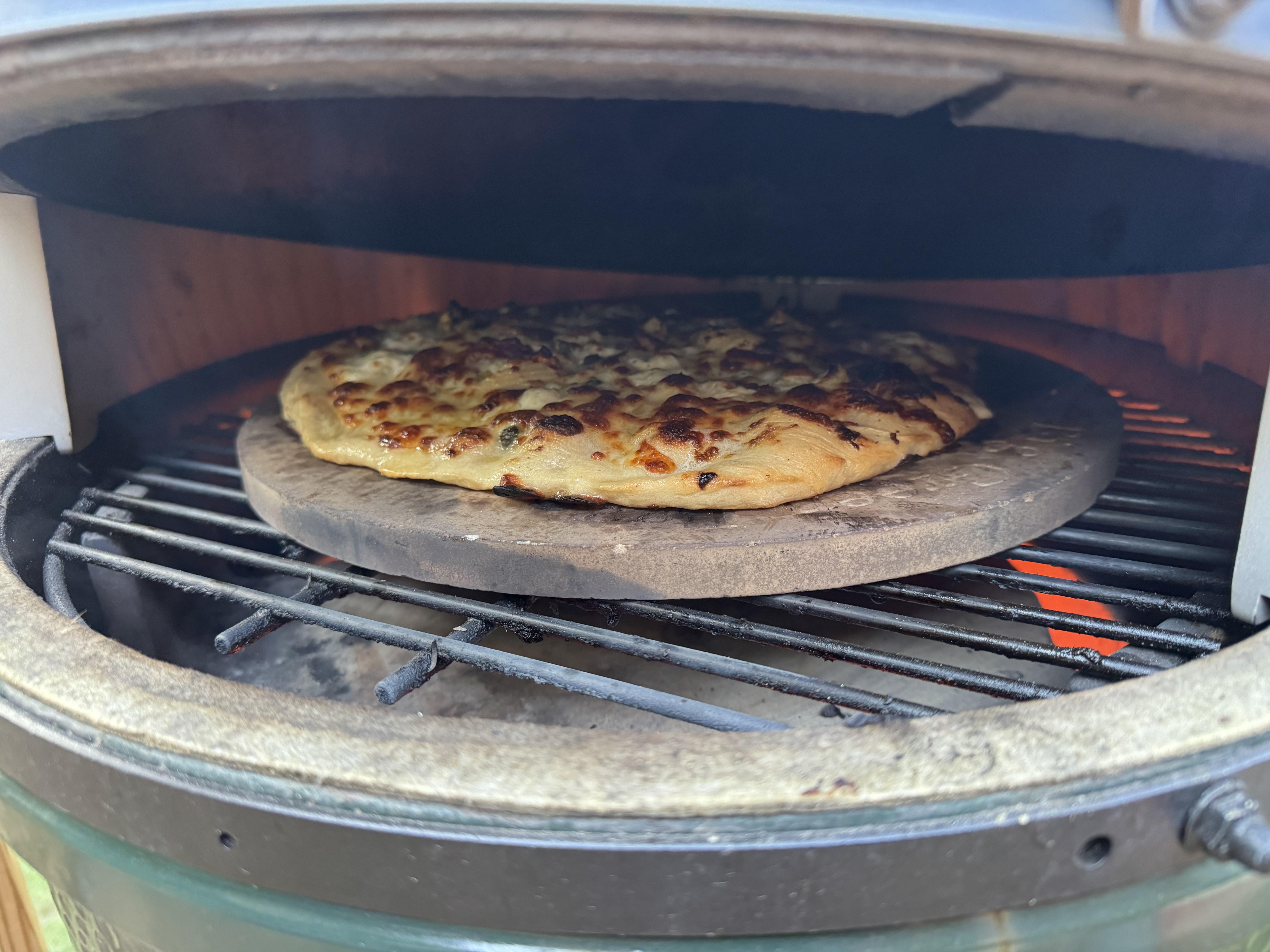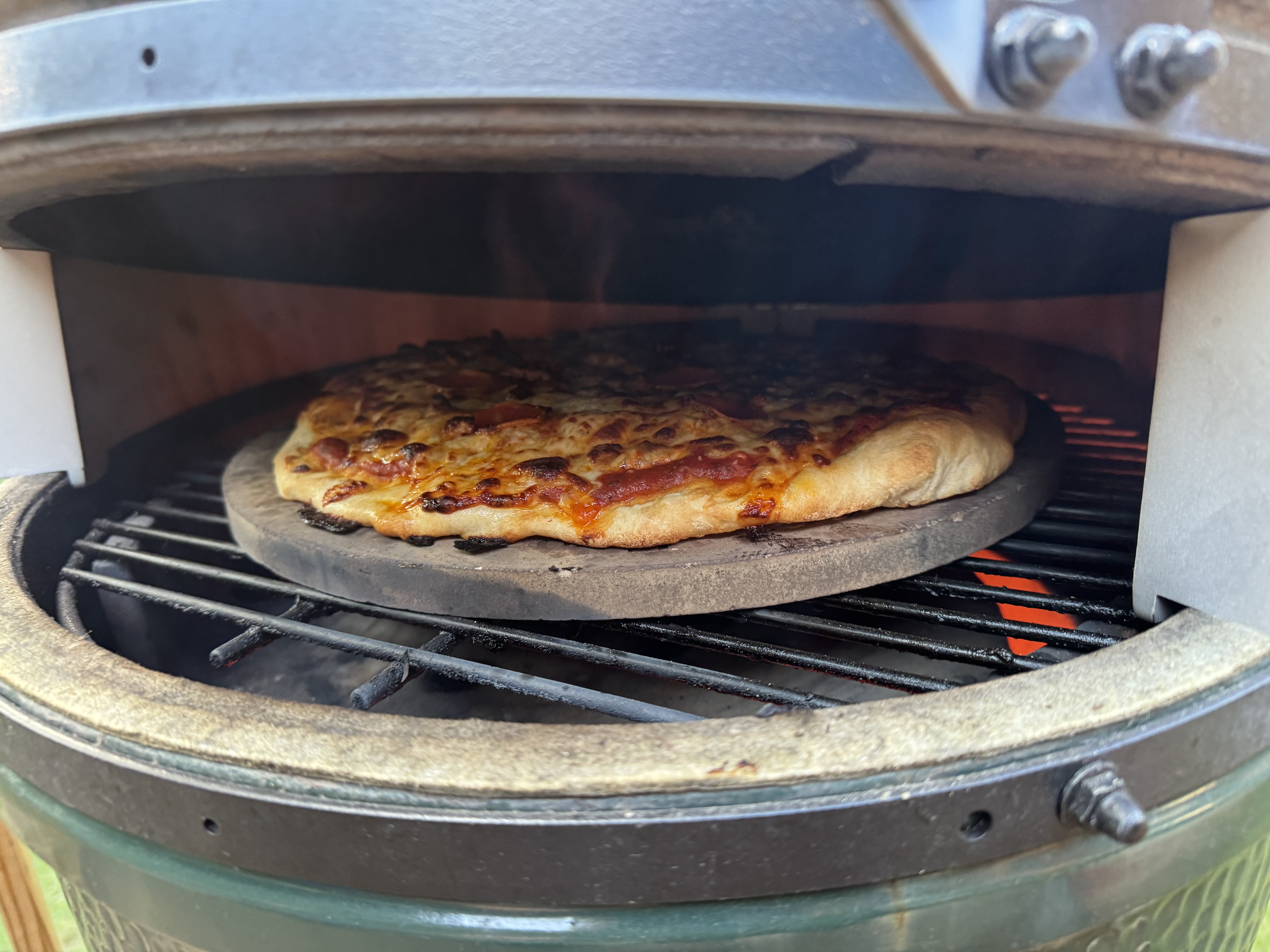 I leave the Egg at temp for 20 mins to allow the stone to absorb heat energy, this gives more spring to the crust as there is more energy transferred to the dough to allow rapid expansion of air bubbles. Also gives a crisper base.-----------------------------------------------------------------------