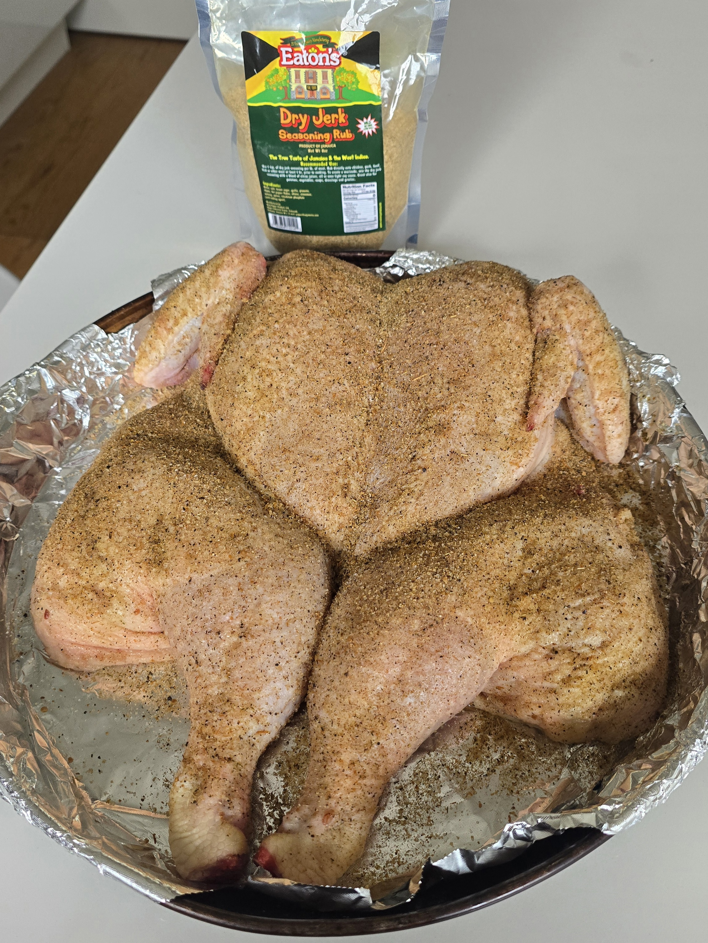 Trying a spicy Jamaican Jerk seasoning I got in a recent trip on this really fat chicken (a capon I should say).