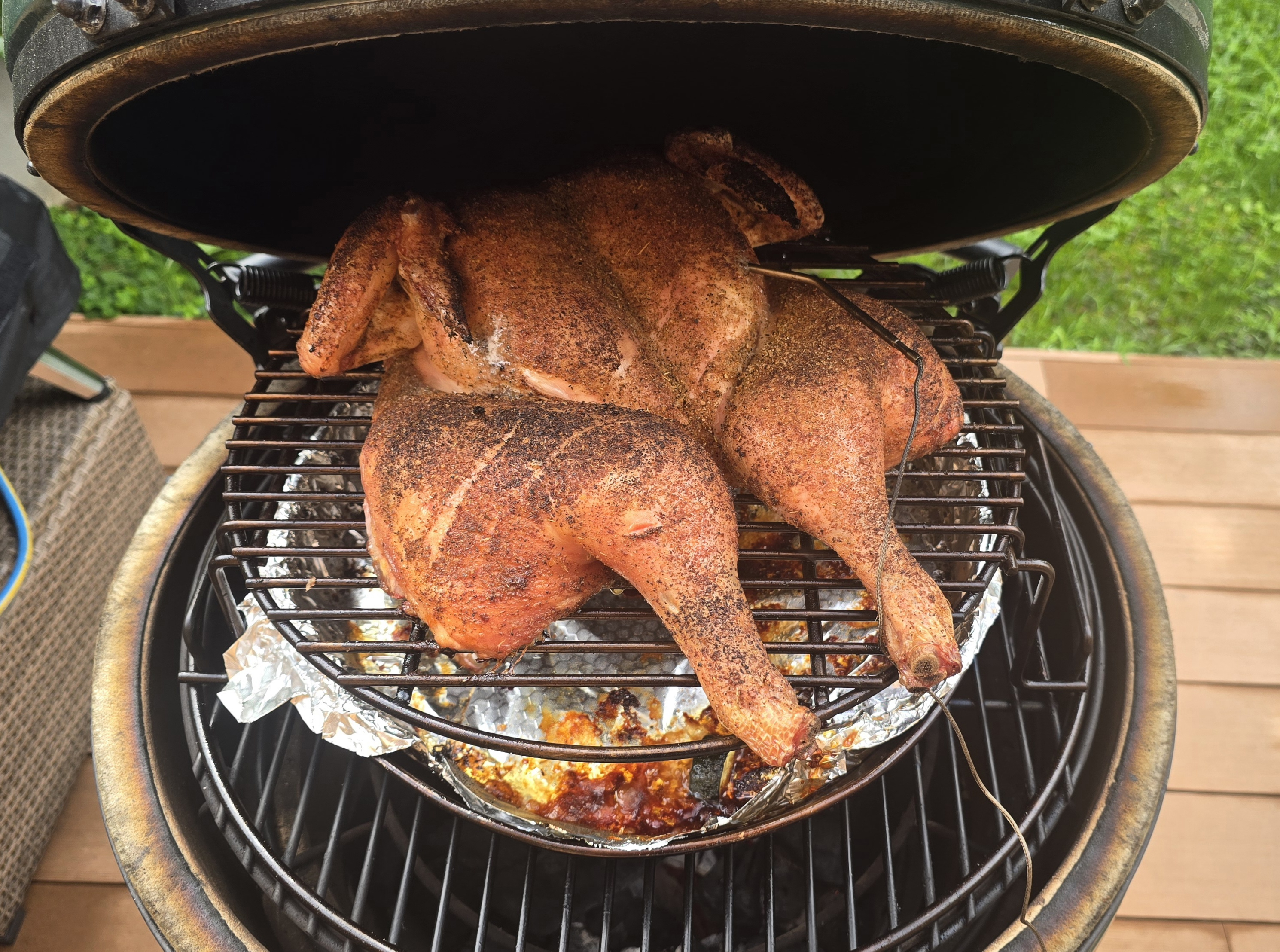 That sure is a fat chicken!Large Egg with adjustable rig, Kick Ash Basket, Minimax and various Weber's.