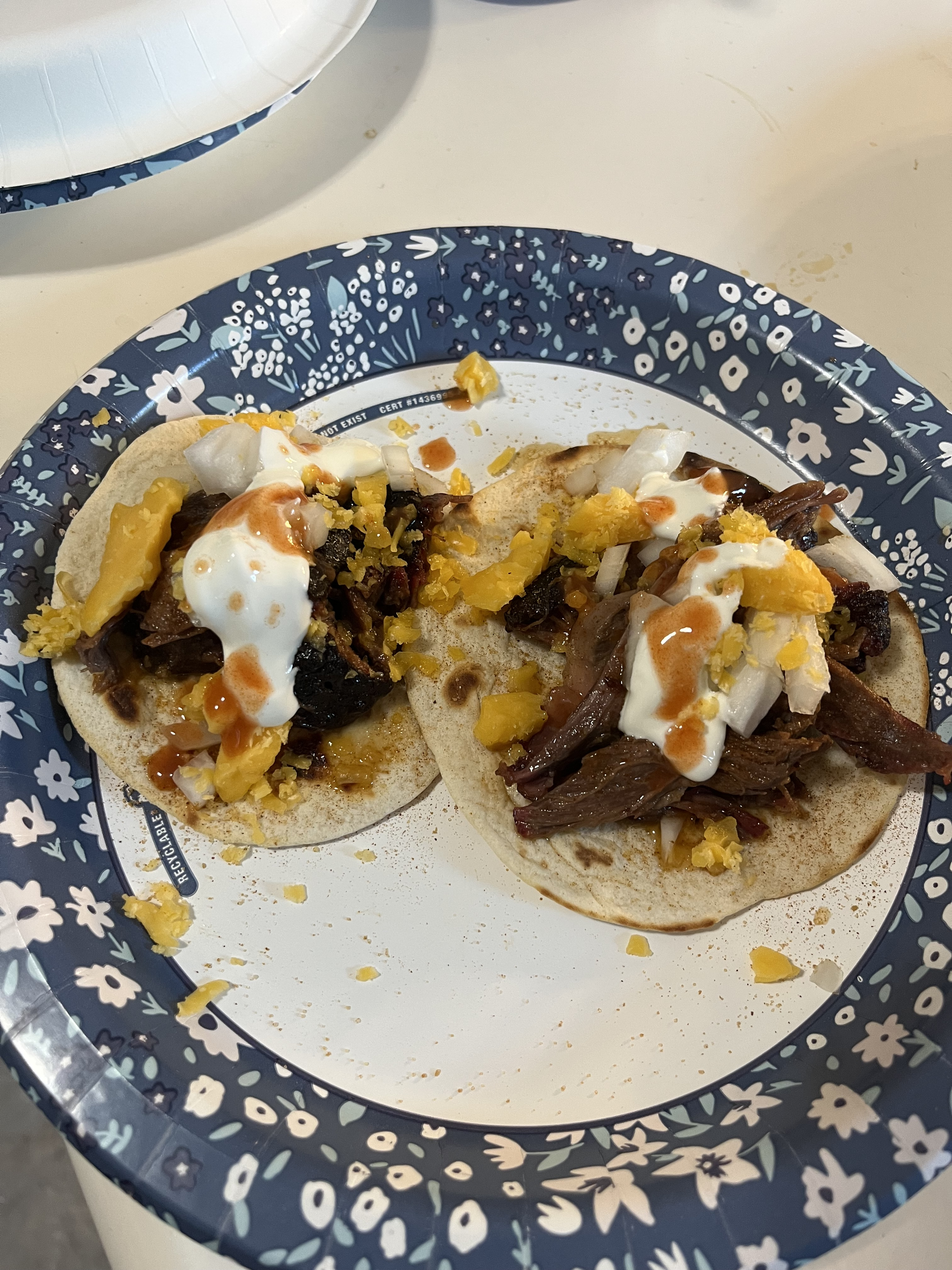 A short rest and it shredded easily with a fork. I added some, pepper, garlic, and other seasonings to boost the taco flavor I grilled up some tortillas and made a taco bar with shredded cheddar, sour cream, hot sauces, diced onion and lettuce. I was out of tomato and the store had no jalapeños, go figure.