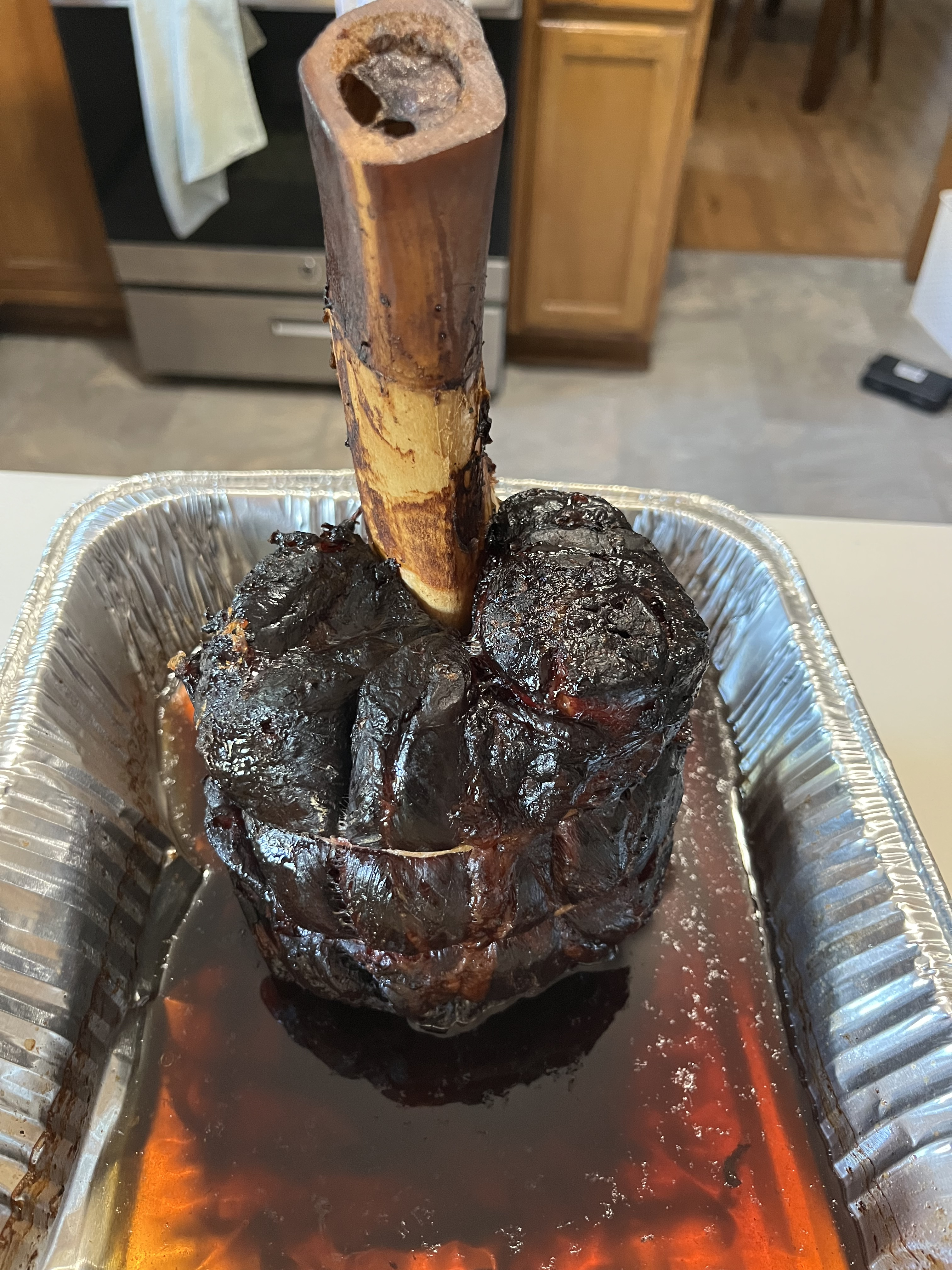 I then braised it in beef stock and covered with foil and bumped the temp up to about 325-350 for about 4 more hours until it was probing tender.