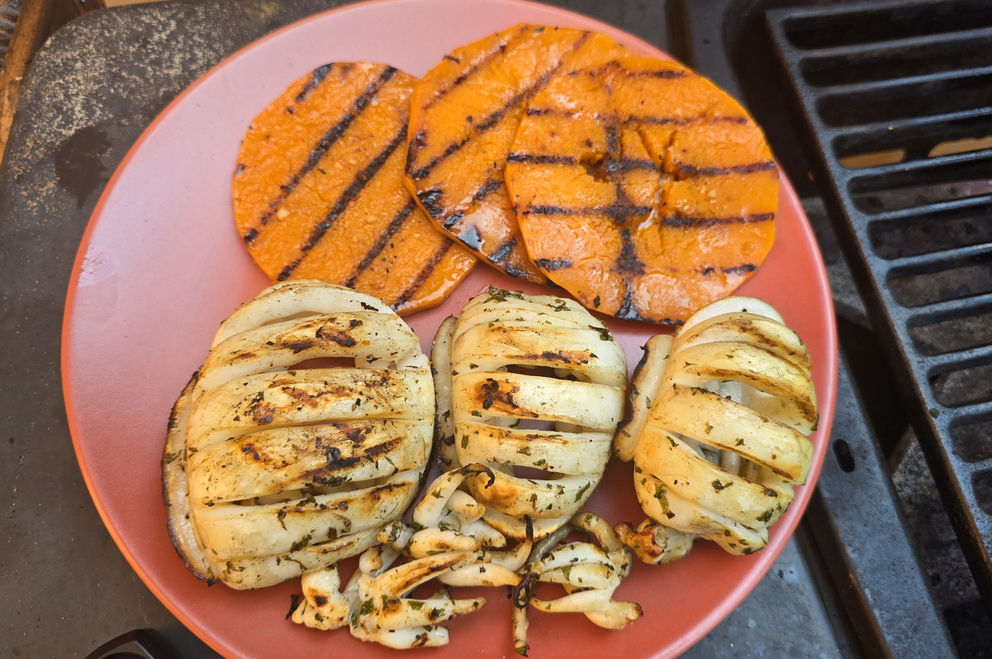 As usual not everibody loves meat so I did some cuttlefish and pumpking on the gas grill.