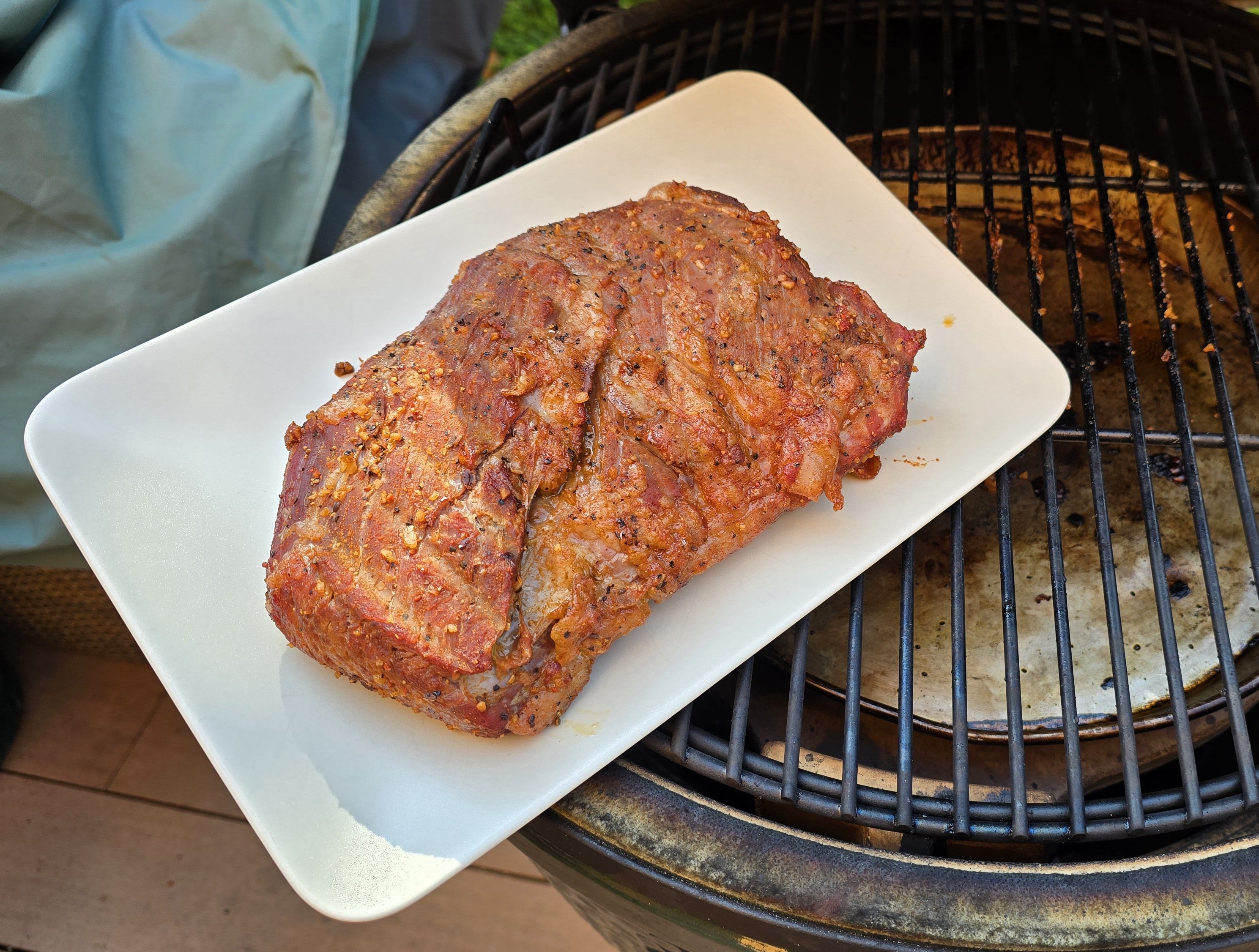 Fired the egg and went indirect at 250 F until 120 F internal (I remembered to flip the meat with grease side up after taking the photo).