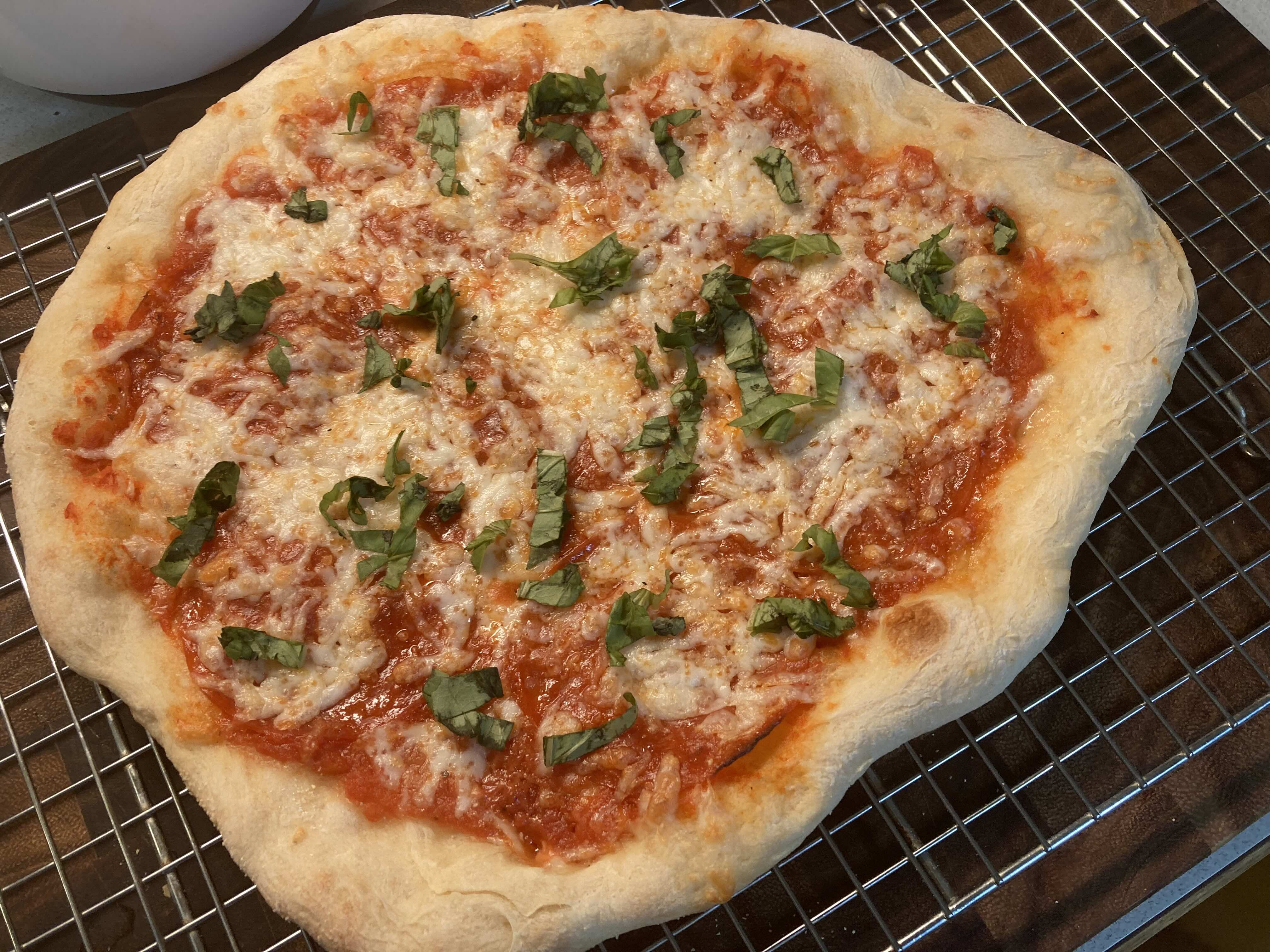 My second pie today went about the same, with some mods per the ATK video posted above (I didn't read the CI recipe beyond the sheet-pan overnight rise, as I use round Tupperware bowls; today I tried the semolina for dusting; it released fine but was a bit gritty at the bottom.  Baked for 8 vs 7 minutes on a stone, and I got proper leoparding on the bottom and top of the crust, but the crust was still kinda compacted.