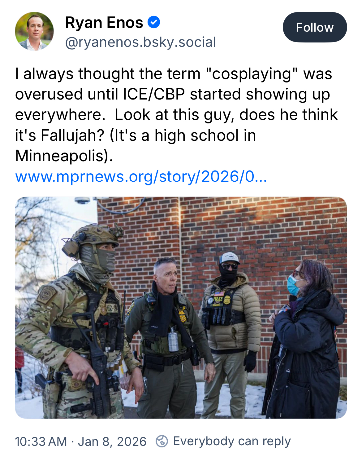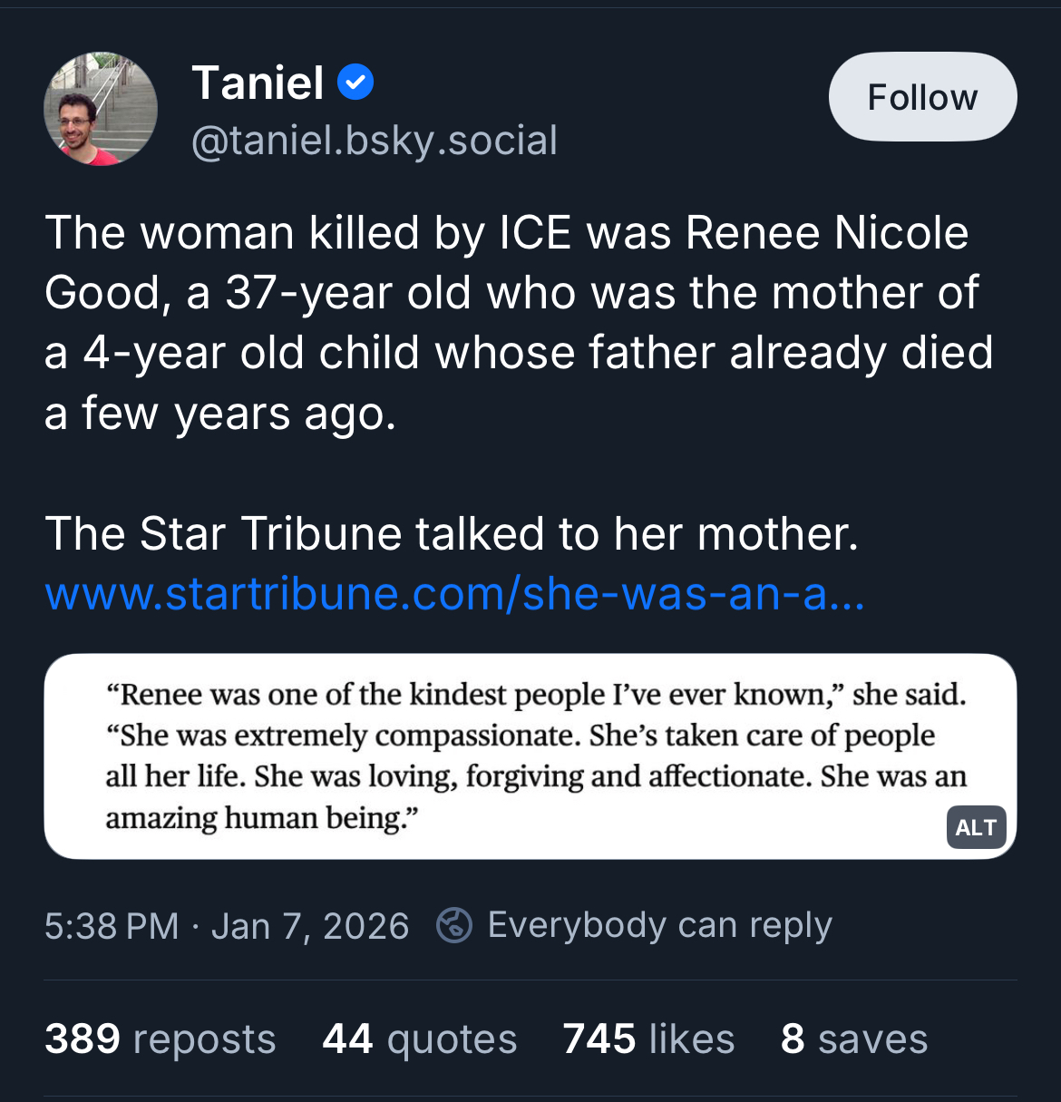 Also horrific is the administration’s characterization of what occurred. She tried to flee agents who were attempting to open her car door and in doing so, was clearly turning away from the agent who ultimately shot her. Not how it’s being portrayed.There will be mass unrest in Minneapolis.so if this nice woman was standing on an iced road and the officer lunged forward and hit her with his car, that would be ok