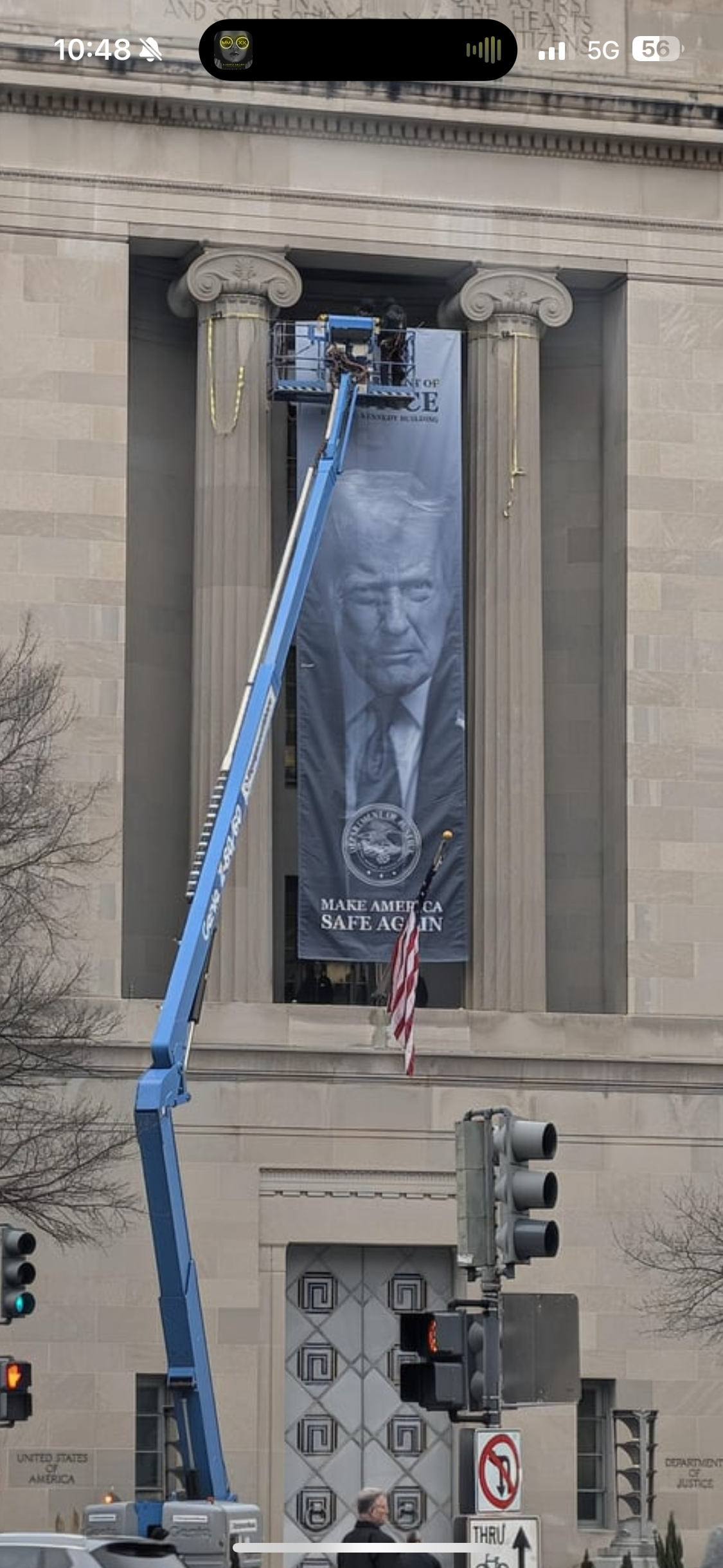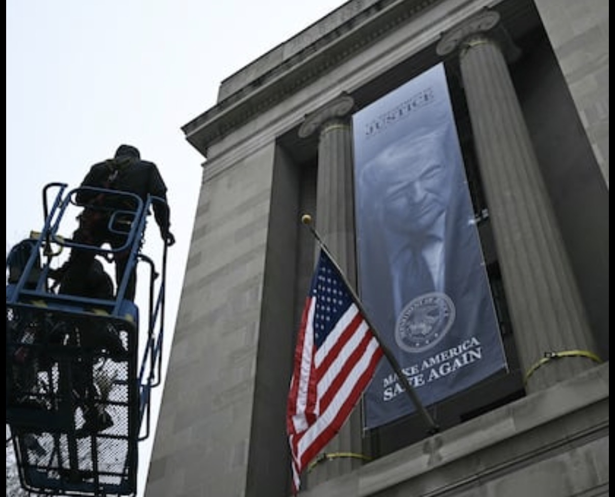 New banner outside the DOJ.
