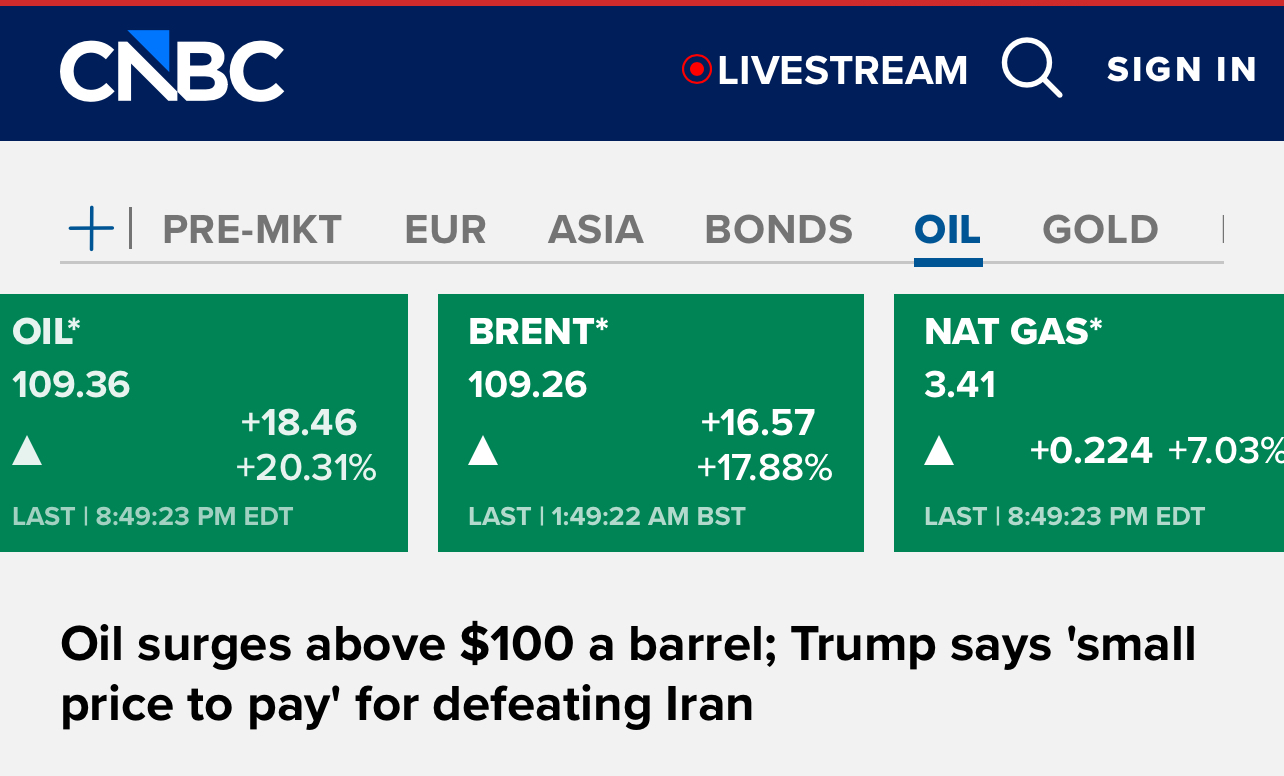 The biggest lever on oil prices right now remains the Strait of Hormuz. Traders might respond in the short term to positive signals from the Trump administration, but “as long as shipping is stopped the pain point remains,” Lipsky explained this evening. The number of ships passing through the waterway is now in the single digits, significantly down from the historical average of 138 ships a day. Millions of barrels that would ordinarily be supplying the world’s energy are just sitting around. At the same time, U.S. and Israeli strikes on Iran’s energy infrastructure are creating even more uncertainties for the Middle East’s oil supply, and Americans are already beginning to see the consequences at the pump. The average price of gasoline in the U.S. reached $3.48 a gallon today—up nearly 17 percent since the start of the conflict.