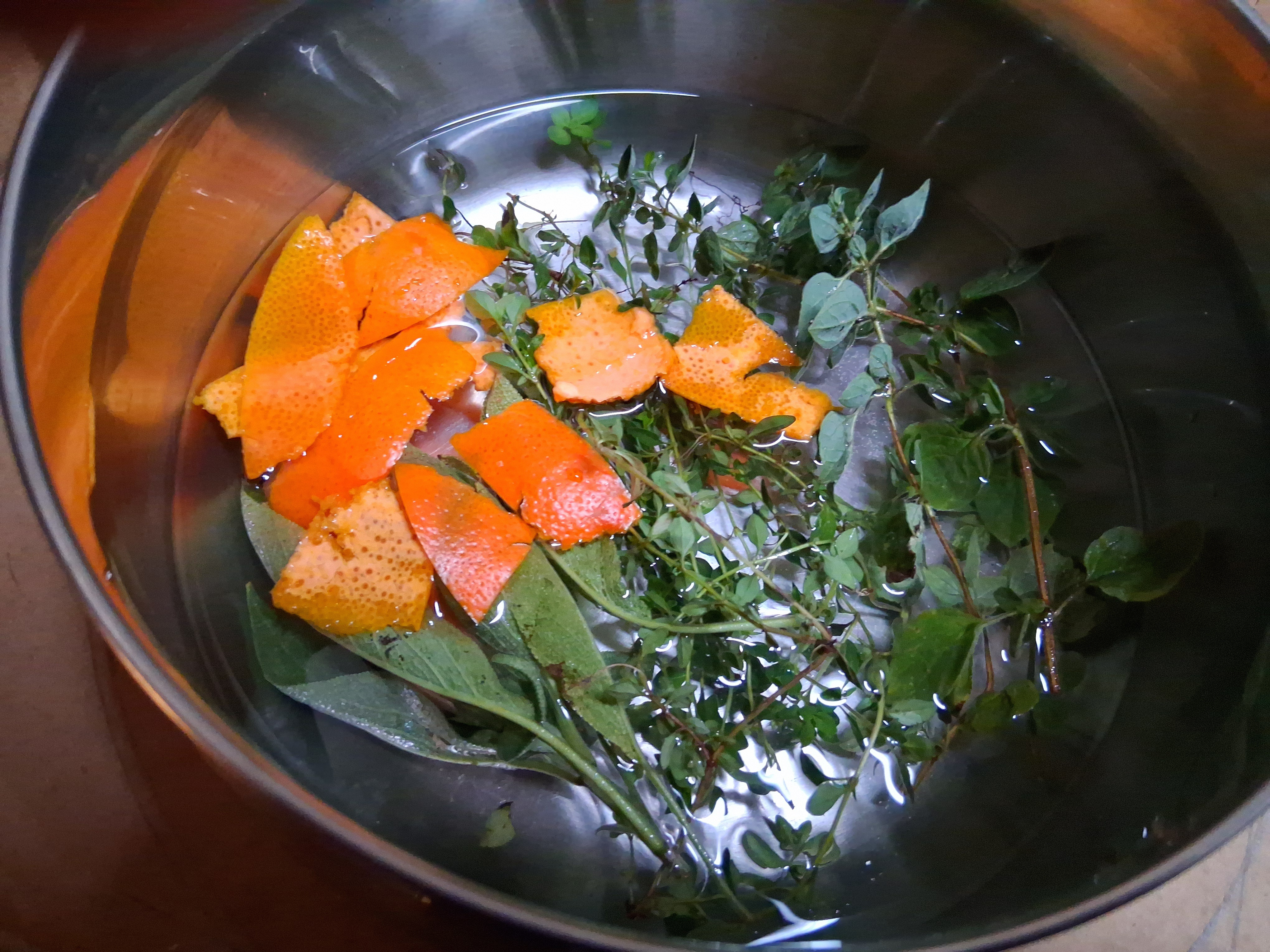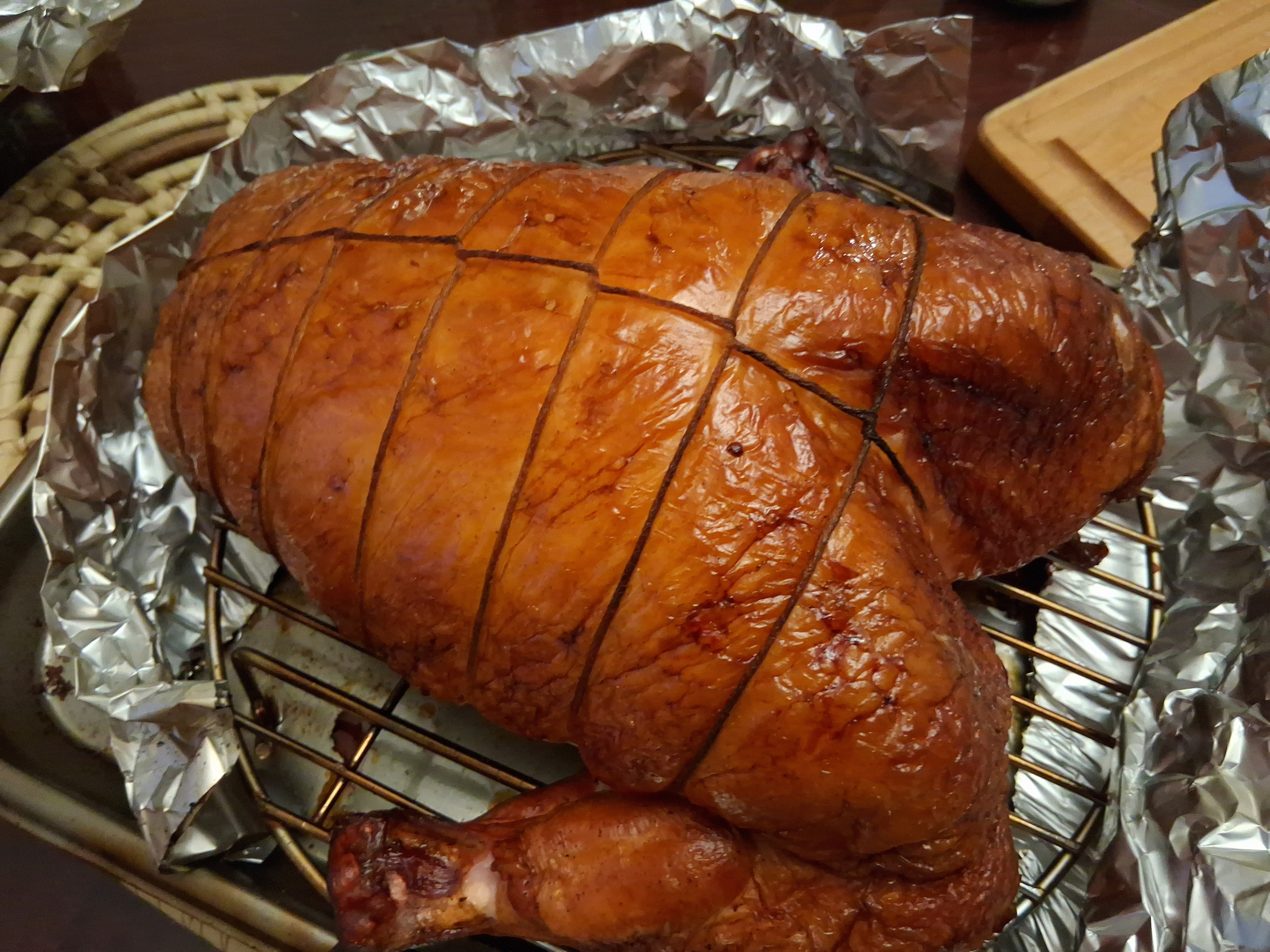 Tried something new with the turkey breast. Brewed a tea of garden herbs with mandarin orange zest, then added maple syrup, apple juice and ACV. No measurements at all.