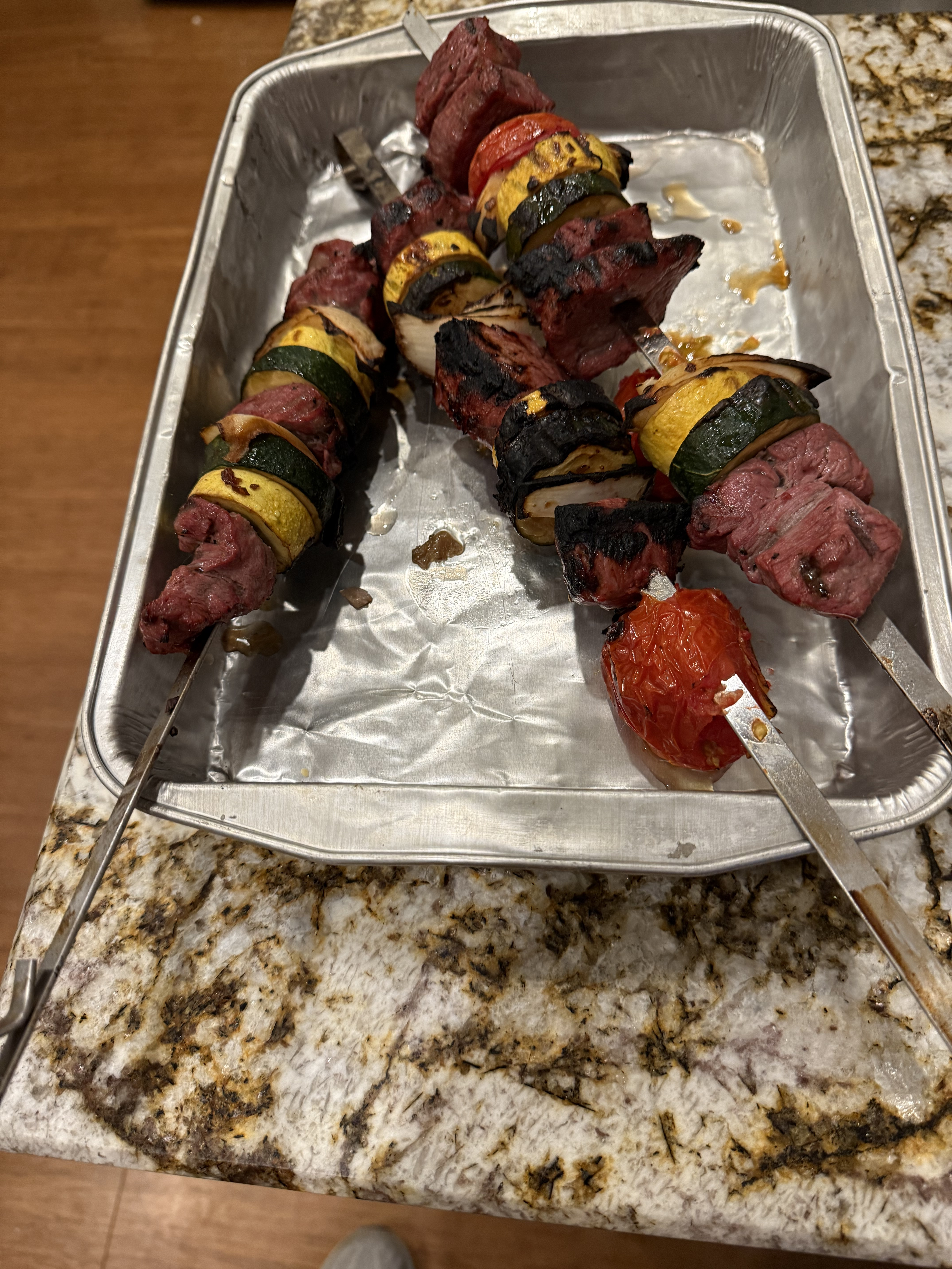 We used squash, onion, tomato, and zucchini marinated 2 hours. We marinated the beef in a garlic basalmic blend, and the vegetables in Dale’s and Italian dressing.
