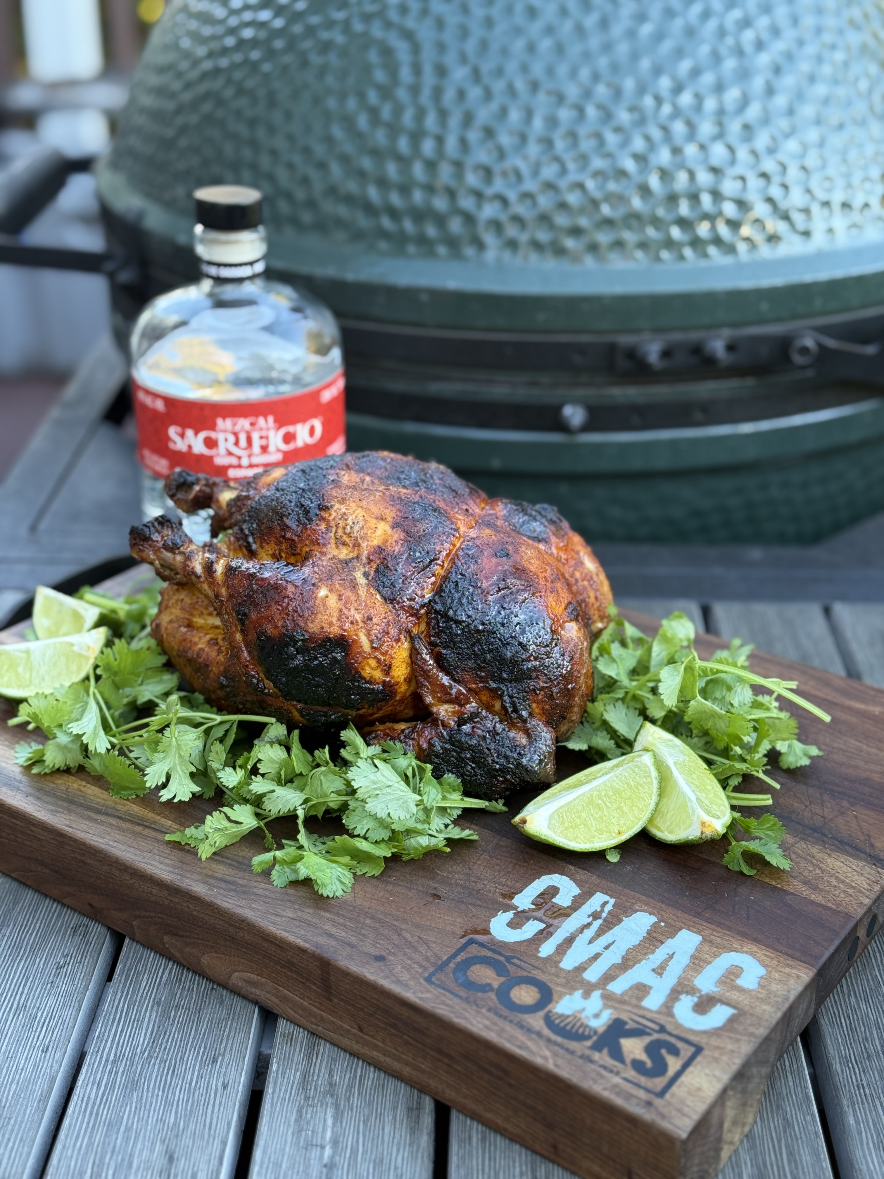 Most of you know that I’ve cooked on the new design a few times, but it’s been a while. So I just did a simple Mezcal marinated whole chicken and after about 3 hours at 350° (most of it with the dome closed), it was done.