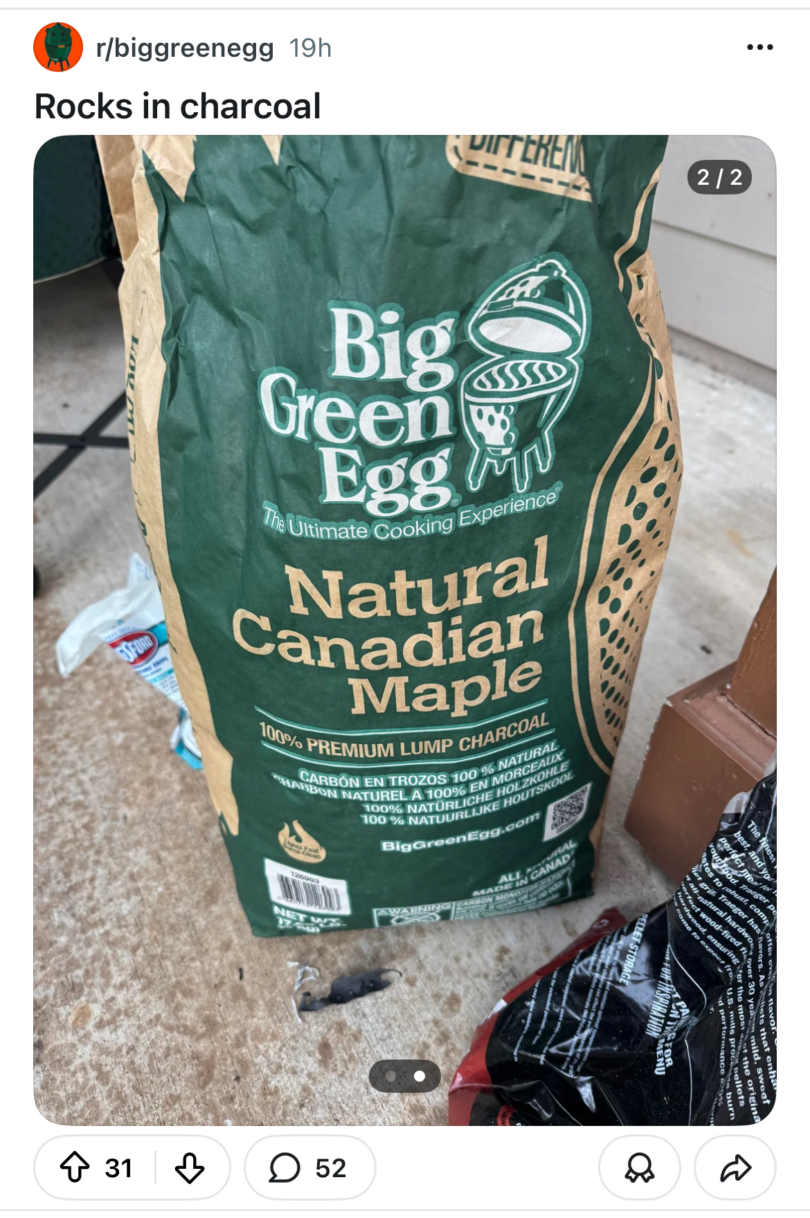 I have enough rocks from lump to build cairns on my way to the BGE in my backyard.I will never get lost, and when I fill my XL it will be with Rockwood.I tried a BGE bag of recent vintage, and it was ok, still have about a 1/3 of a bag left. I bought it several months ago. I bought it because at that time, around here, nobody had any Rockwood.Well my Ace bud set me up with a deal, for when they got some in. I gave him a ton of shït for several days straight, until he upped his game.I was ready to buy a truckload and sell it to them.Seriously, since I learned of Rockwood, as long as it is available, I will buy it over anything else. Rocks and all."Knowledge is Good" - Emil Faber