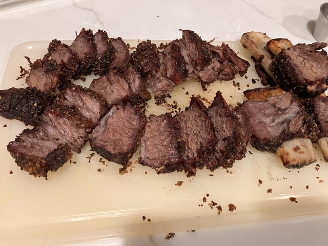 montreal steak seasoning rub (will the costco jug ever run out) and smoked with mesquite and cherry. went great with a bourbon barrel zinfandel