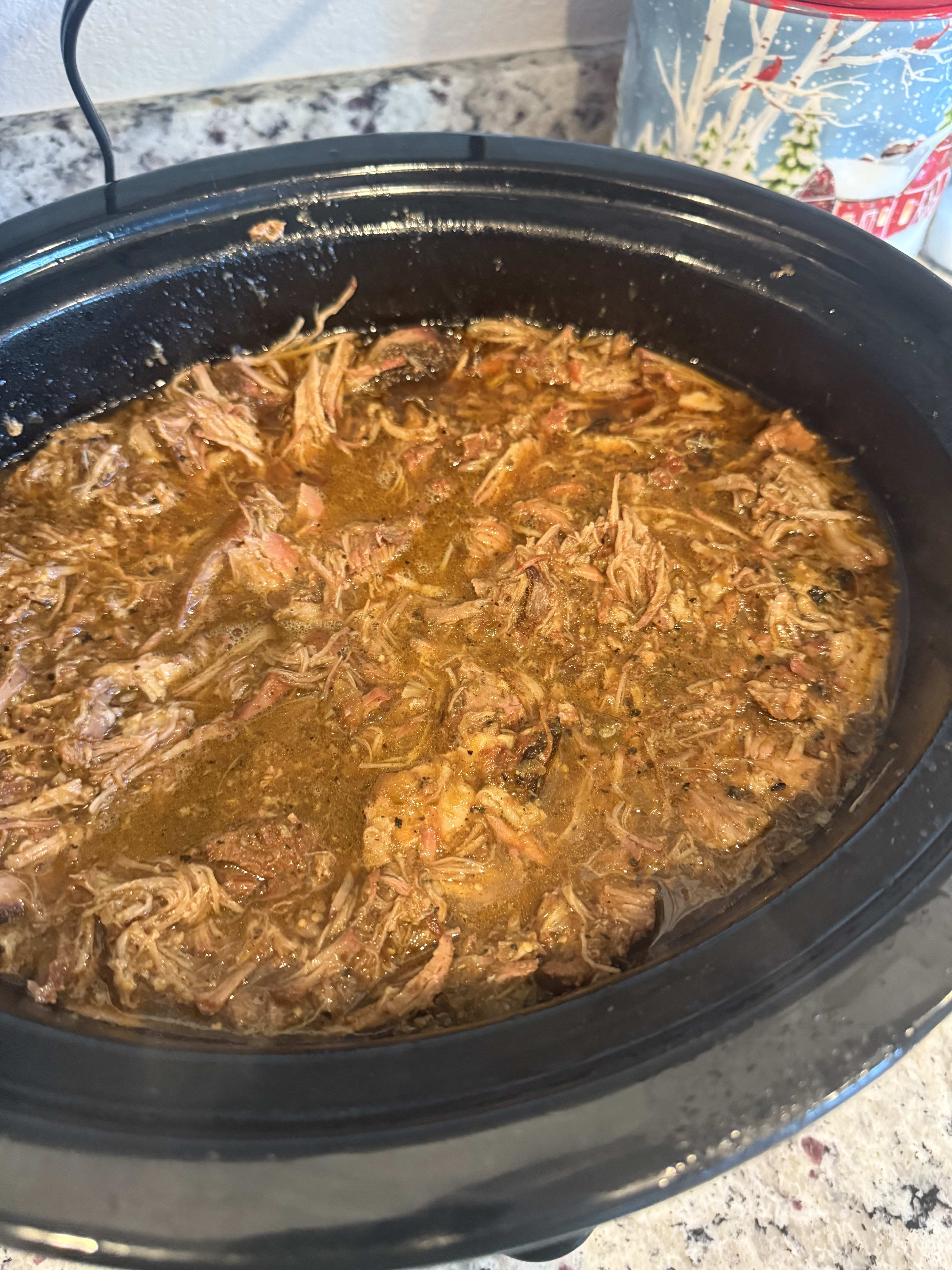 Then threw it all into the crockpot to braise. Forgot to take pics of the veggies going into the blender with some chicken stock, cumin, onion and garlic powder and a little cilantro. Ended up shredding the pork instead of leaving it chunky. My wife has some sort of meat aversion to chunked meat 🤷♂️.