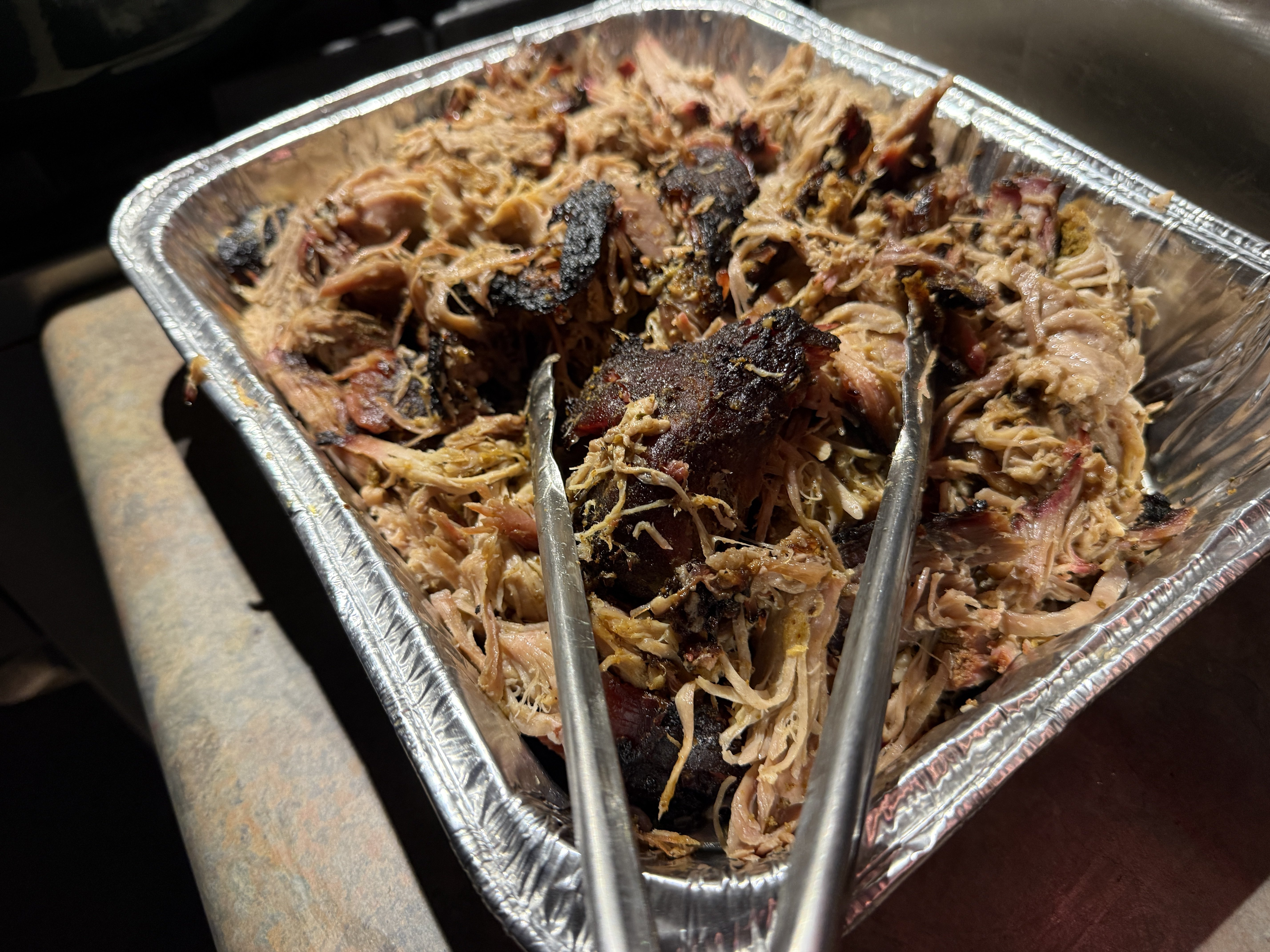 Pulled immediately and sitting covered in the fridge for tomorrow. Not ideal, but Stacey has already crashed out so we’ll see ….