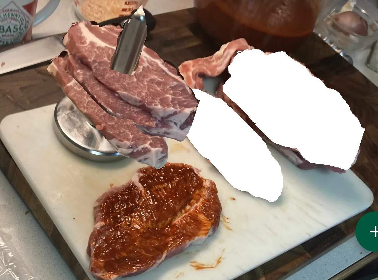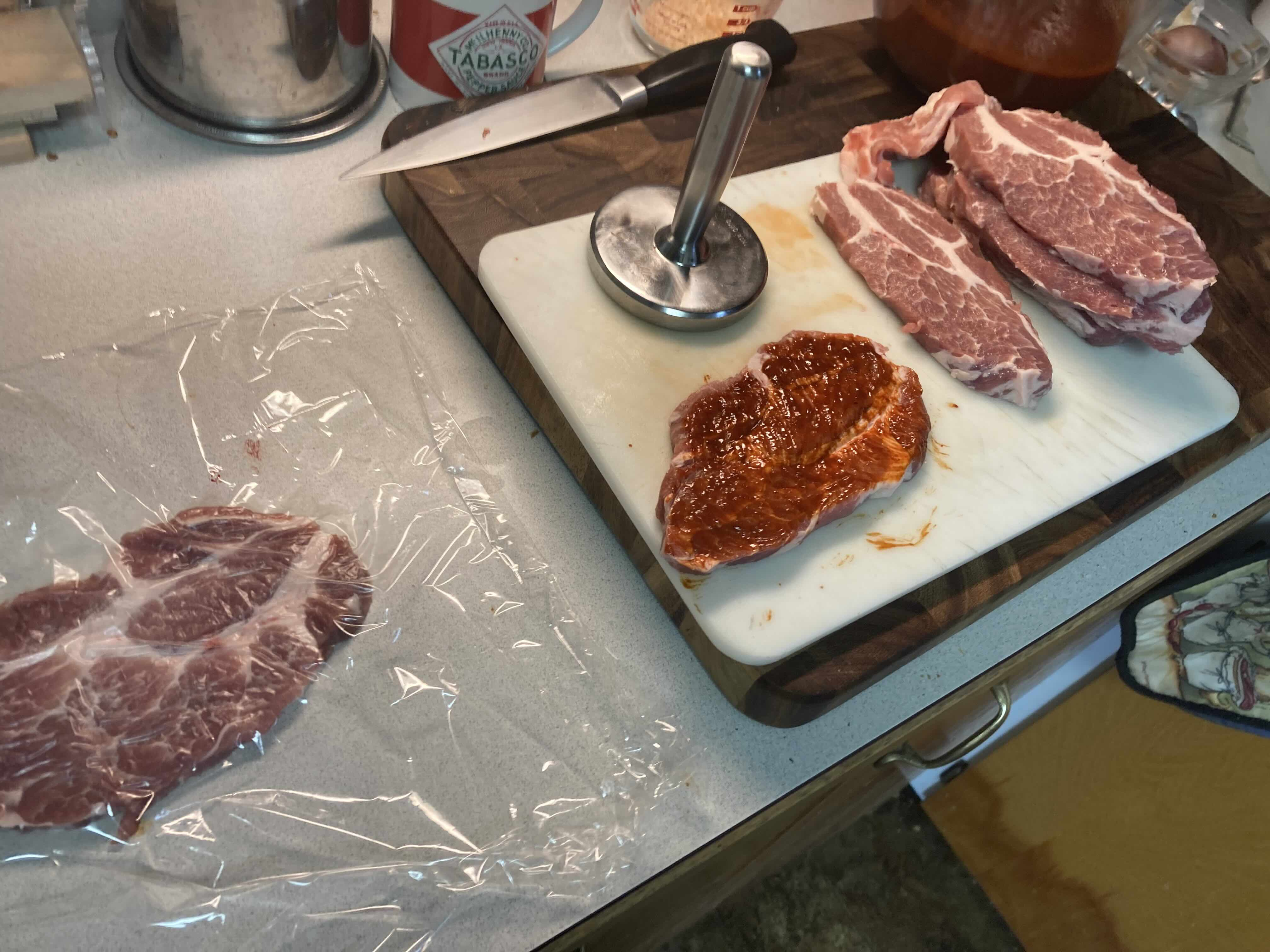 Then, Assembly Line Time.  I sliced a large pork roast into about 3/8" slices, pounded each one as thin as they'd go, paint both sides with the chile sauce, and marinate overnight.  Froze most of them, so I'm ready to go when I want pork tacos, and one slice was just enough for 3 tacos, my usual serving.