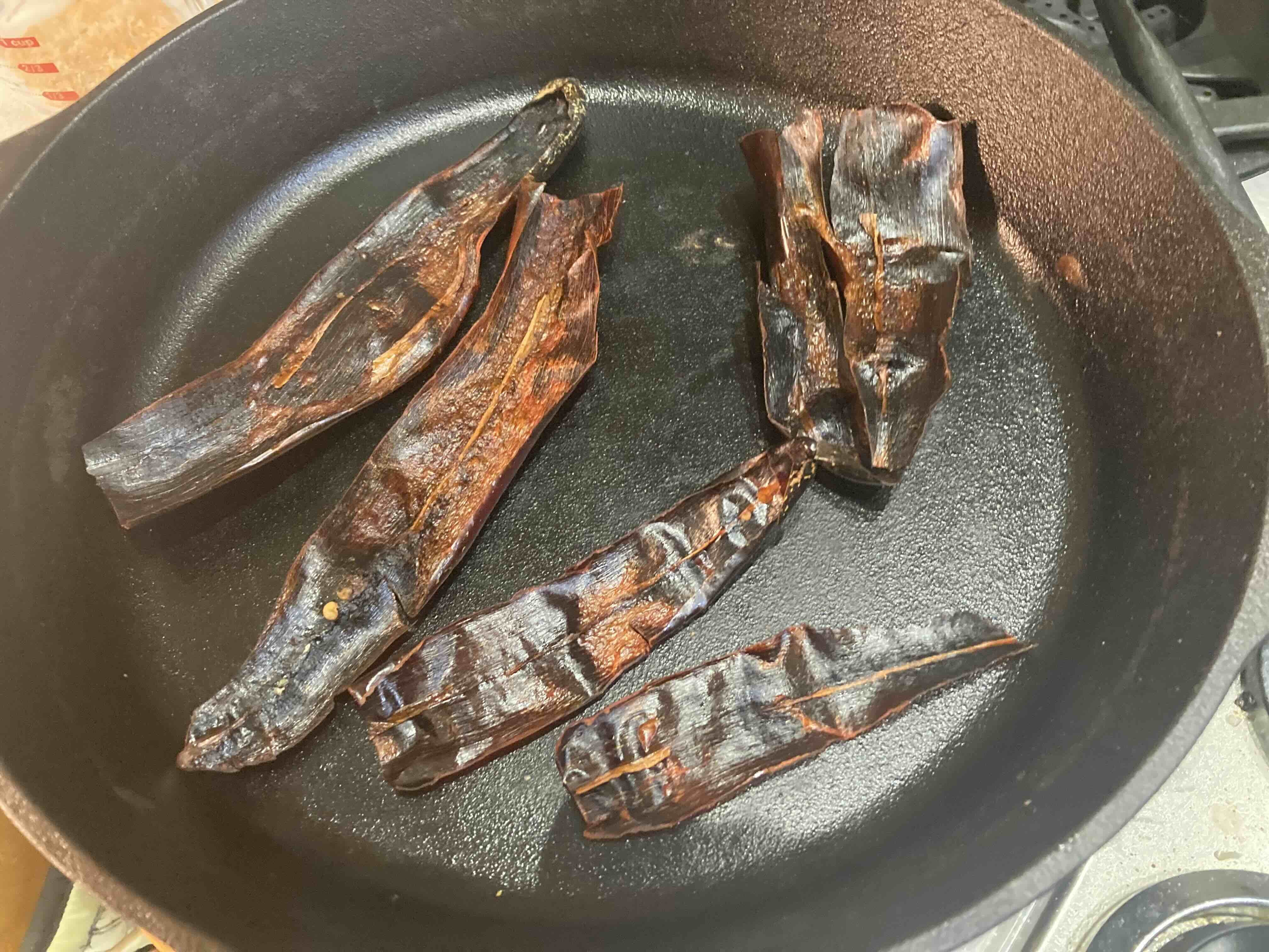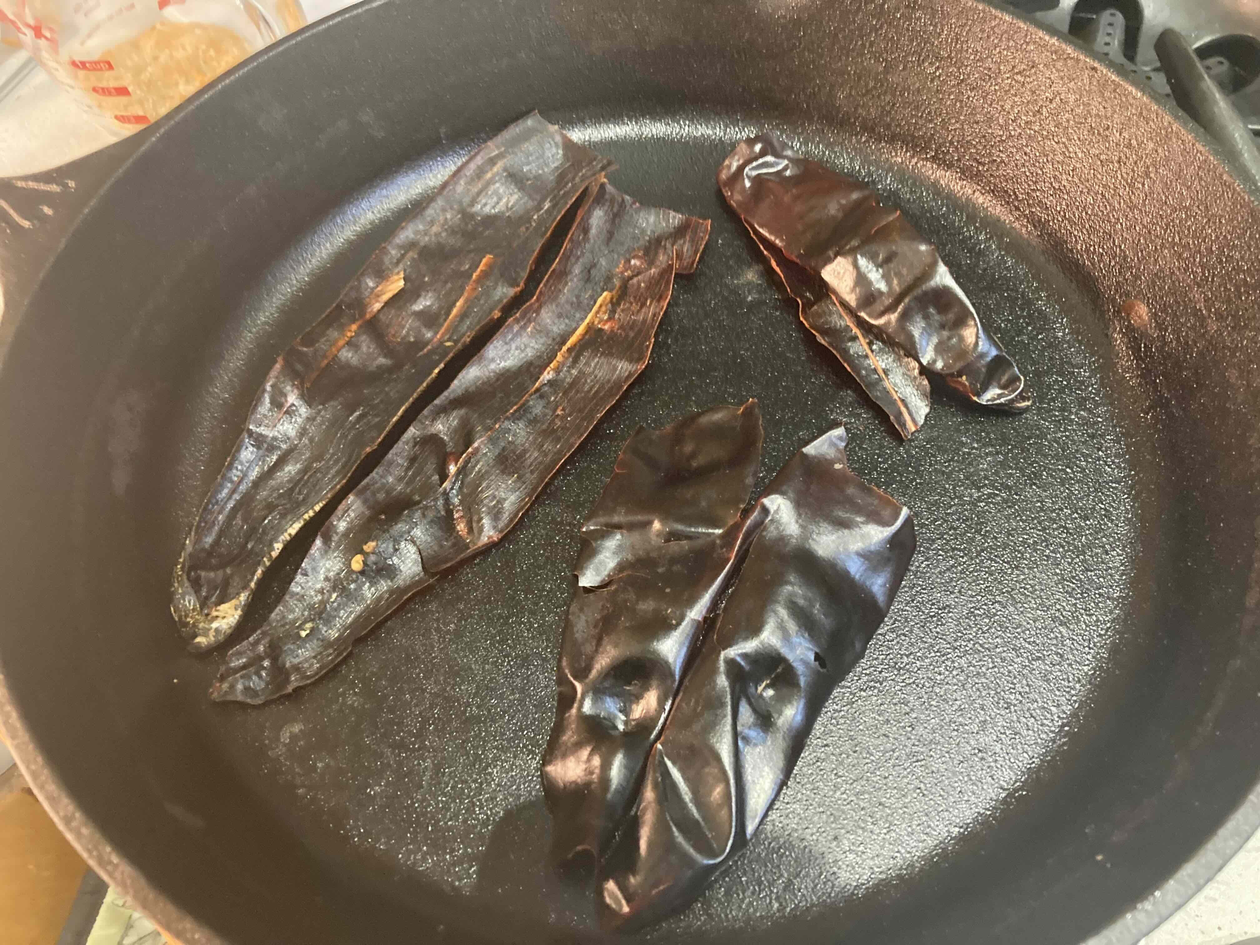 Instead of making my usual chile sauce from powdered chiles, I made it from the dried pods as my Commissary just started carrying them.  Seven guajillo chiles, 3 anchos and 3 de Arbols are my usual mix.  They're stemmed, seeded, cut along the side to lay flat, then toasted in a dry CI pan.