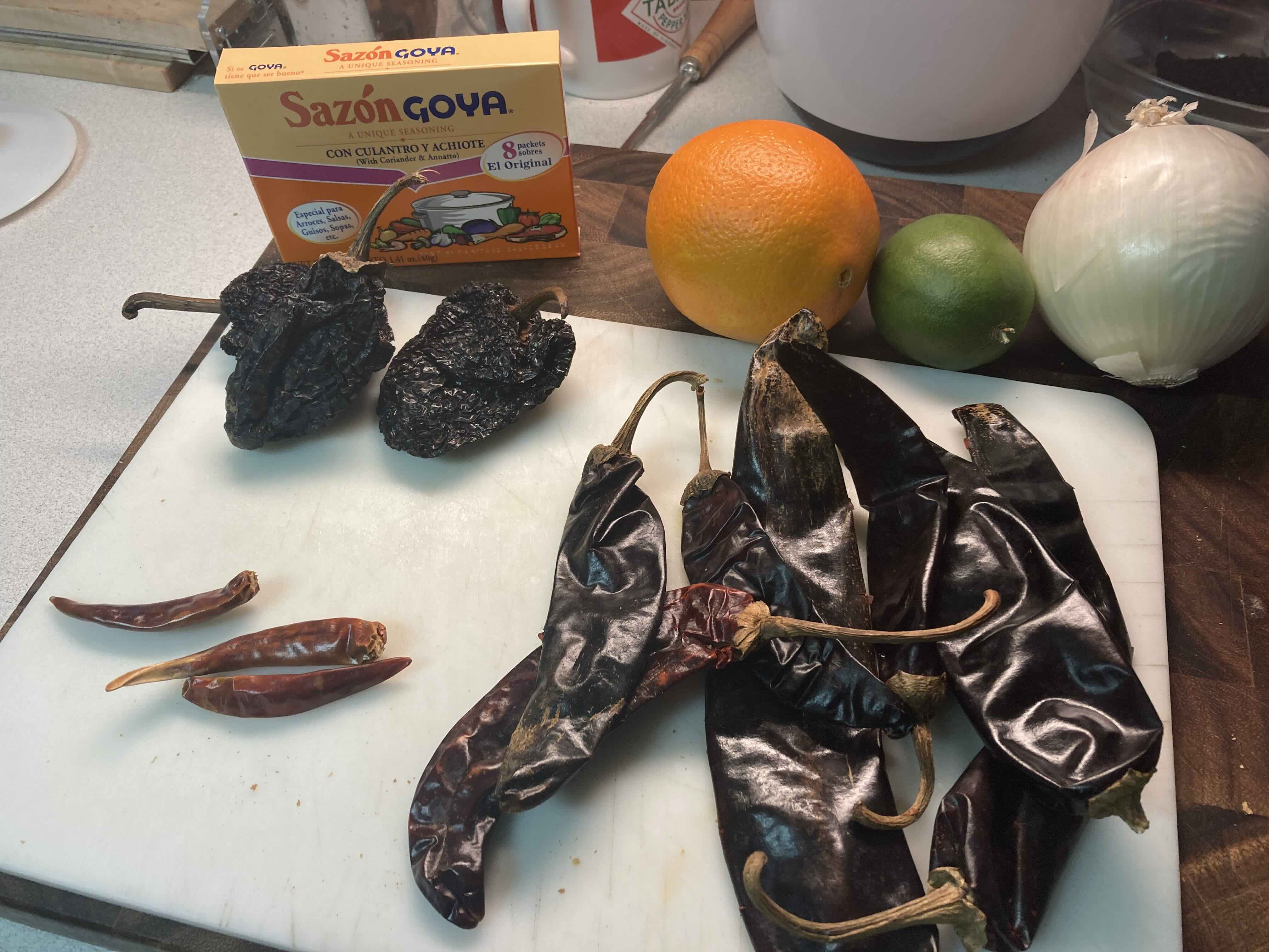 The toasted chiles are cut into pieces and soaked in the blender jar with hot water to cover for 20 minutes or so, then add roasted garlic, vinegar, black pepper, cumin, cinnamon, salt and a half-block of achiote paste.  The box I purchased said "achiote", but it was 8 small envelopes of MSG, salt, and a couple spices for color mostly; threw two of them in since I had them.  Blended up, poured thru a sieve (which I didn't need to do, my new lifetime KitchenAid blender did just as good a job as my old lifetime KA blender, which died and I couldn't get a touchpad for it).