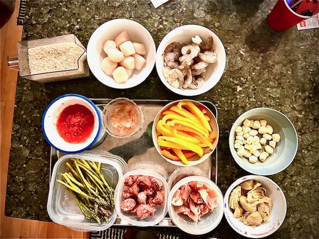 A quick back story: Paella was the cook of choice today. Asked the extended family (older son and wife with 3 granddaughters 2, 4, 6 yo), solo son and SWMBO what they would like: