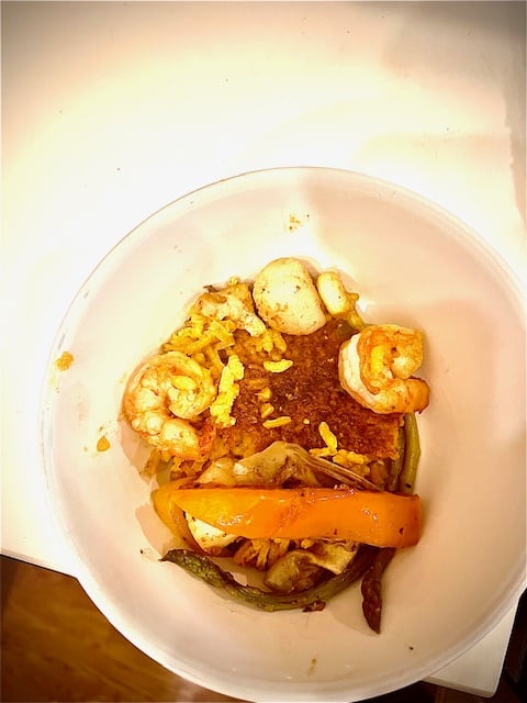 Yep- a boat load of inputs: scallops, shrimp, sausage, chix, lots of veggies and garlic (no vampire action tonight) all beyond the required sofrito ingredients.