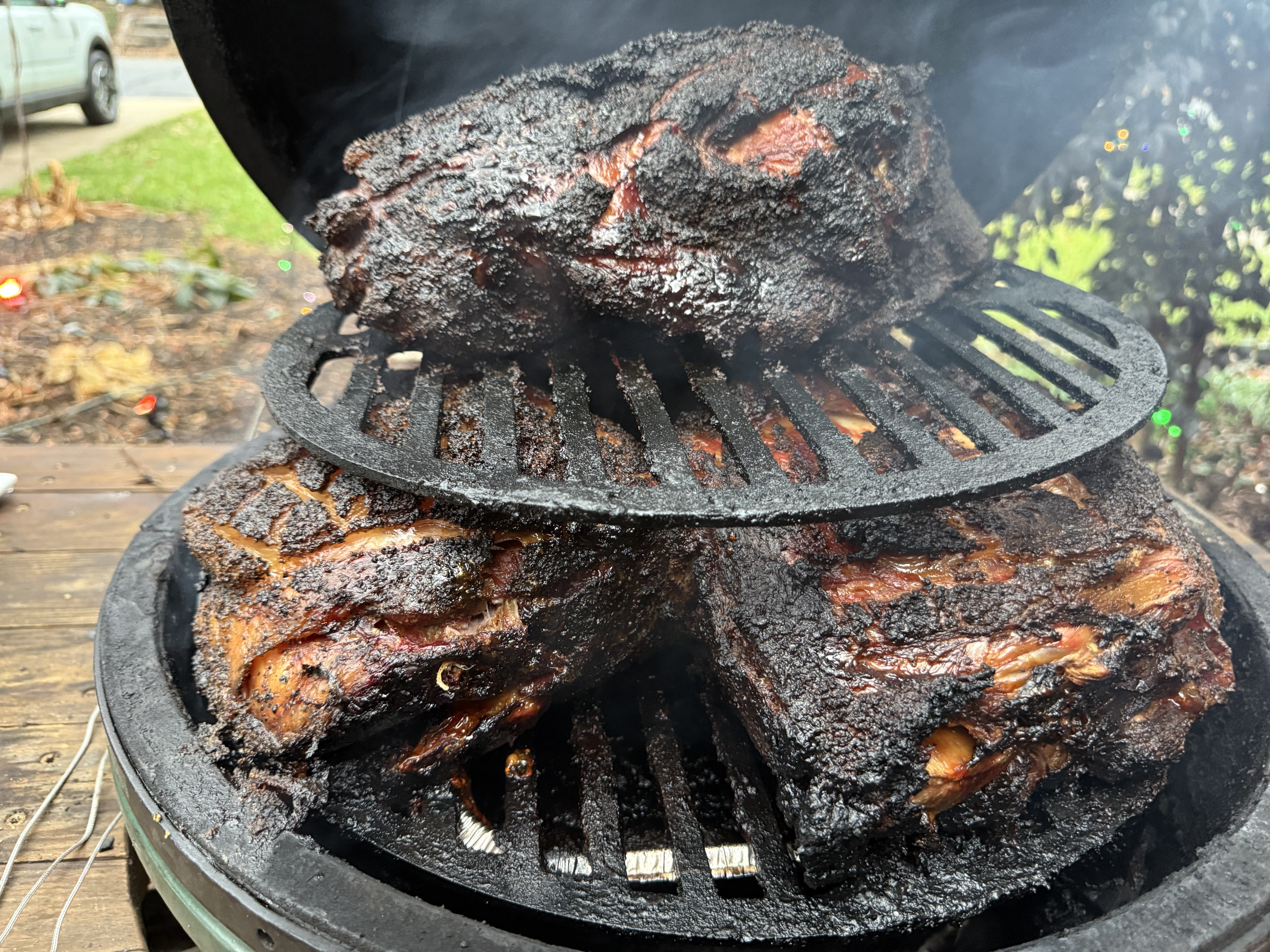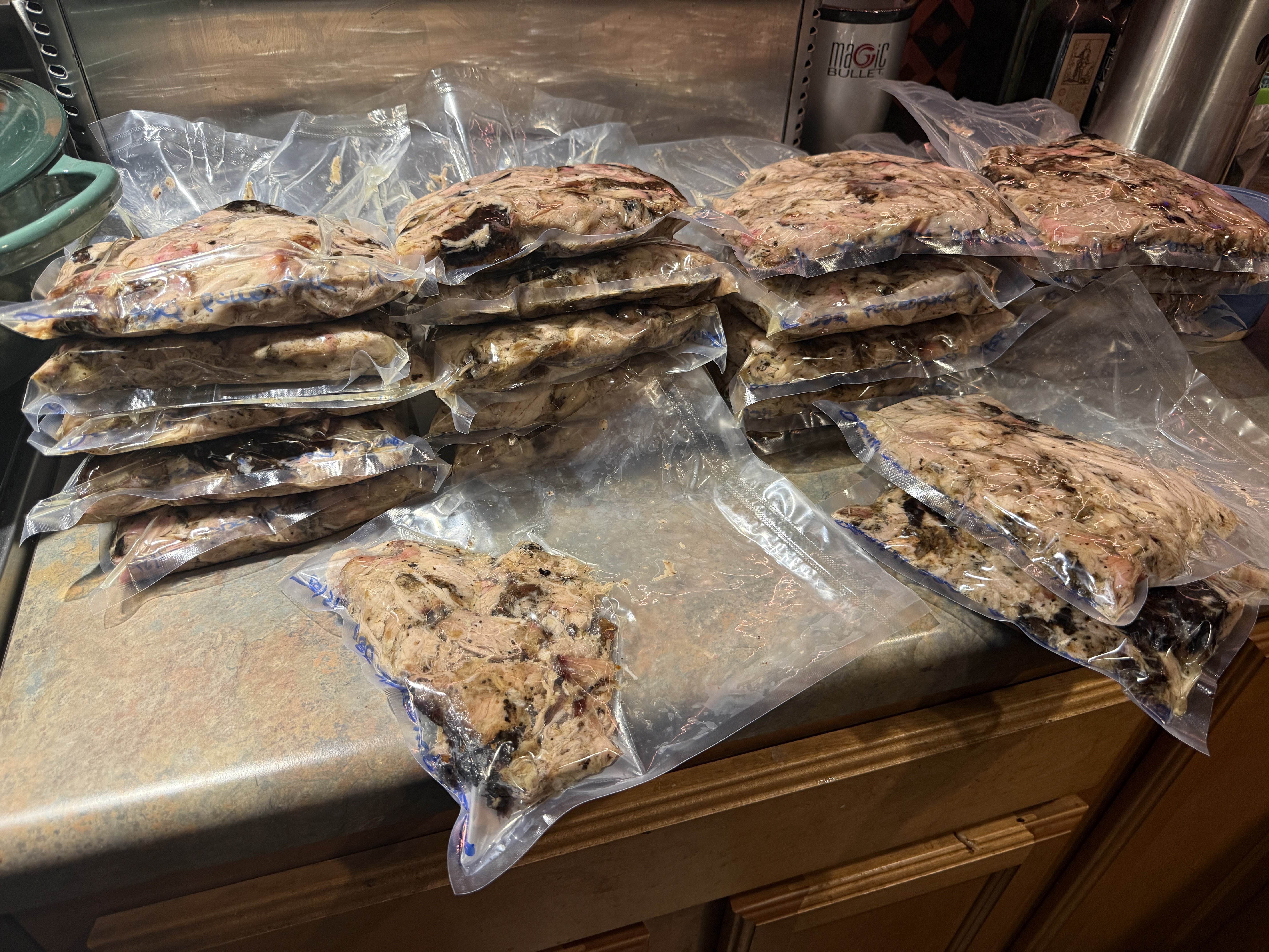 Pulled the bags out and shredded all four butts into one tub. From there, I portioned into one pound vac bags as usual.