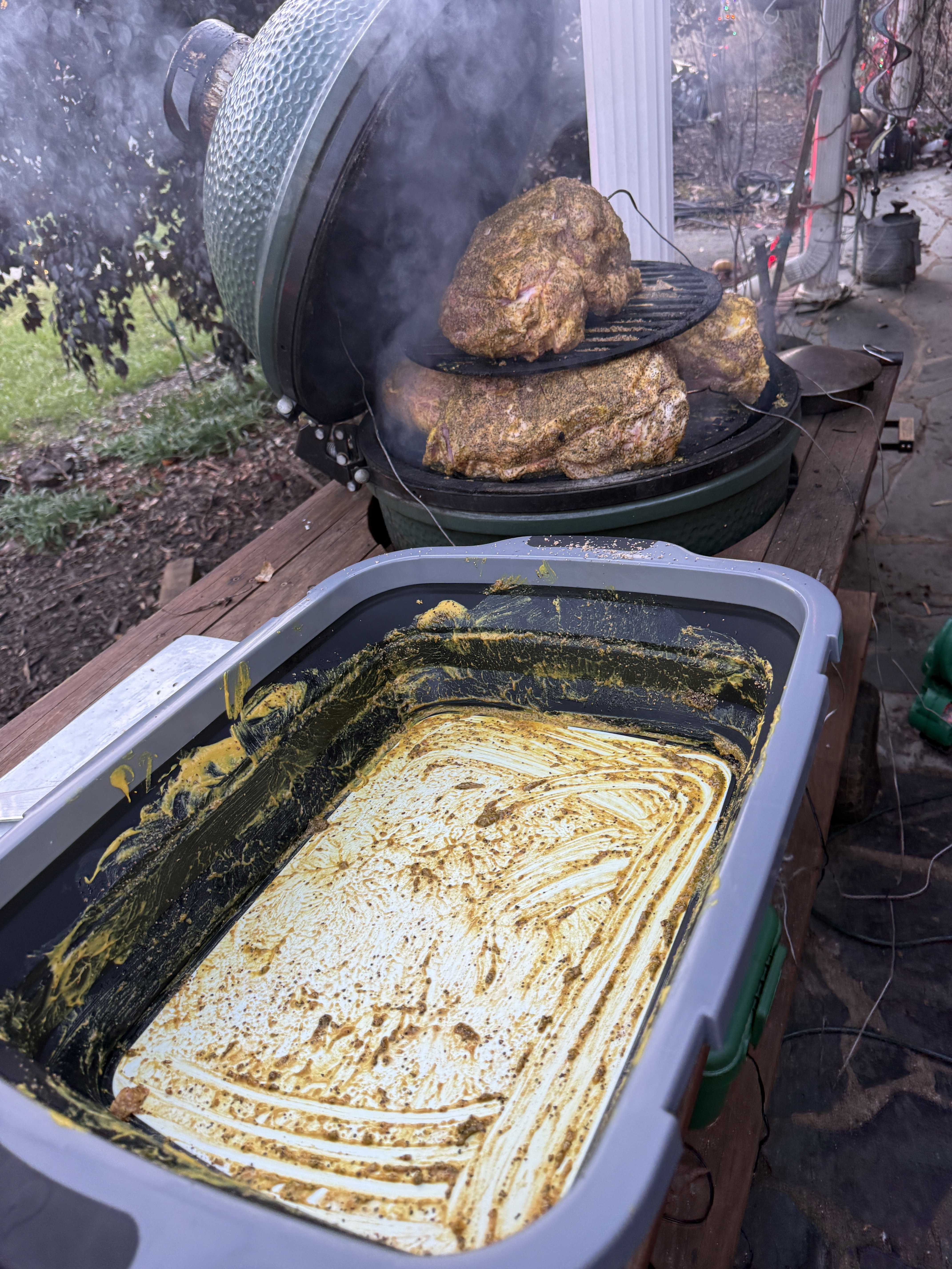 I opened two butts at a time into one tub. Scored, mustard binder and rub, and plonked into the BGE. Wash the tubs and collapse away.