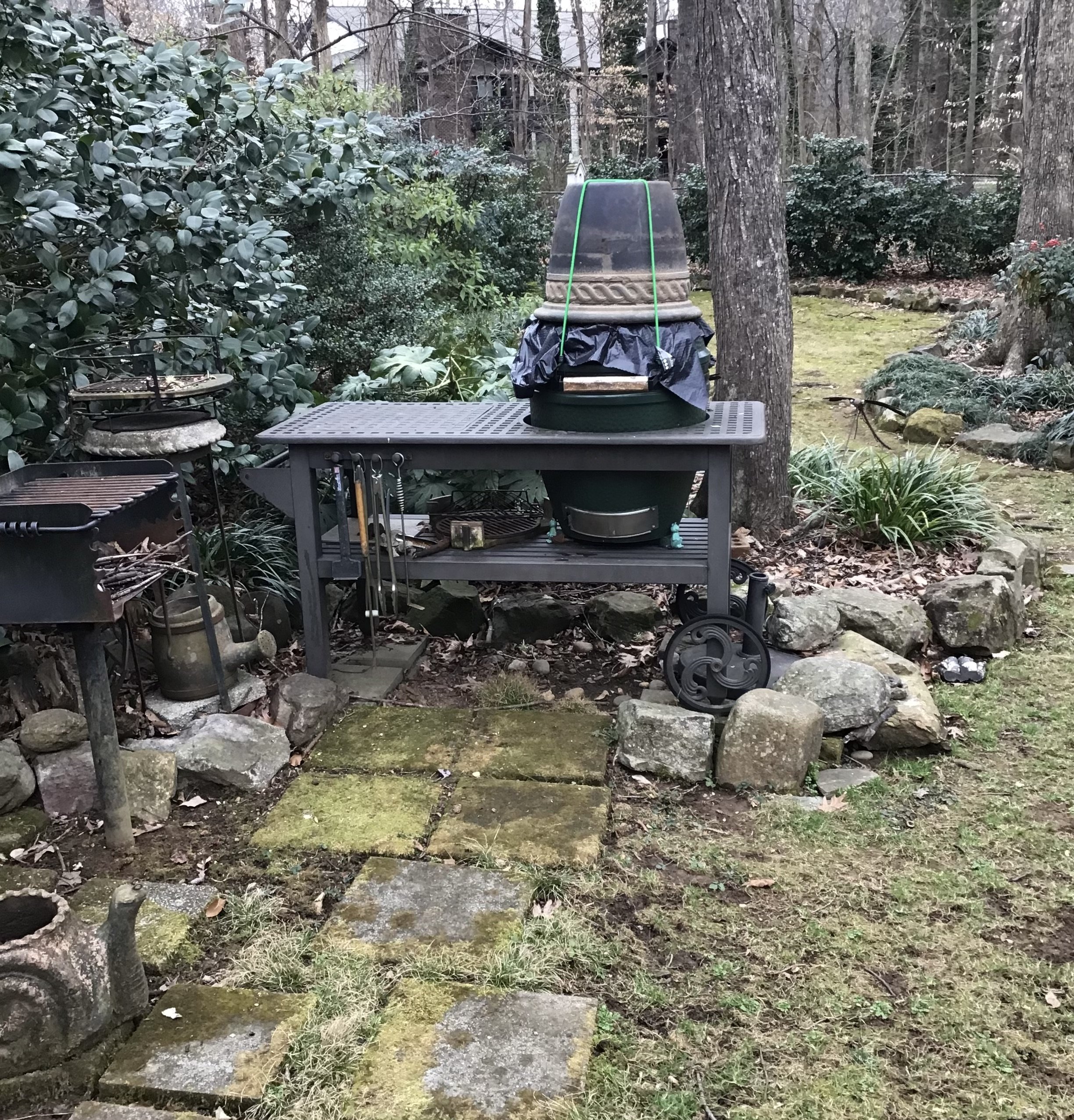 XXL BGE, Karebecue, Klose BYC, Chargiller Akorn Kamado, Weber Smokey Mountain, Grand Turbo gasser, Weber Smoky Joe, and the wheelbarrow that my grandfather used to cook steaks from his cattle