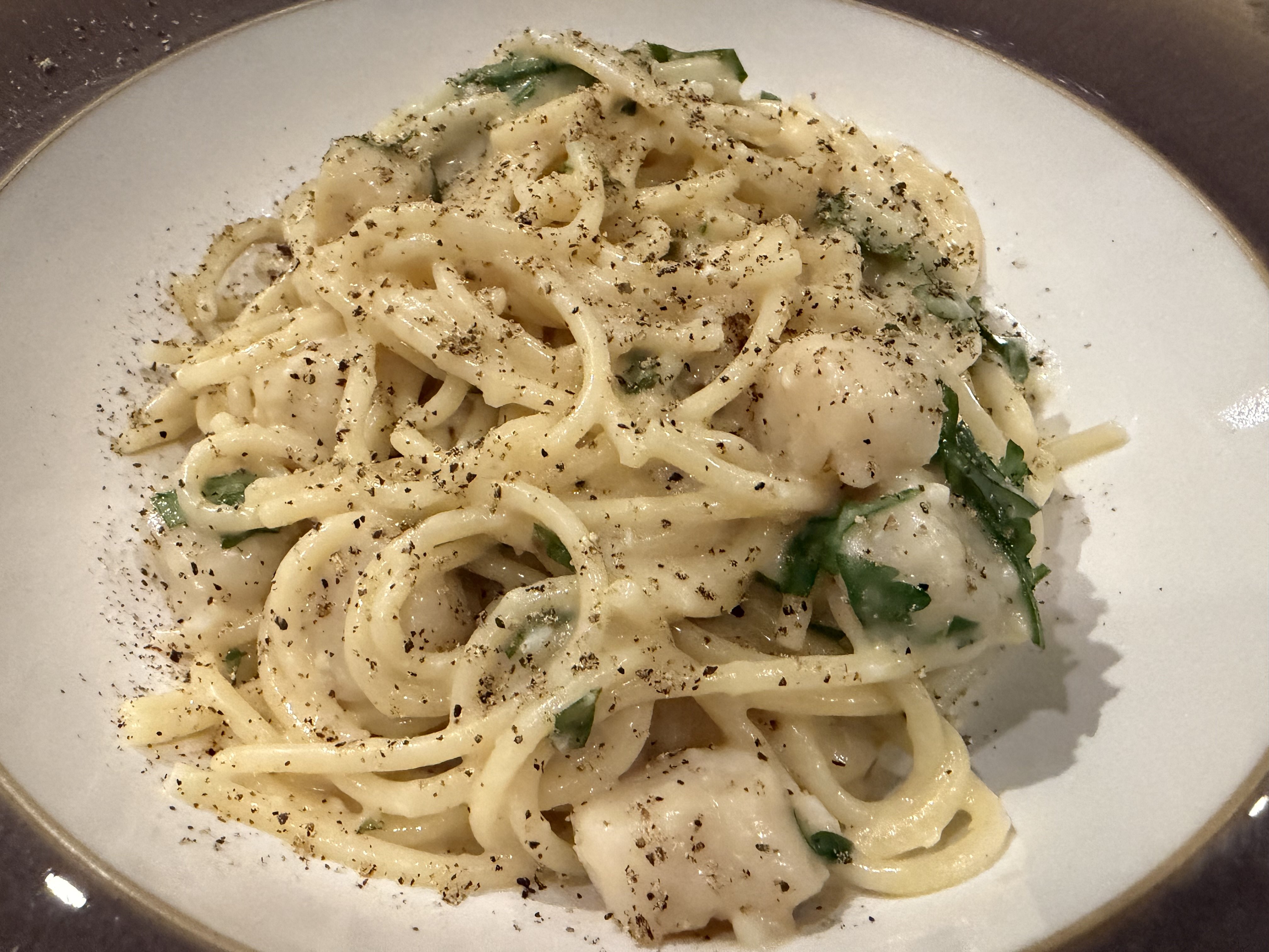 CREAMY GARLIC PASTA WITH PAN SEARED SCALLOPS