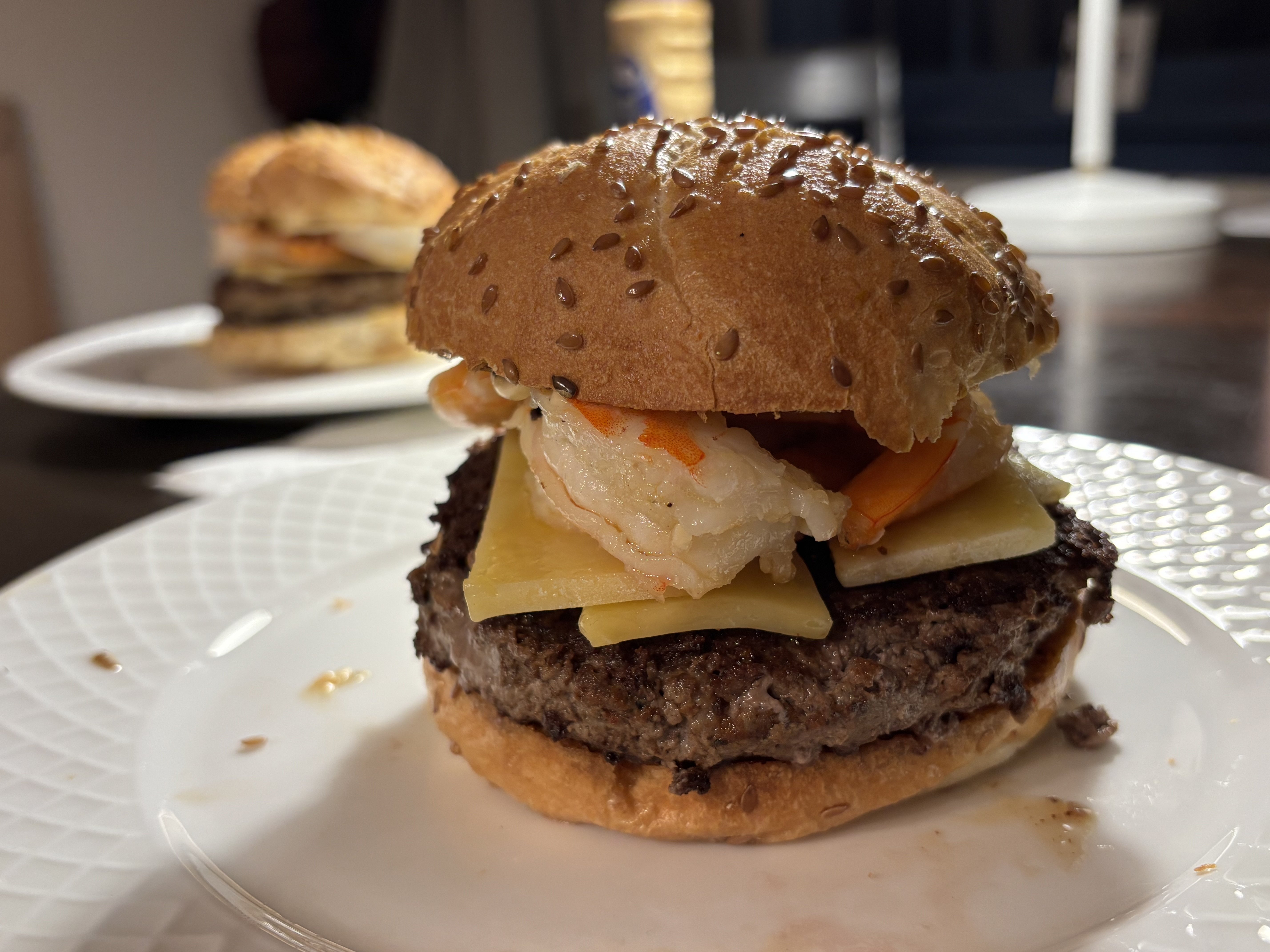 Homemade beef patty (he uses a big round plastic lid from a cookie can to shape those)