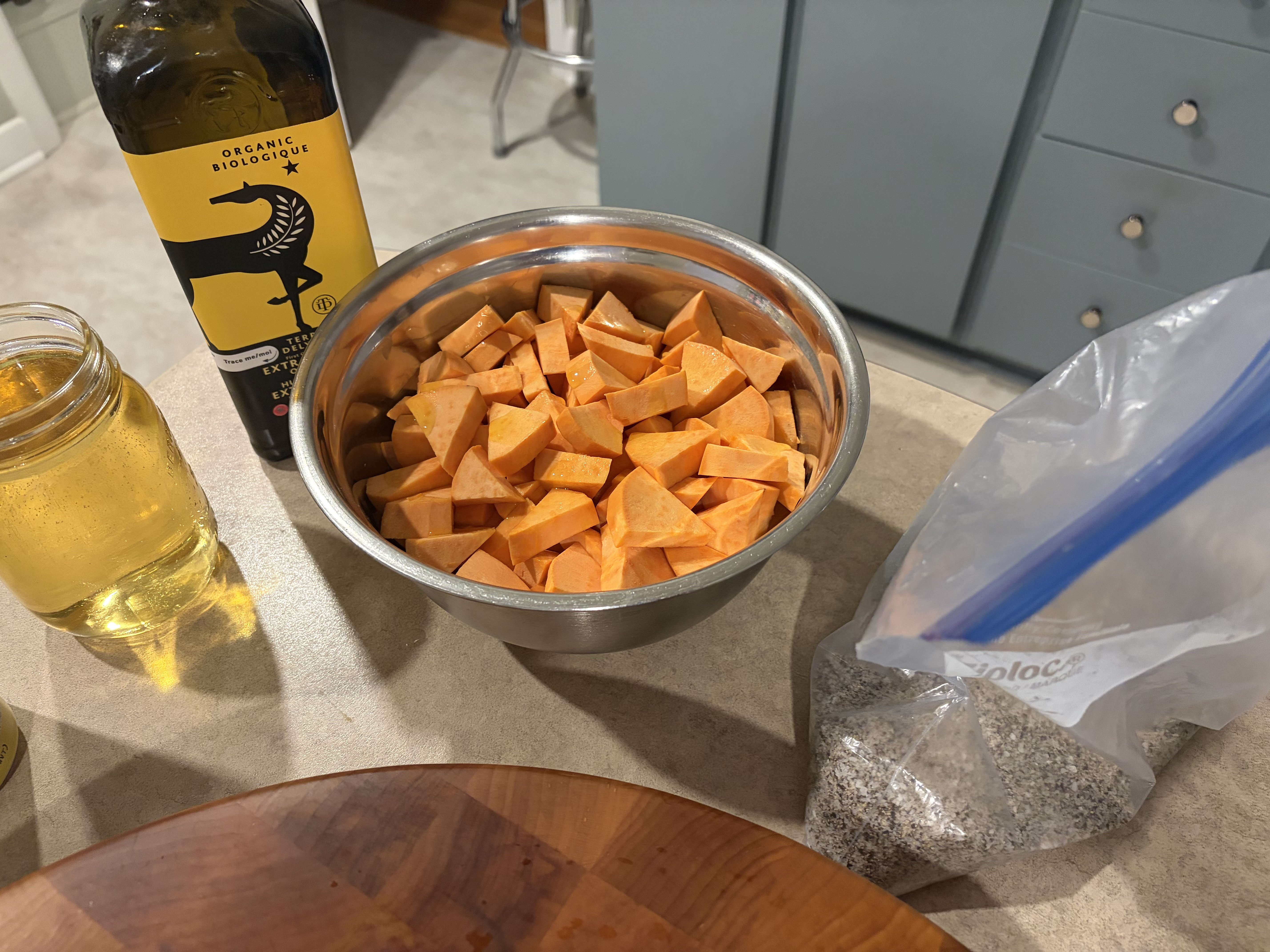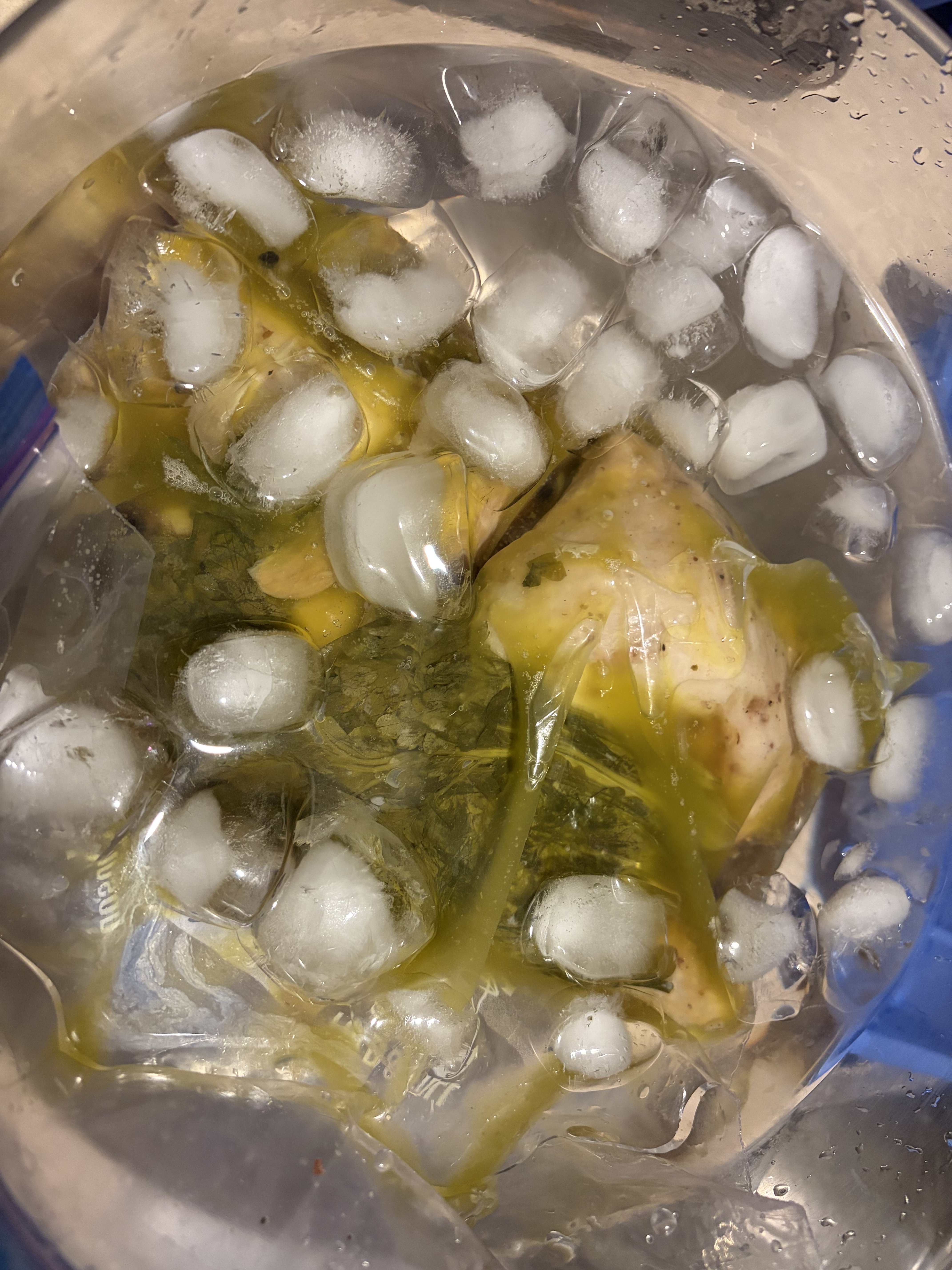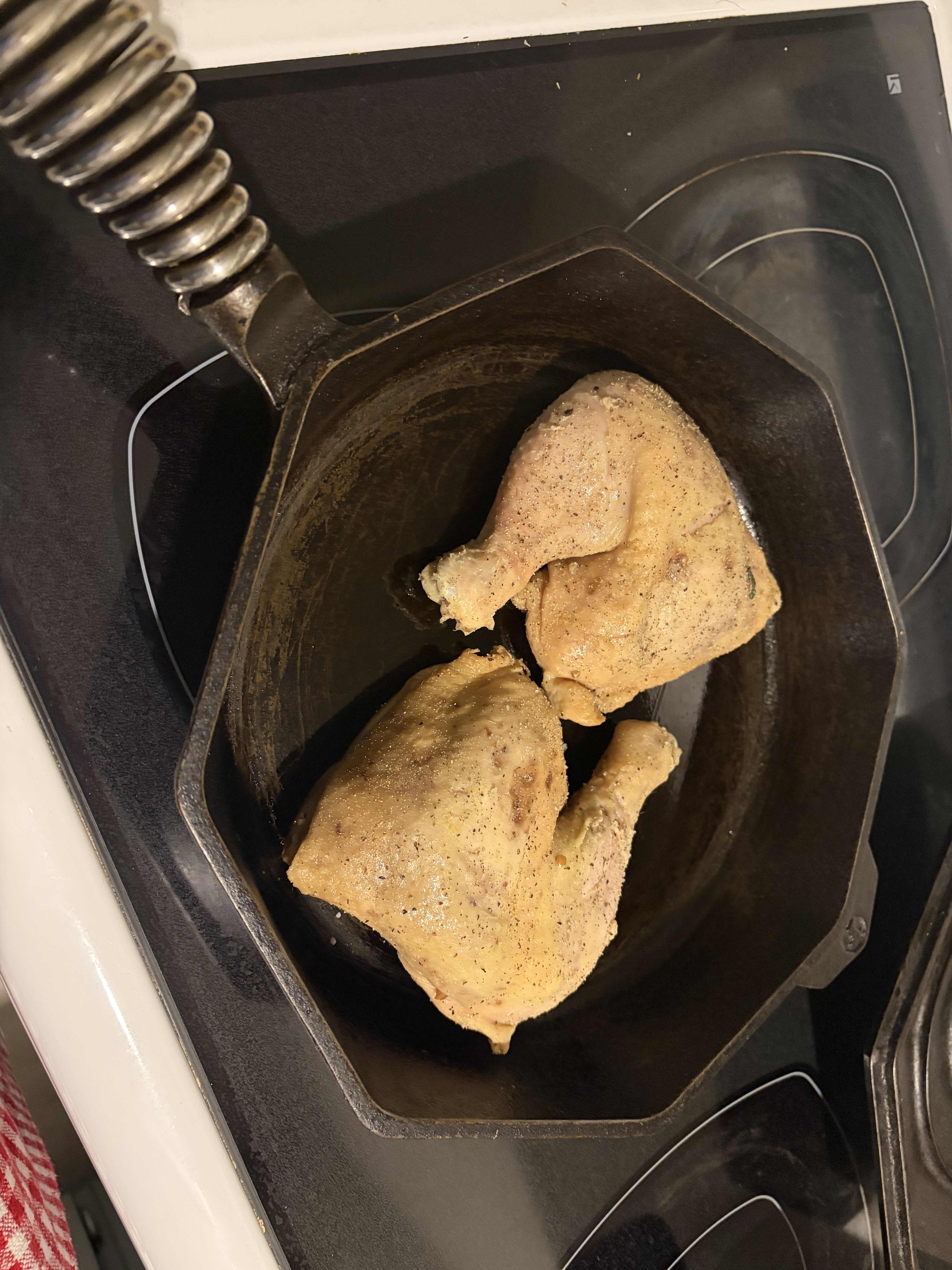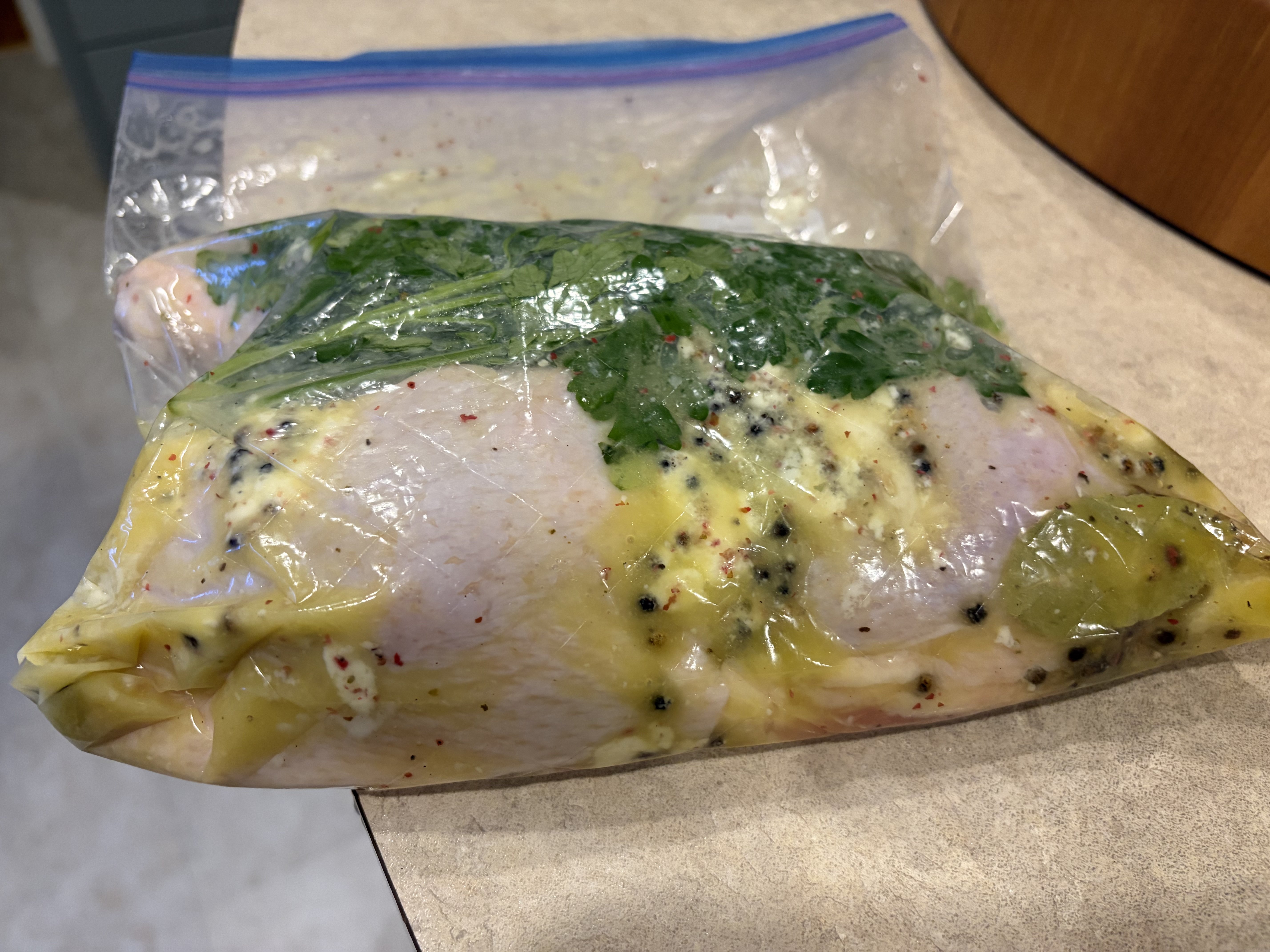 Put the chicken leg quarters in a bag with olive oil, butter, bay leaves, fresh parsley, salt, whole peppercorns, and an obscene amount of smashed garlic. Set it to 165F for eight hours. Once done, hit it with an ice bath and then once cooled, broiled to crisp the skin until golden. Served with sweet potato roasted in olive oil and salt and pepper, and a homemade salad with homemade dressing (olive oil, balsamic, Dijon, maple syrup and salt and pepper). Served with a green tomato chutney I made a while back (hell of a recipe. The tartness was perfect counterpoint to the rich chicken).