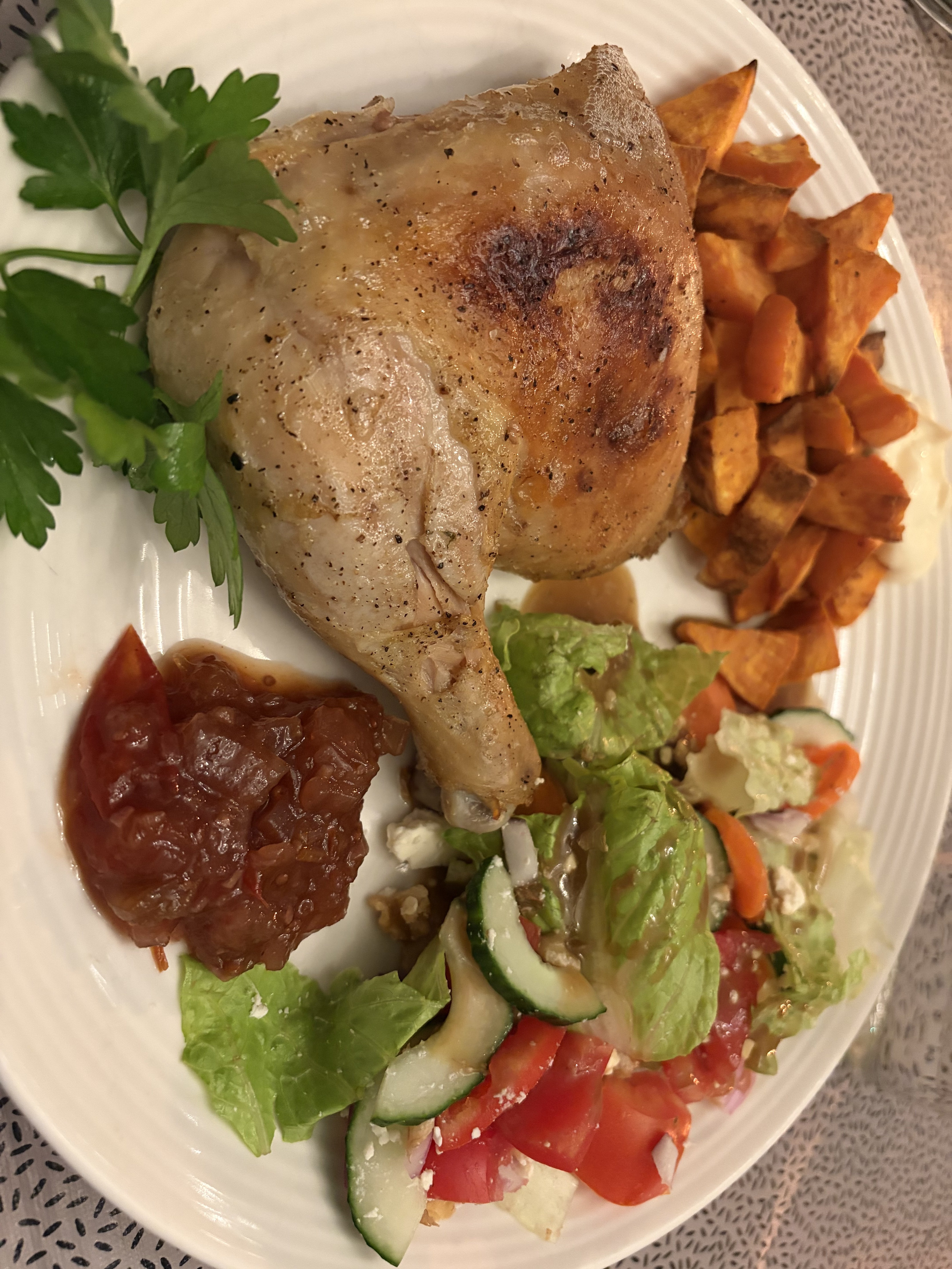 Chicken Confit, Roasted Sweet Potato, Salad and Green Tomato Chutney