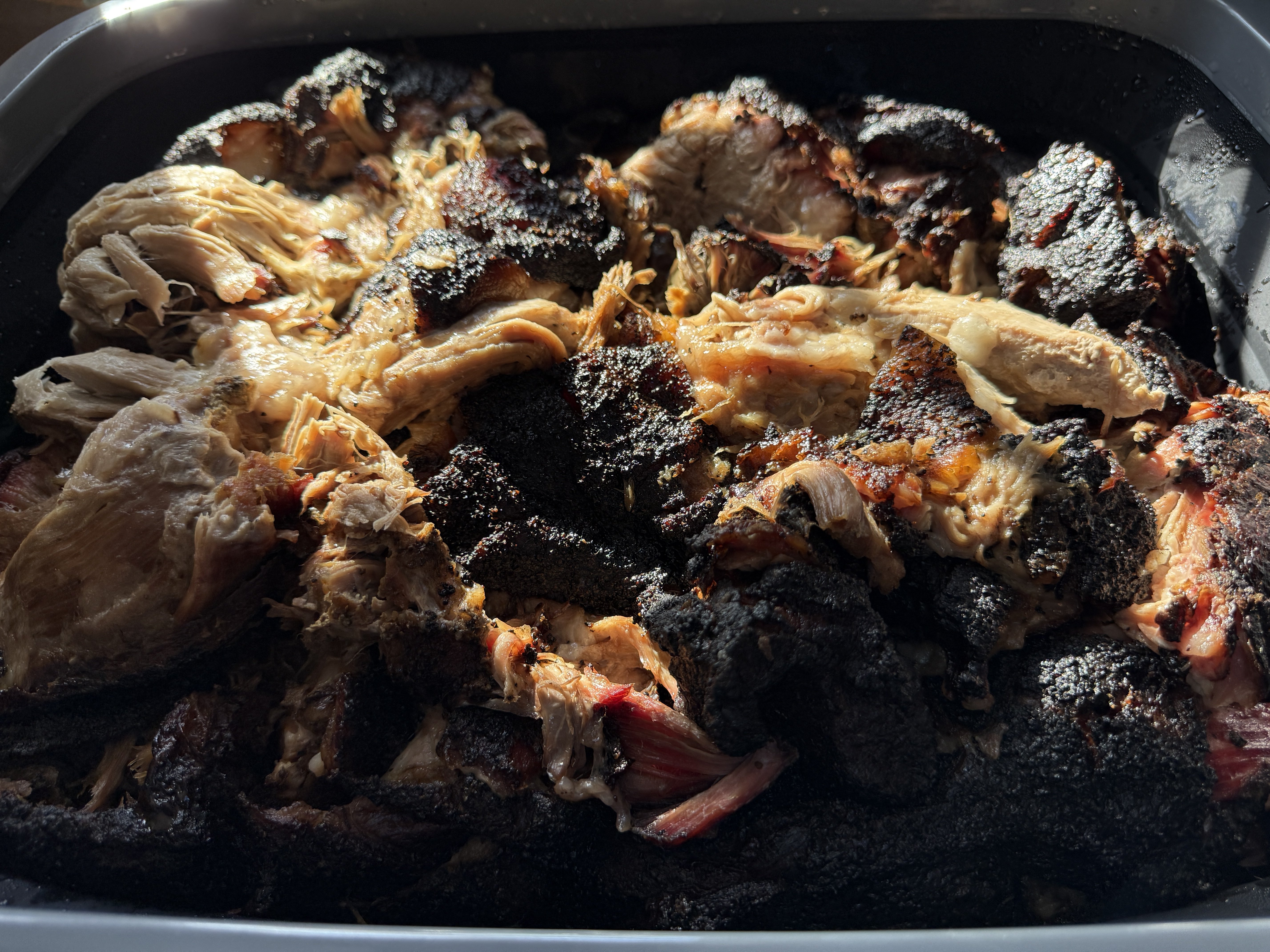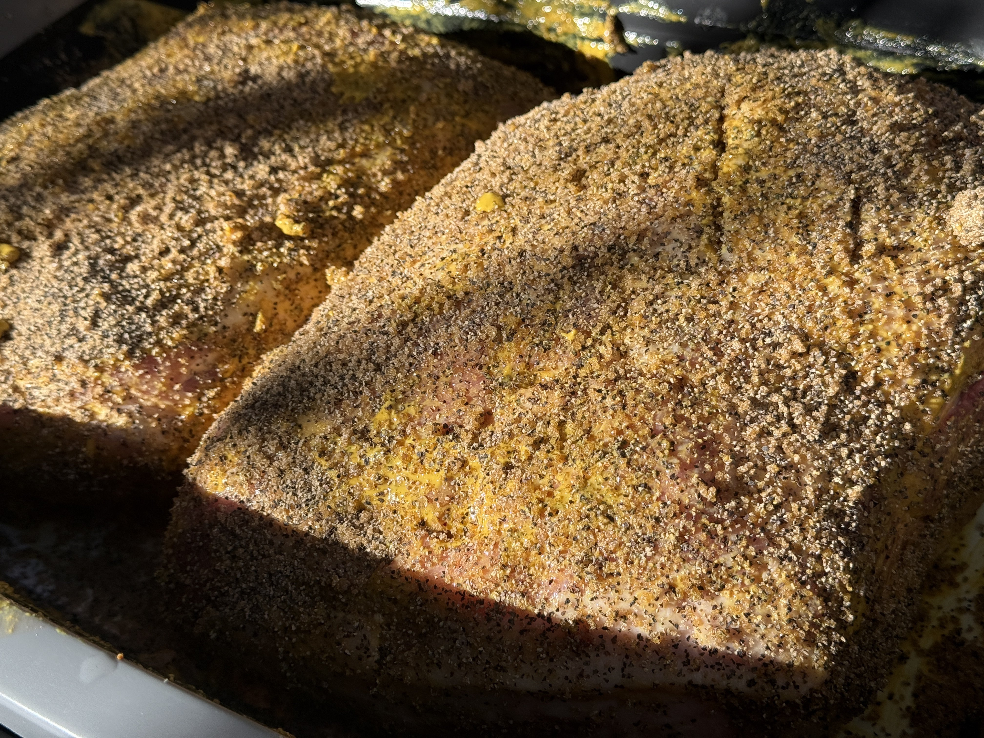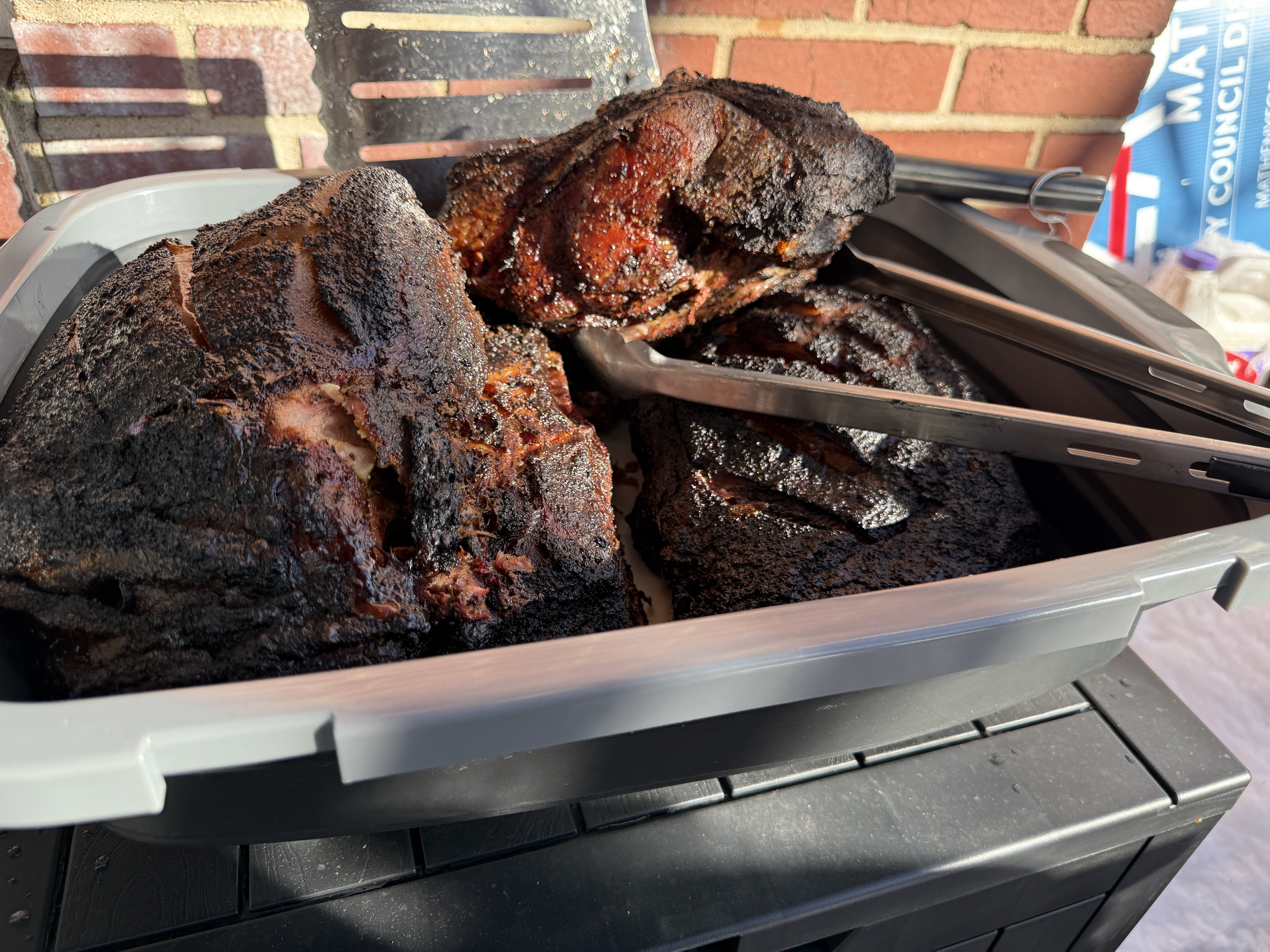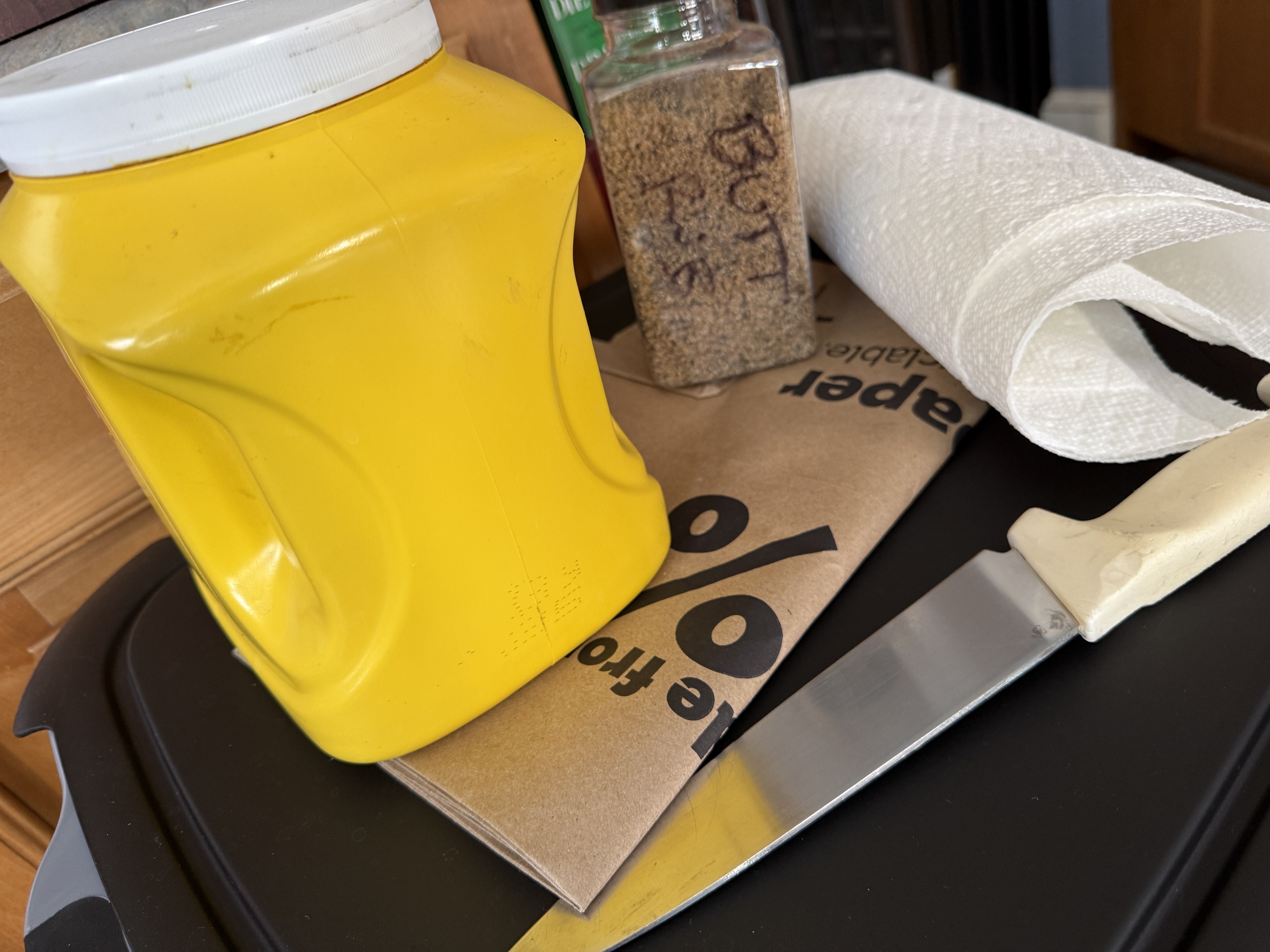 Yellow Mustard binder, Damien Butt Rub, prepped Eggside in the DripEZ collapsible tub. All four fit in there with the Ceramic Grill Works carbon steel dual level swing grate.