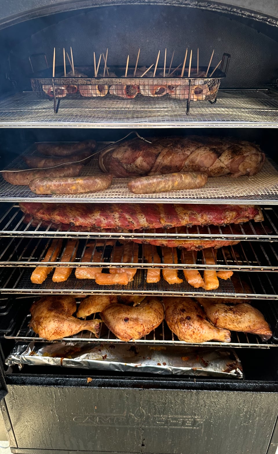 People do not complain about the food that comes out of the pellet grill…. That bacon weave covered fatty on the second shelf from the top is loaded with sausage and filled with jalapeno poppersJohnInCarolina said:I think I want to come to a football party at your house! -