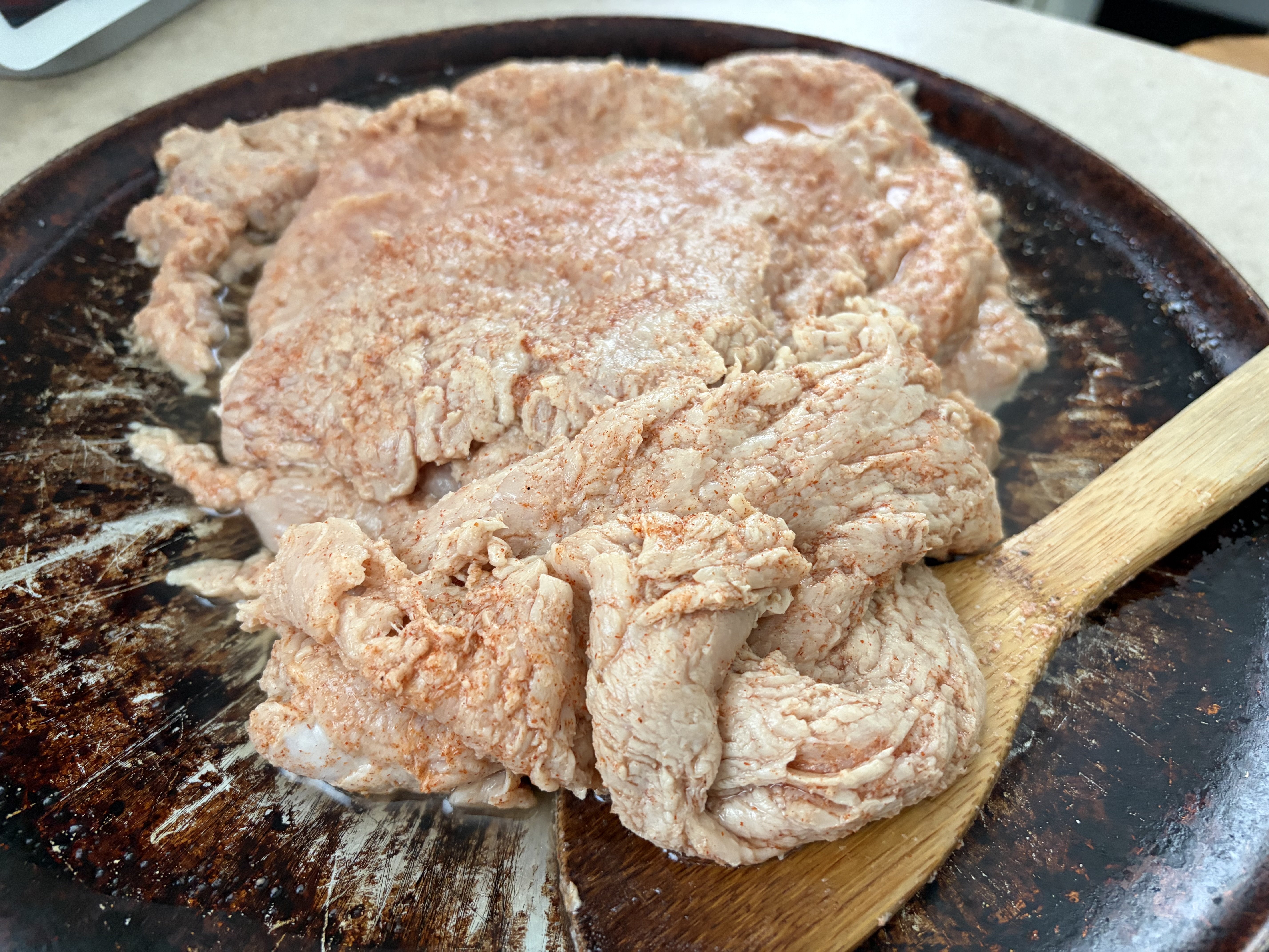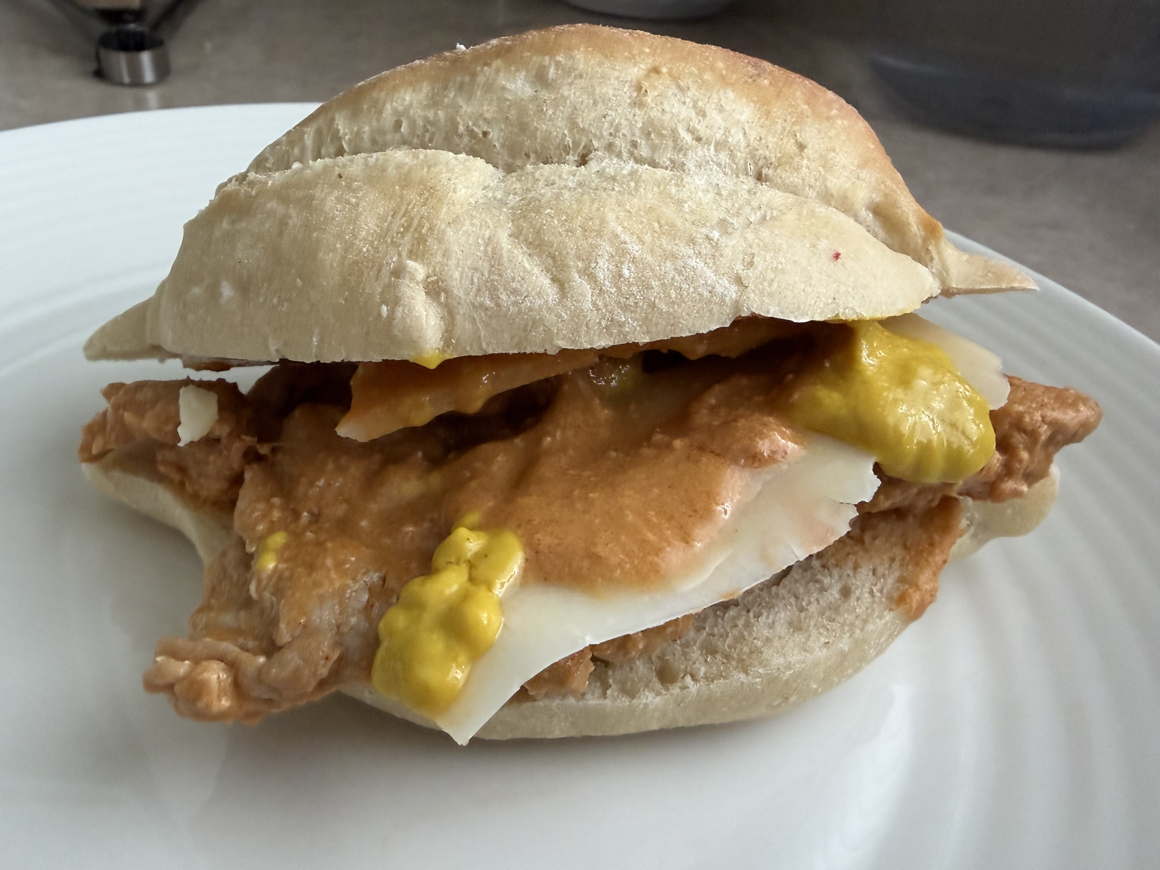 I asked my wife to make homemade Portuguese buns and set to work on flattening some pork loin before making the aromatic marinade and letting it sit. Then browned the pork before reducing the marinade. Heated it all up and made the sandwiches before topping them with sharp cheddar and mustard for some added flavour and texture.